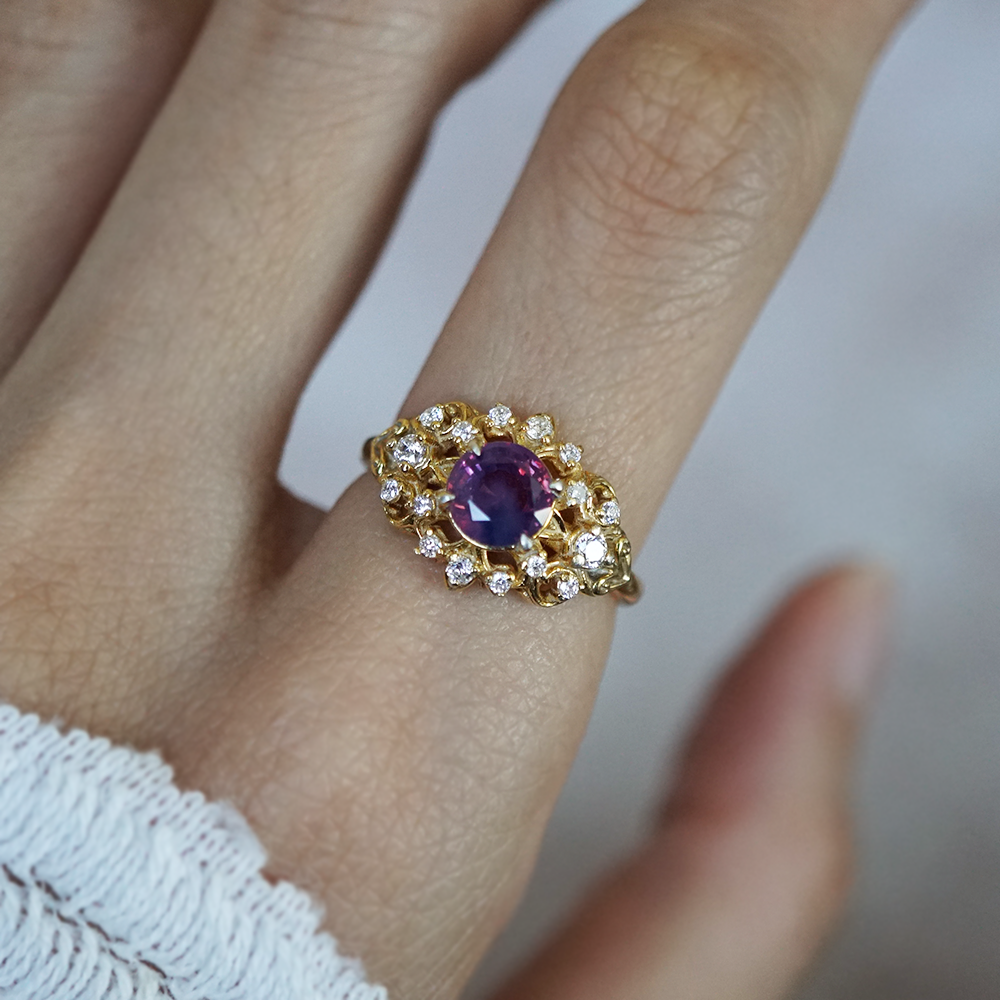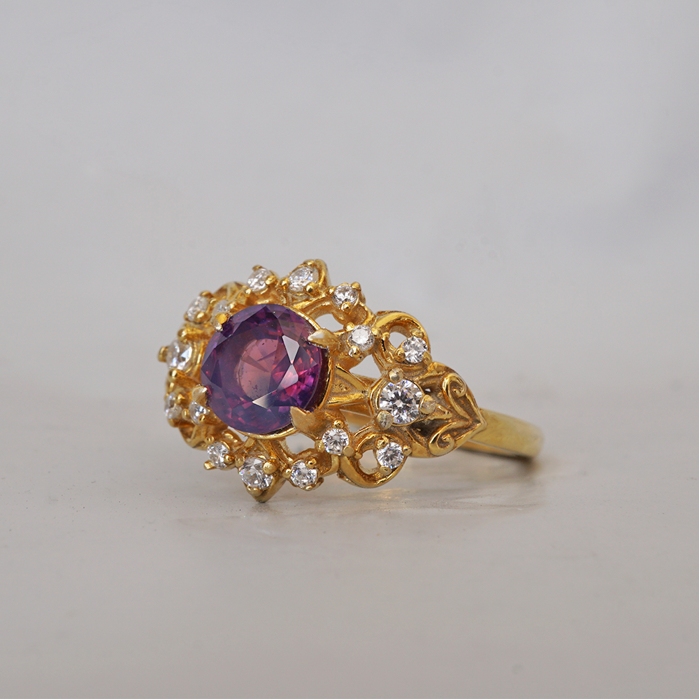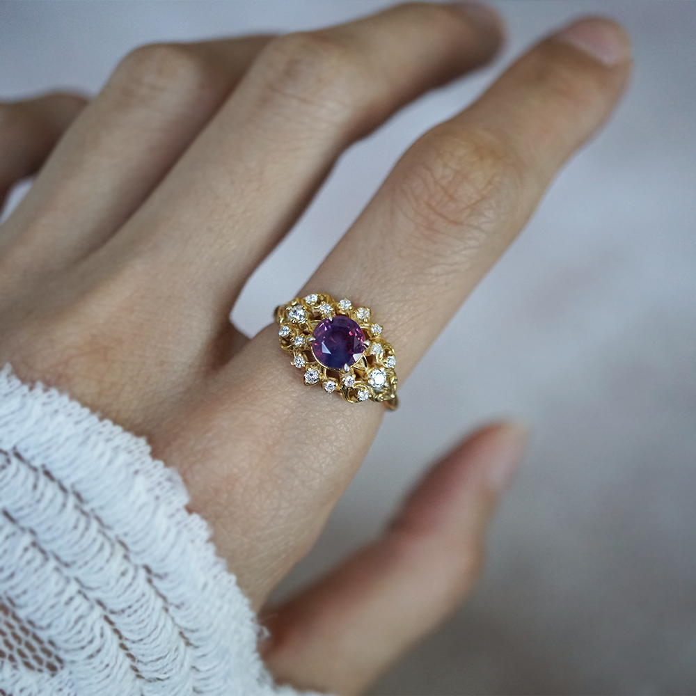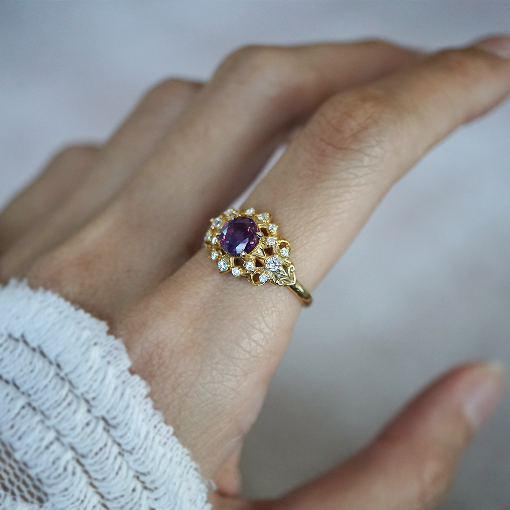 Step into the world of enigma and elegance with the Mystique Ring, a captivating creation that radiates timeless allure. At its heart glows a silky pink-purple sapphire, its hues shifting like twilight skies — from soft rose to deep violet.