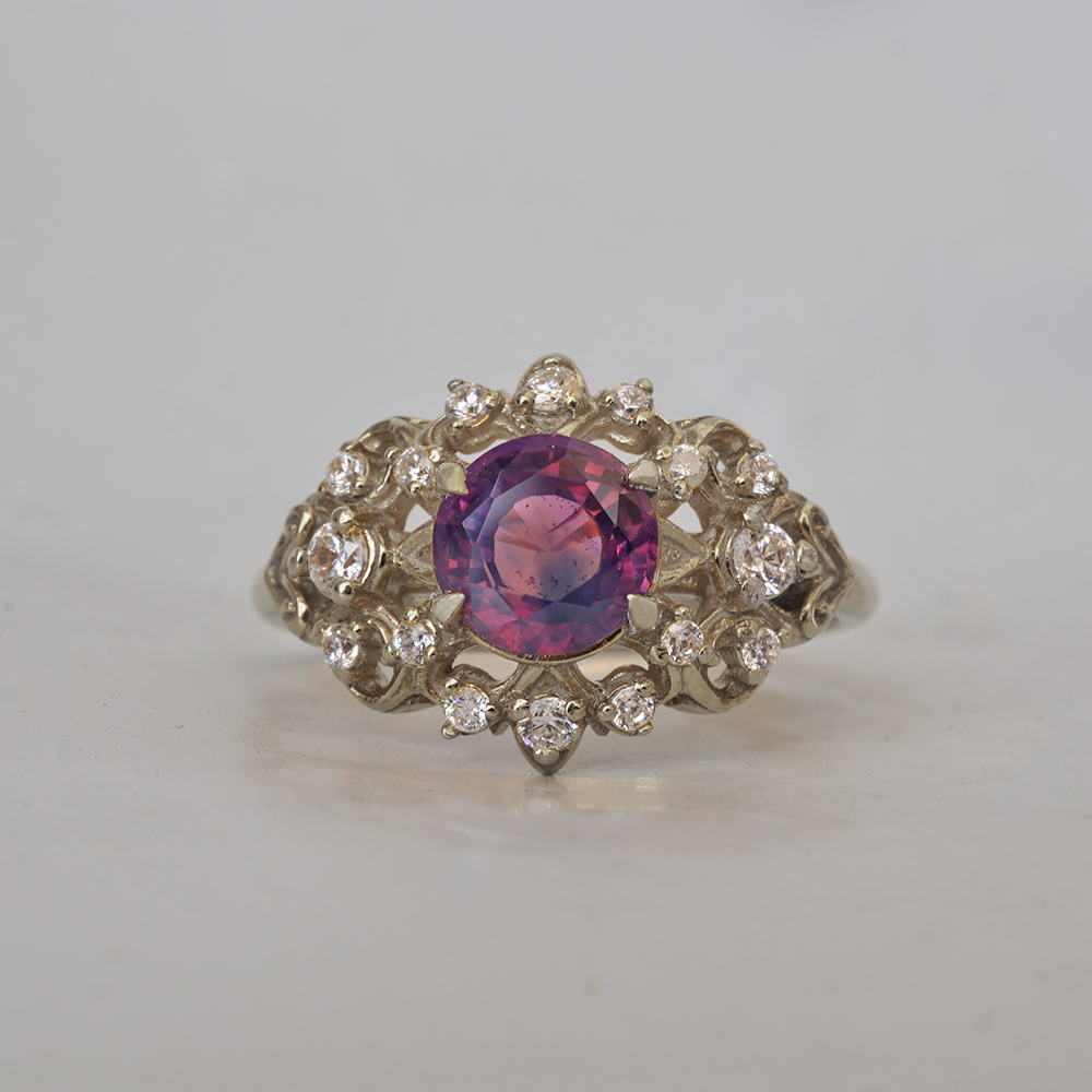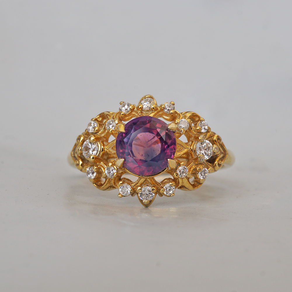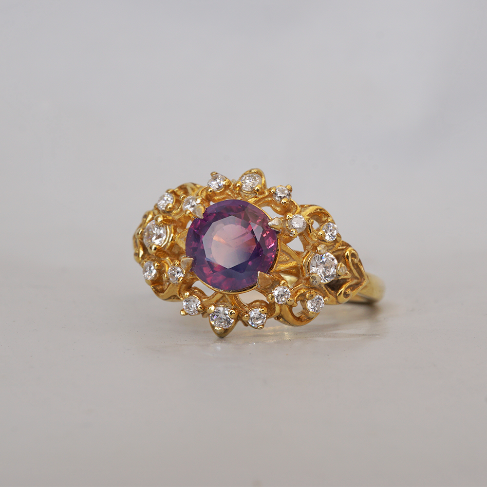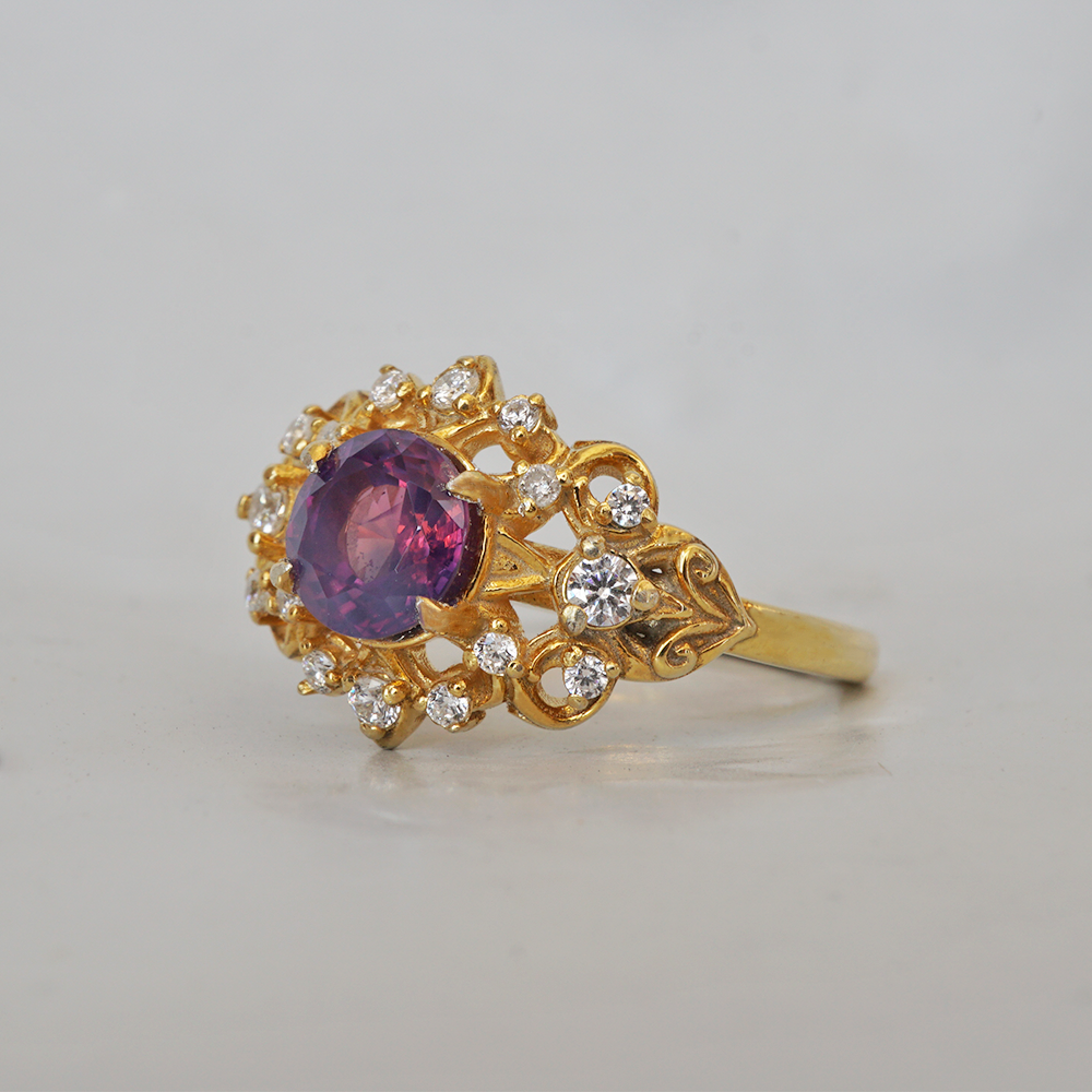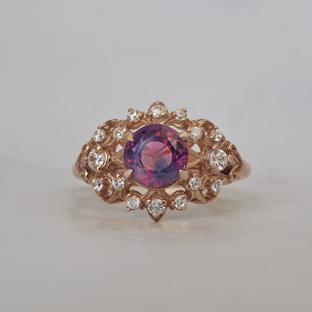 Step into the world of enigma and elegance with the Mystique Ring, a captivating creation that radiates timeless allure. At its heart glows a silky pink-purple sapphire, its hues shifting like twilight skies — from soft rose to deep violet.