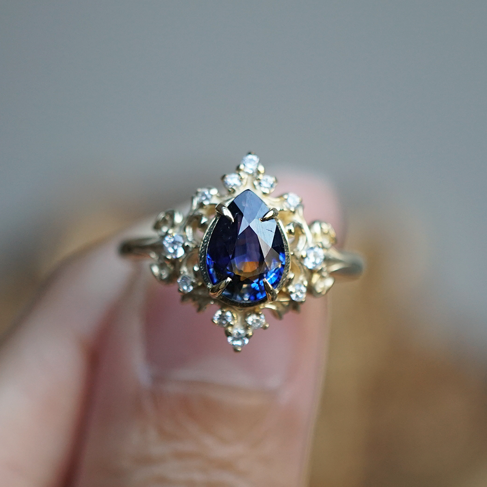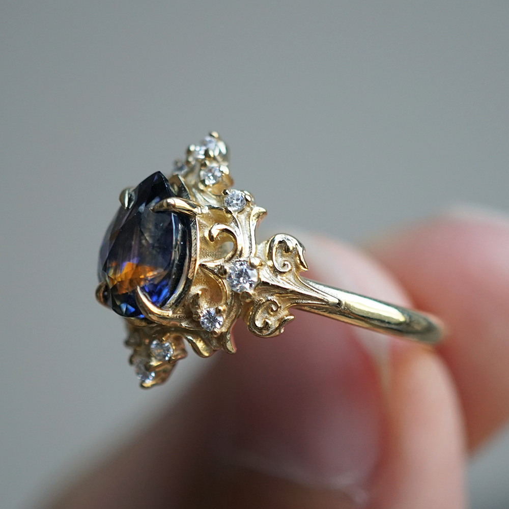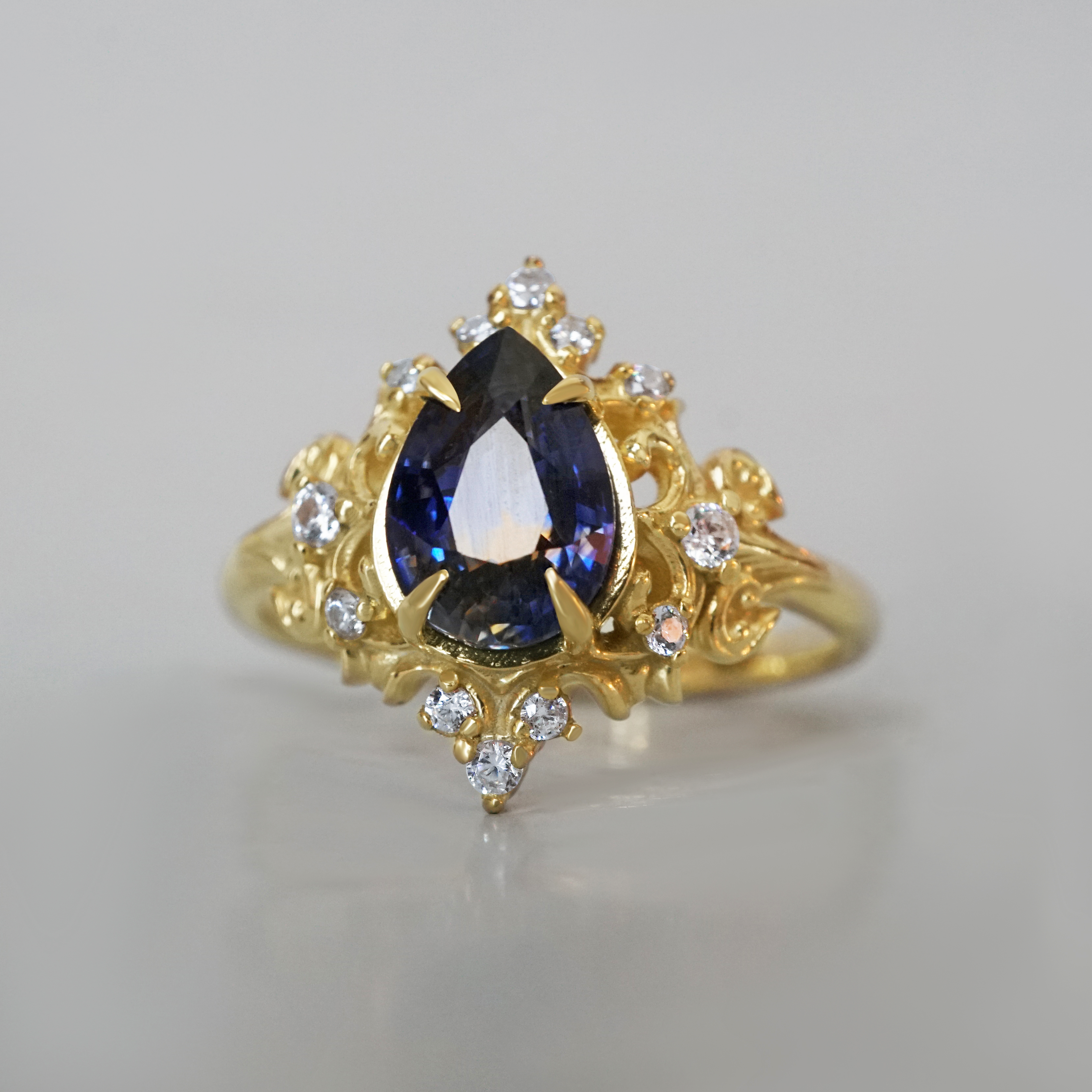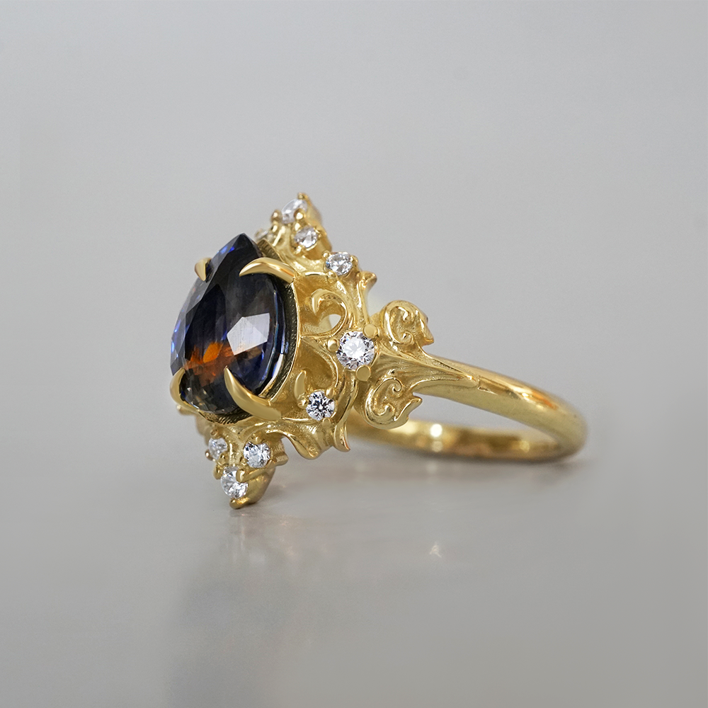 At its heart, a pear-cut bicolor sapphire glows with the colors of night and fire—deep indigo fading to ember—set within golden scrollwork that feels pulled from a forgotten myth. Diamonds scatter around it like stars breaking through dusk, illuminating every curve with a quiet, radiant grace.
