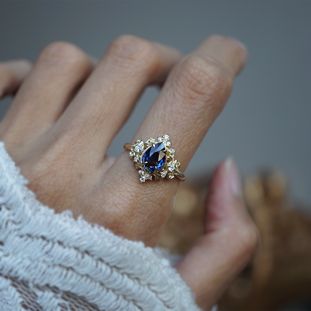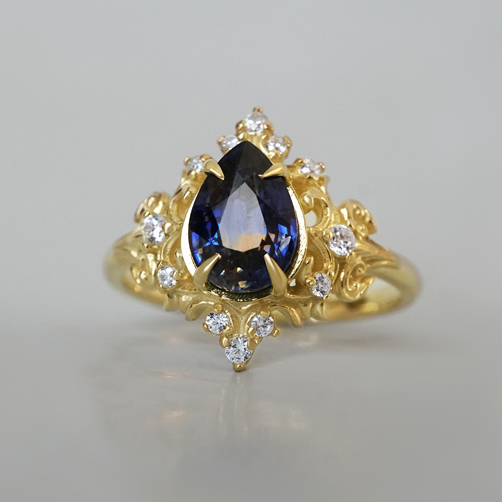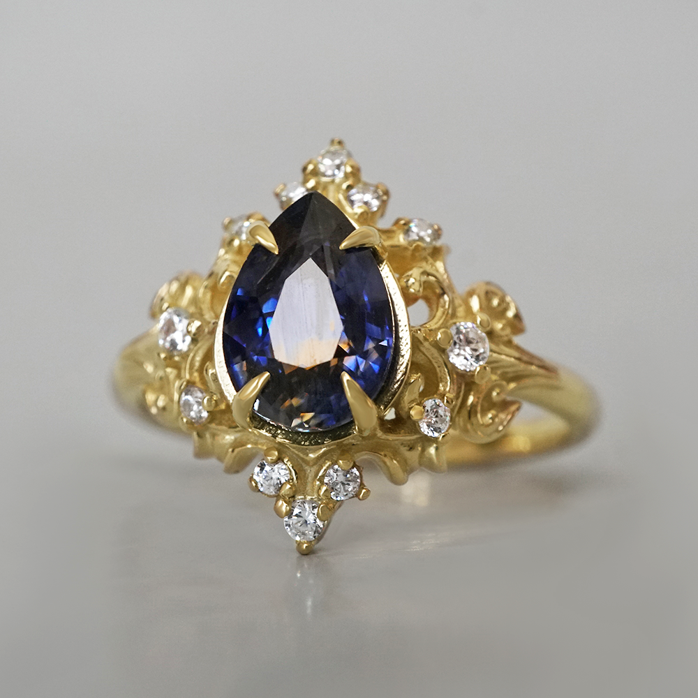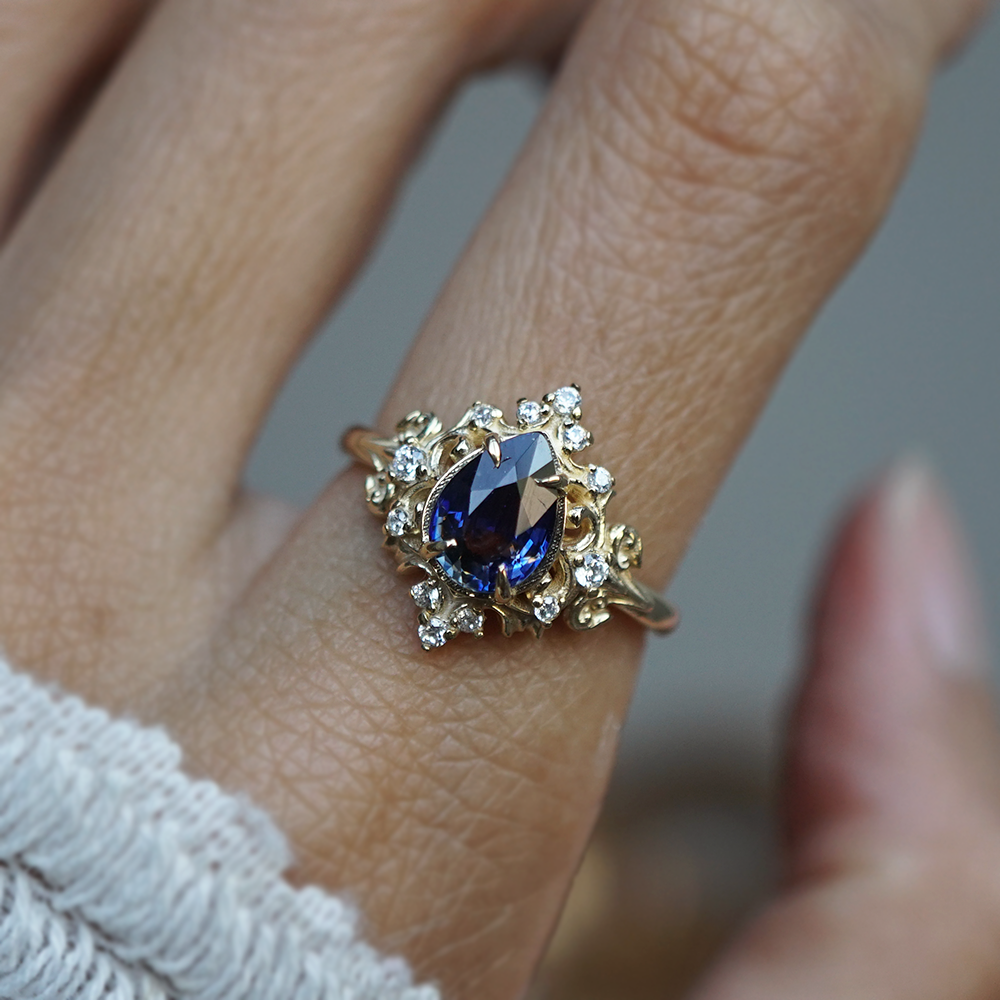 At its heart, a pear-cut bicolor sapphire glows with the colors of night and fire—deep indigo fading to ember—set within golden scrollwork that feels pulled from a forgotten myth. Diamonds scatter around it like stars breaking through dusk, illuminating every curve with a quiet, radiant grace.
