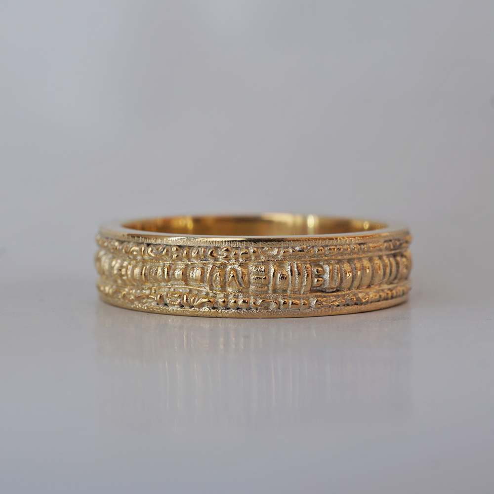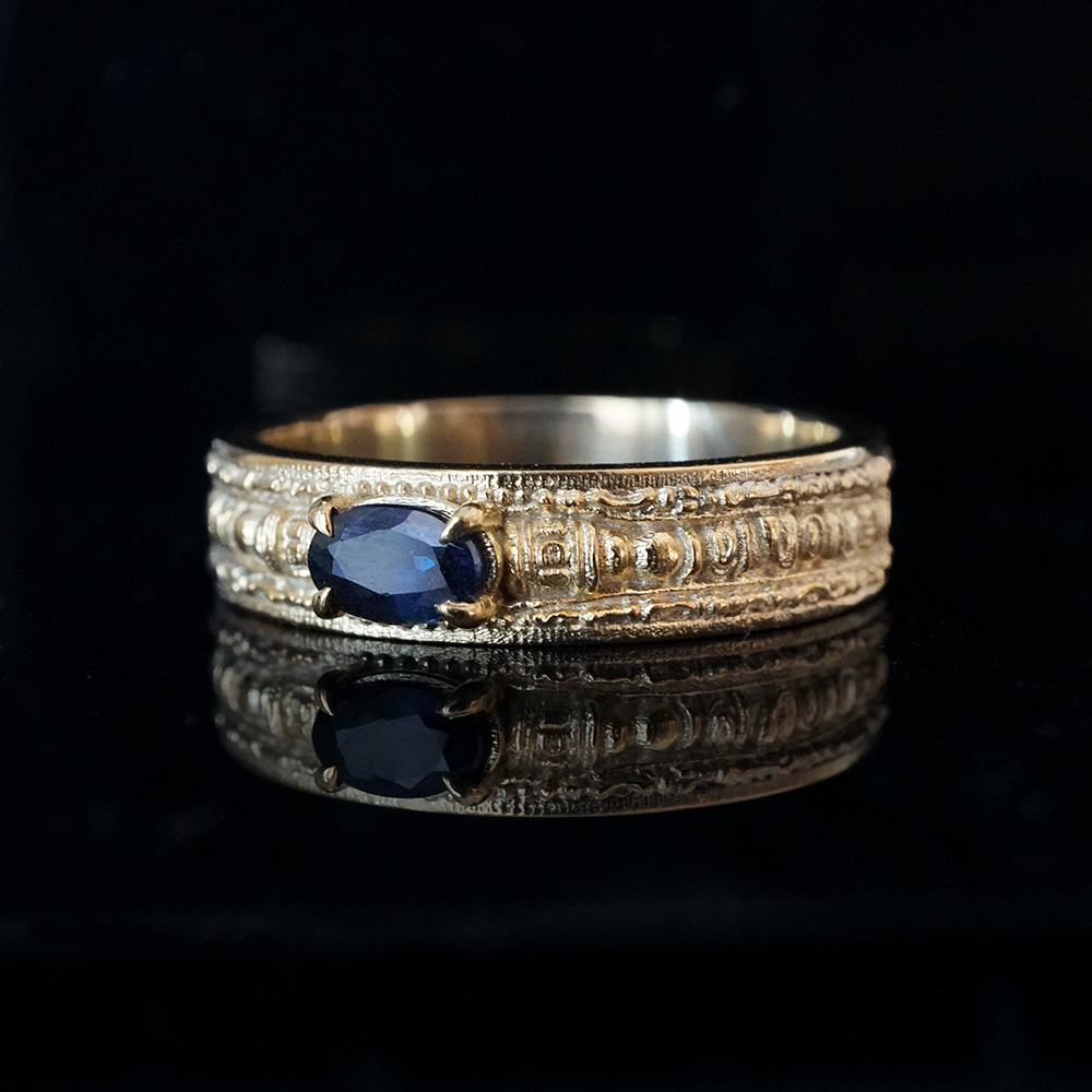 At its center gleams a majestic natural blue sapphire, reminiscent of the deep azure hues of the Nile River as it winds its way through the Egyptian landscape where the Pharoahs once walked. Set against a backdrop of rich, textured metal, the sapphire exudes an aura of power and mystique, capturing the essence of the majestic Egyptian wilderness. The design of this ring draws inspiration from the rugged landscapes and intricate patterns found in the desert sands and rocky pyramids of Egypt. Each detail is meticulously crafted to evoke the raw beauty of nature, from the subtle texture of the metal to the organic shapes that adorn the band. Handcrafted in your choice of 14K or 18K solid gold.