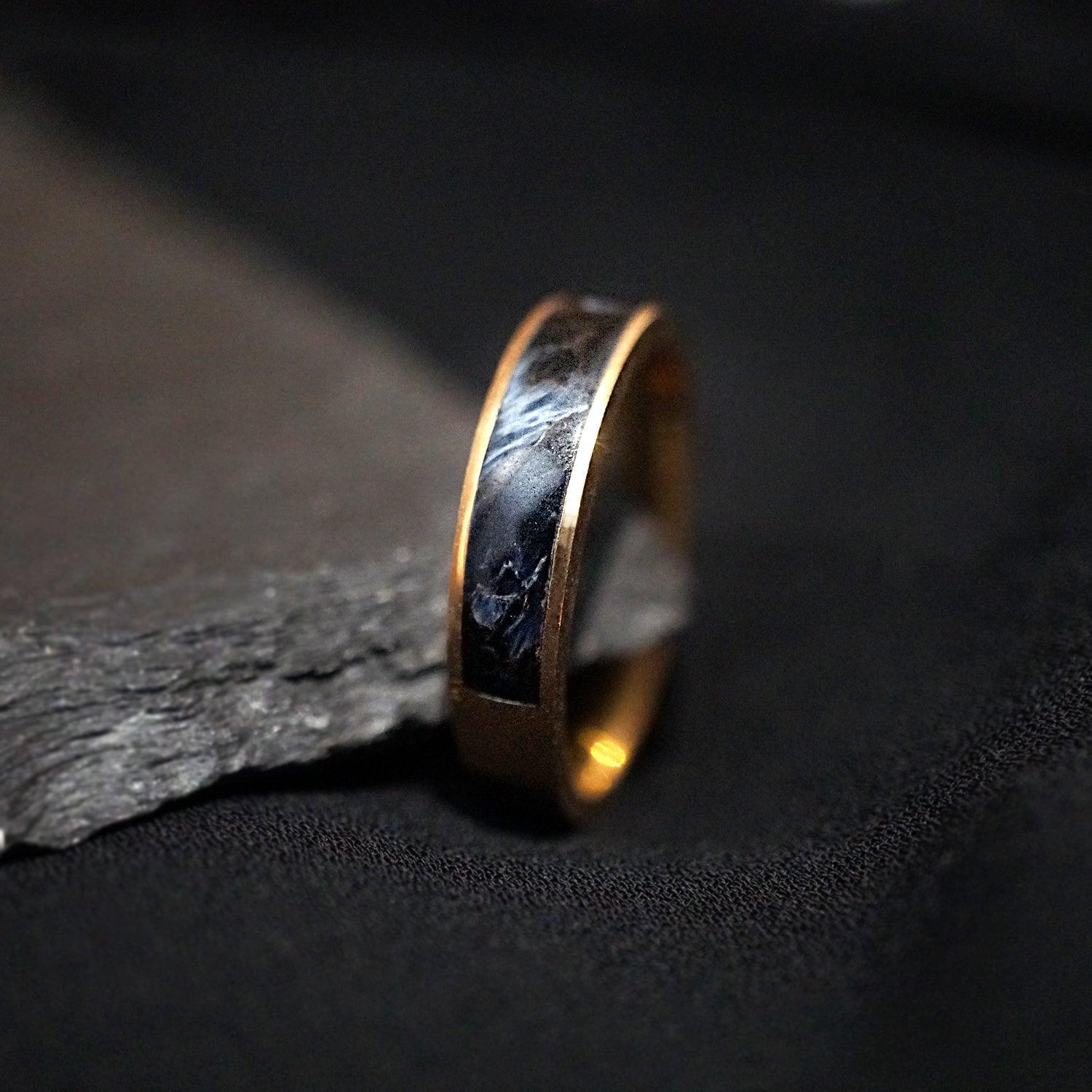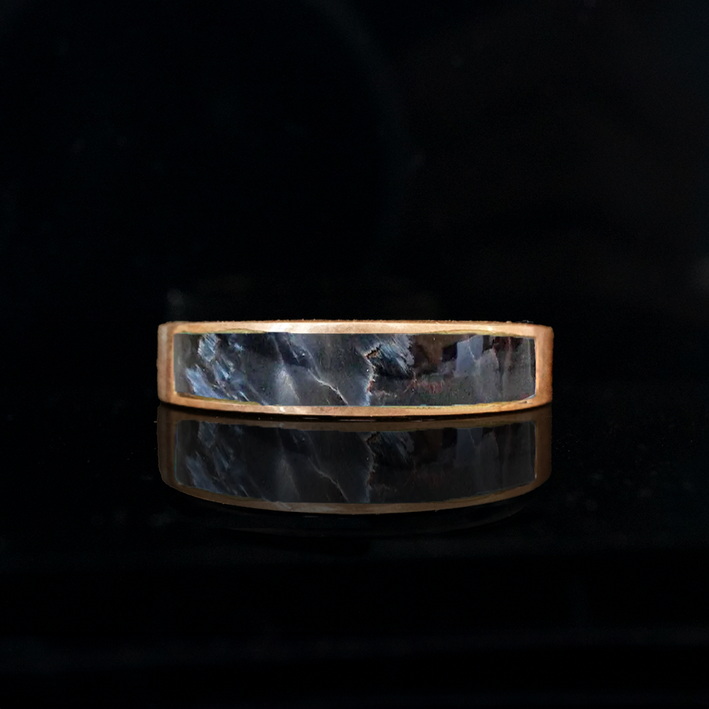 Pietersite is an extremely rare natural gemstone comprised mostly of tiger's eye and hawk's eye, with brilliant flashes of golden light and churning clouds of deepest blue. The beauty and essence of Storm is captured in this rare stone. Just as lightning clears the air and makes all things new, Pietersite discharges negative energies and emotional turmoil, and cleanses the aura, restoring it to calm. This ring is available in sterling silver, 14K and 18K solid gold with a high polish finished.
