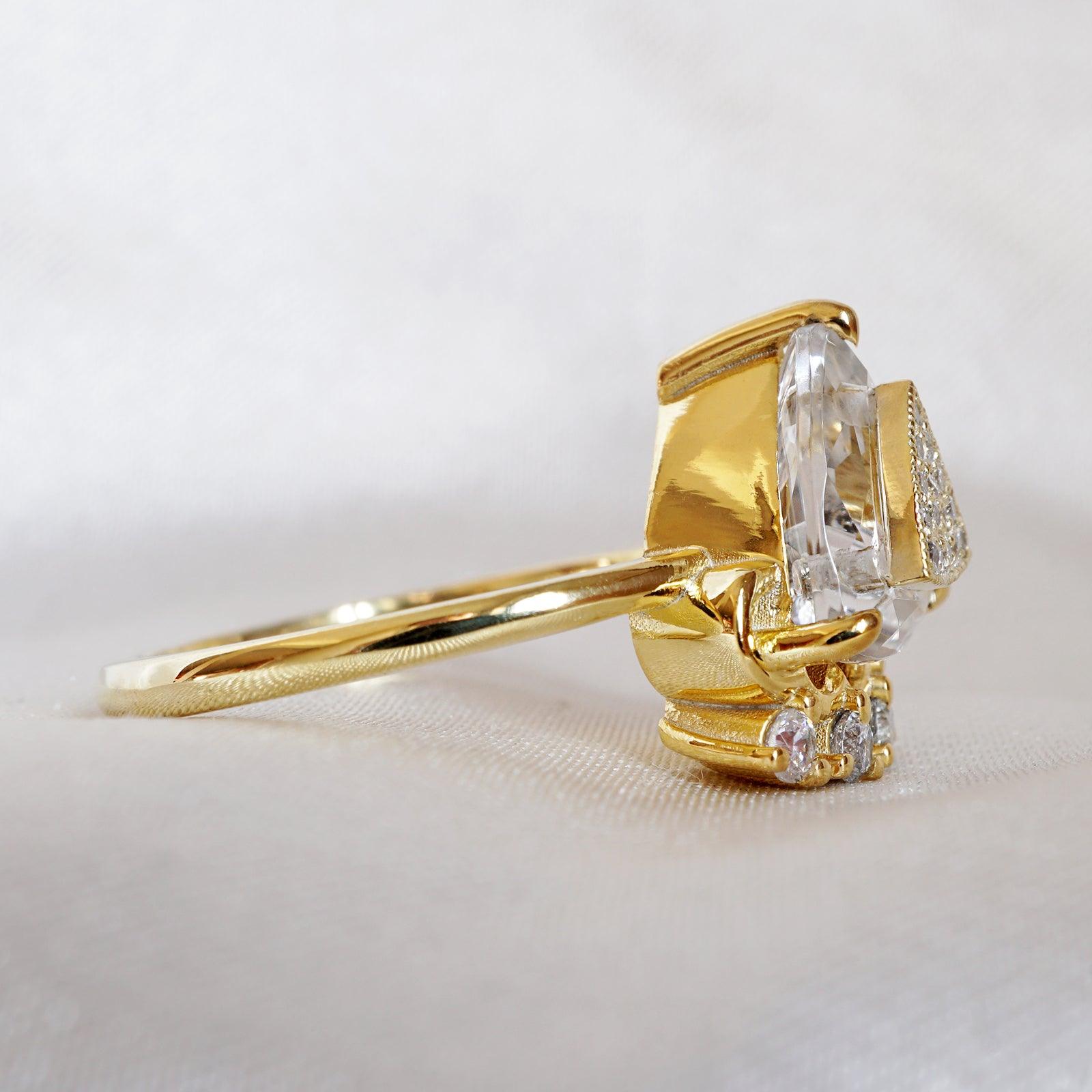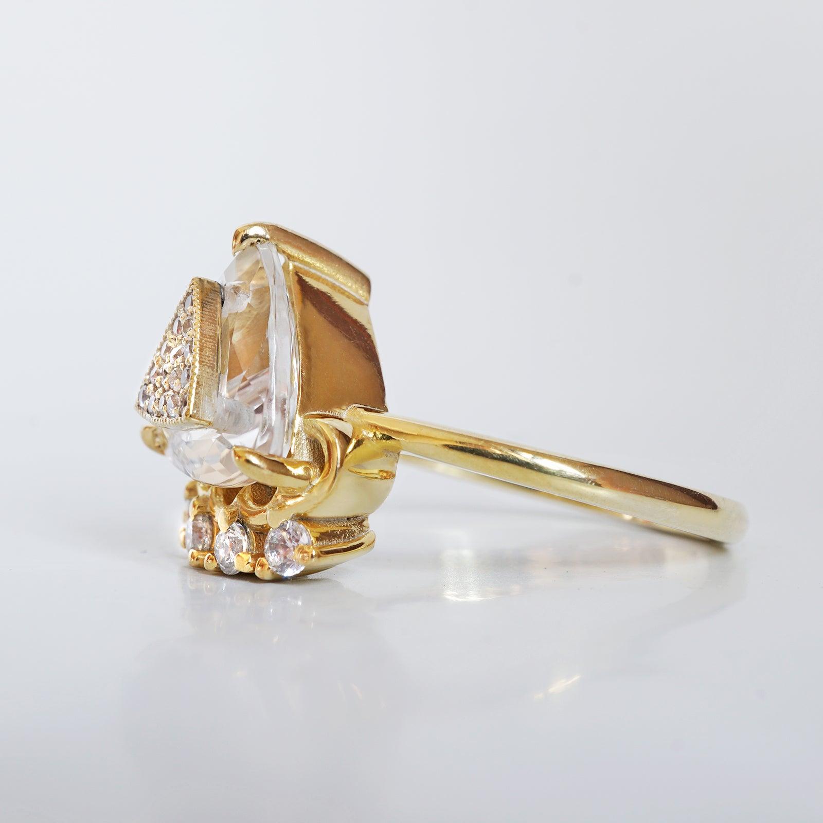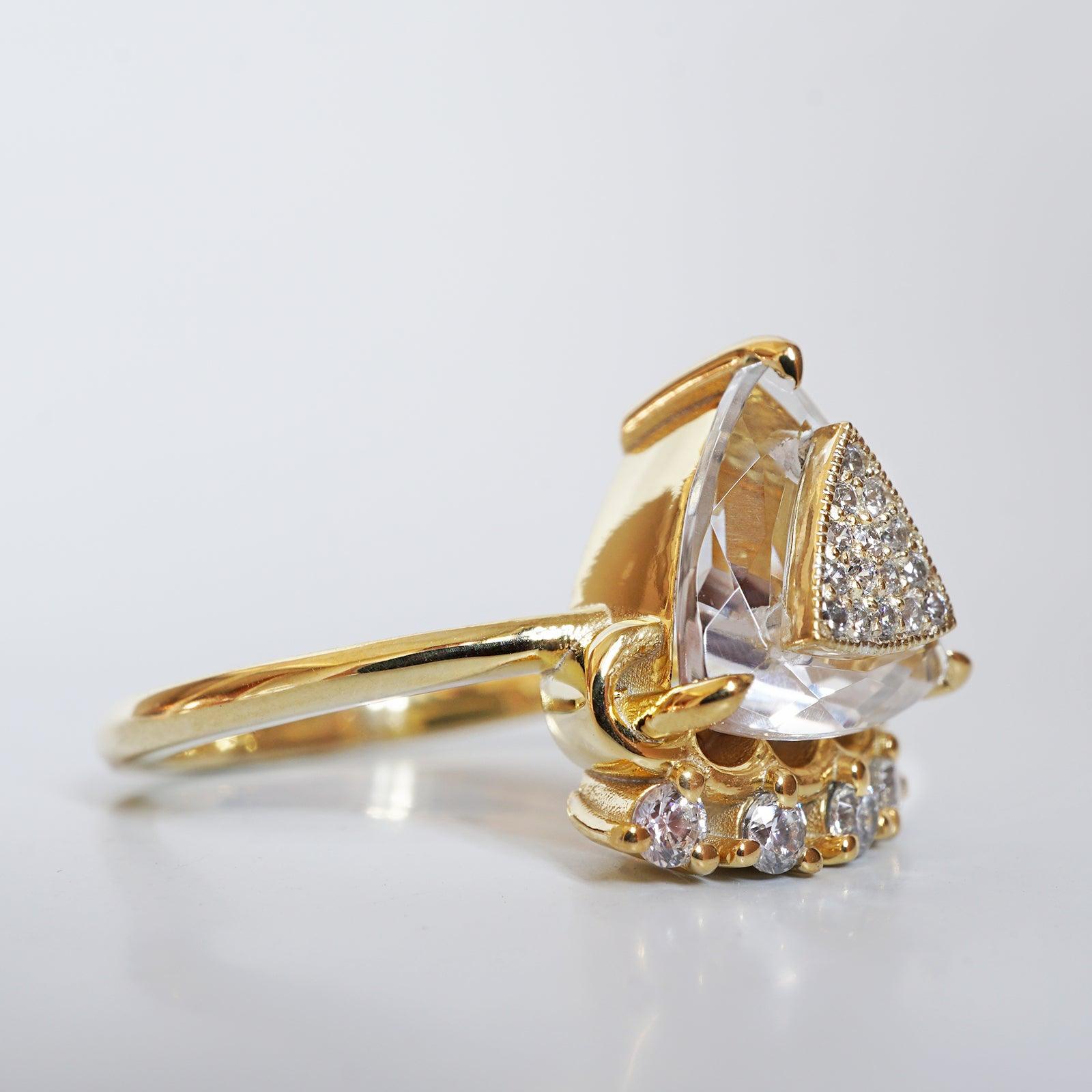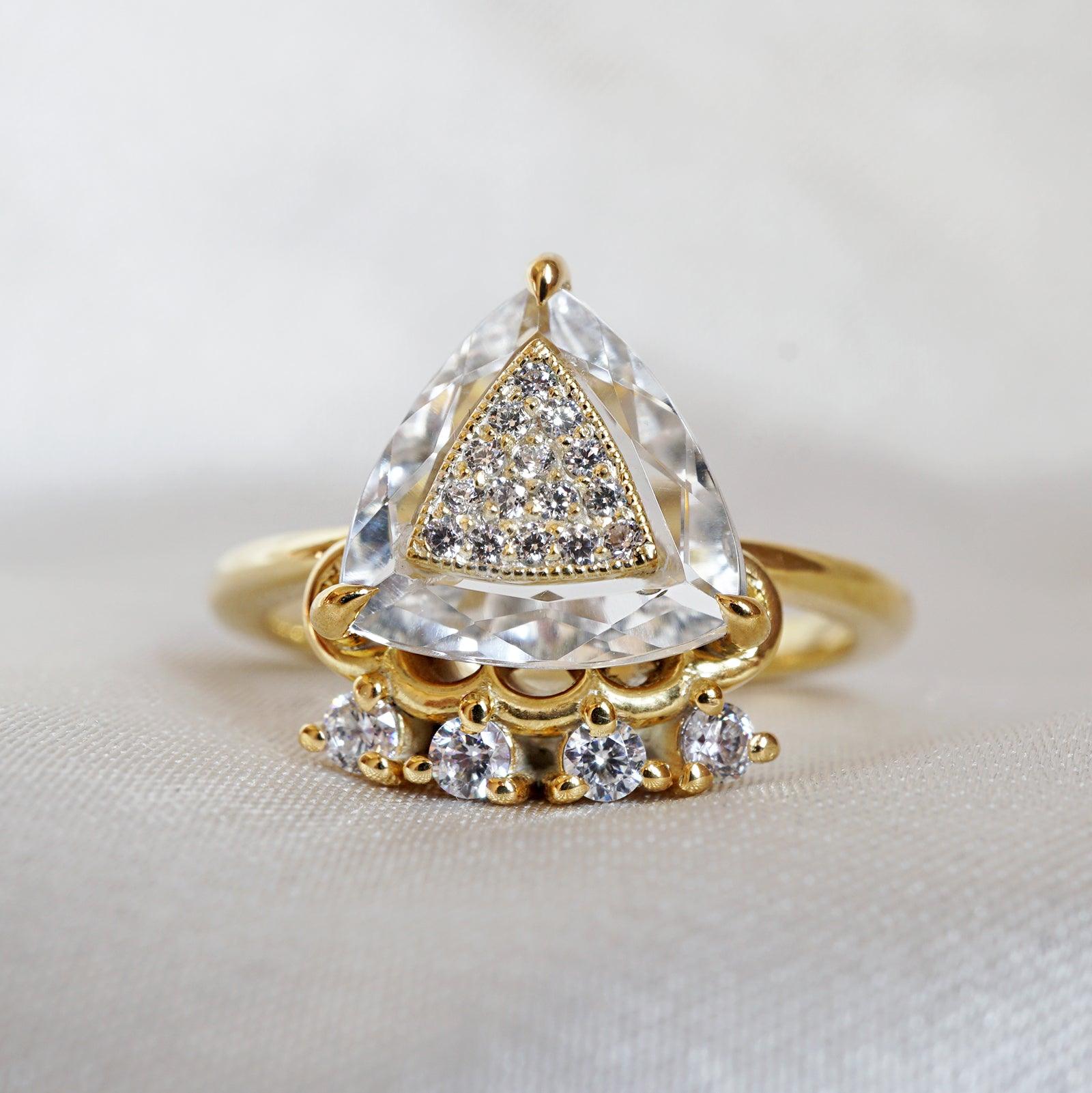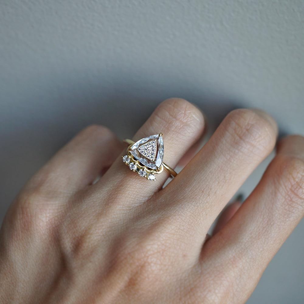 The Rockefeller Rock Crystal Diamond ring is truly an acquired taste. This ring reminds us of the strong and bold love of NYC. Featuring a custom cut trillion cut natural rock crystal. A triangle piece filled with tiny pave diamonds is affixed onto the rock crystal, almost looking like a diamond shield. Handcrafted in your choice of 14K and 18K yellow gold, rose gold, or white gold.