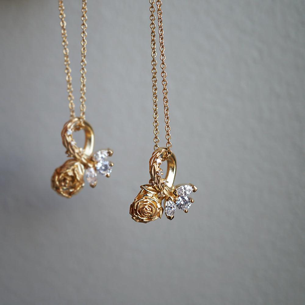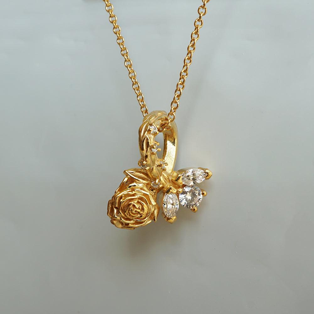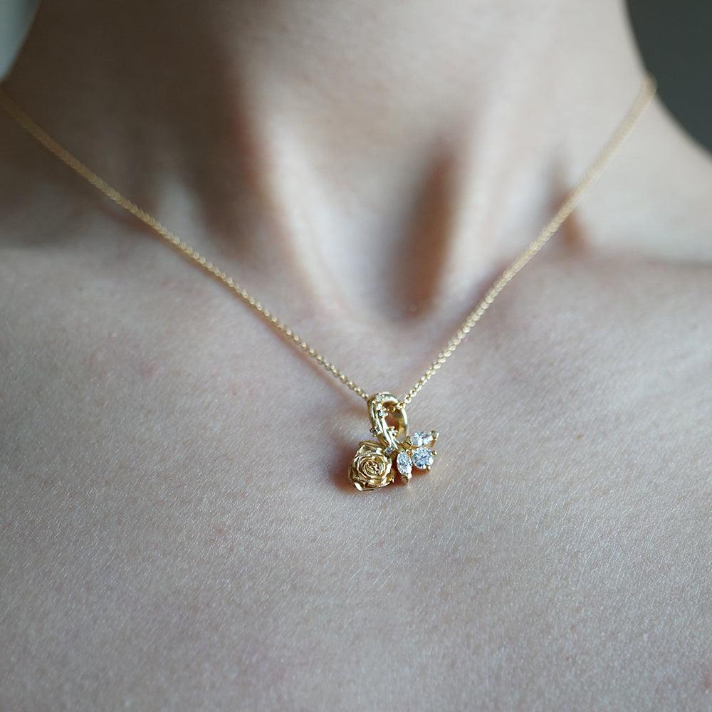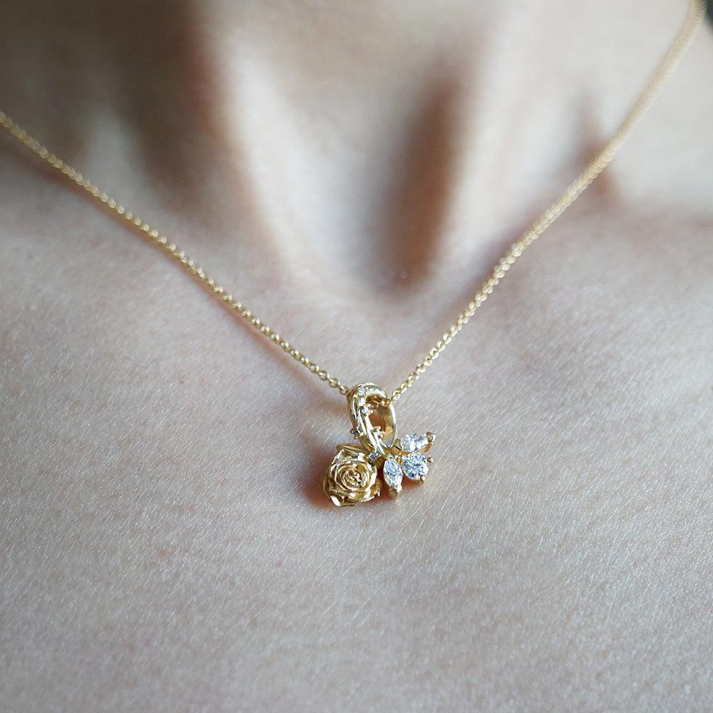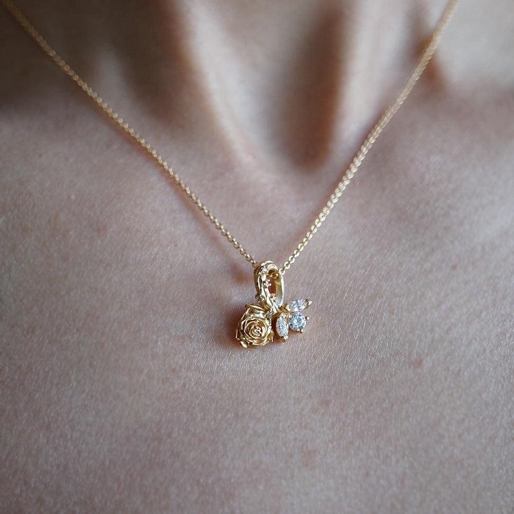The Rosabelle Necklace, meaning “beautiful rose,” captures timeless romance in sculpted gold. A delicately carved rose pendant rests at the center, its stem adorned with tiny round natural diamonds and marquise details that shimmer softly with every movement.