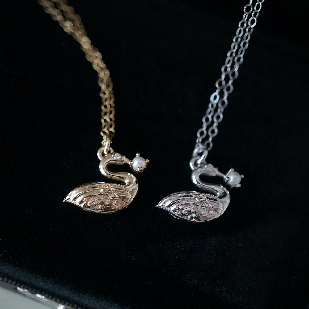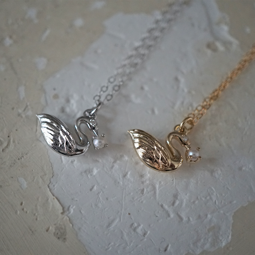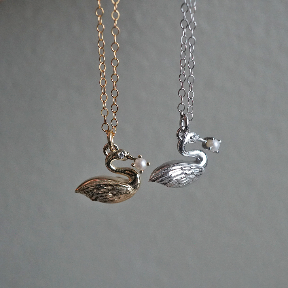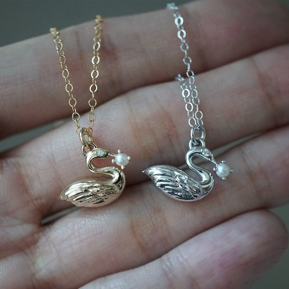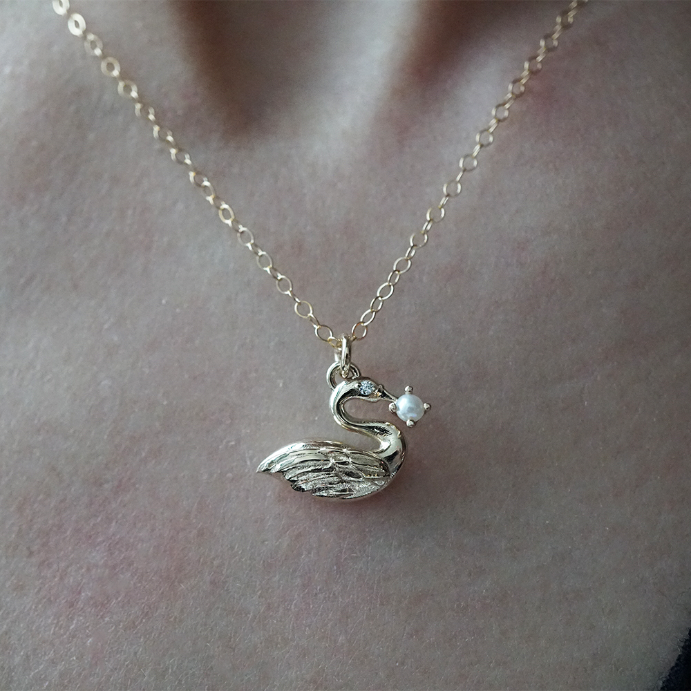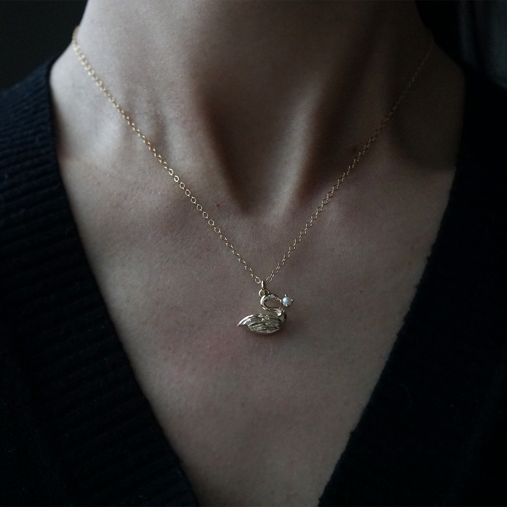 The Swan Necklace is crafted in precious 14K solid gold and adorned with a tiny natural white diamond that shimmers softly, while a freshwater pearl rests gracefully in its beak. Slipped on a delicate gold-filled chain, it’s a piece that captures quiet sophistication and timeless allure. This swan charm is 3-dimensional.