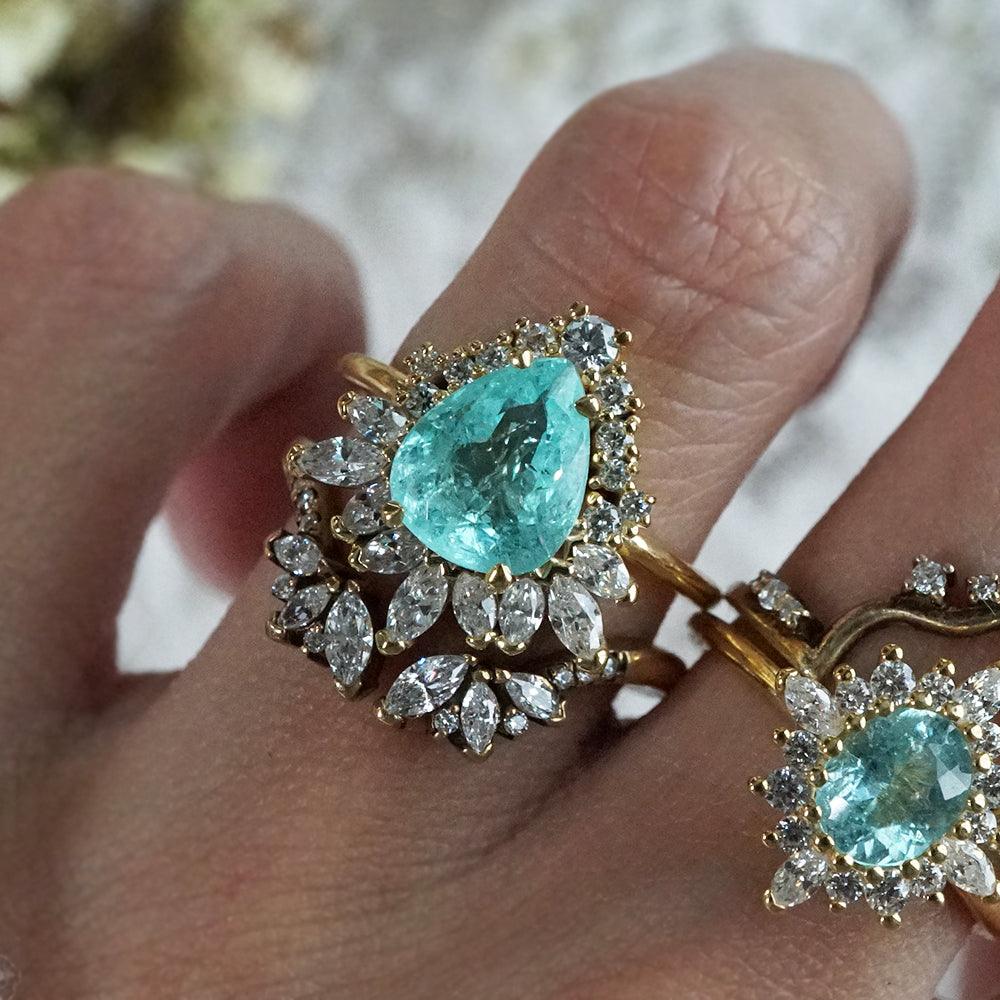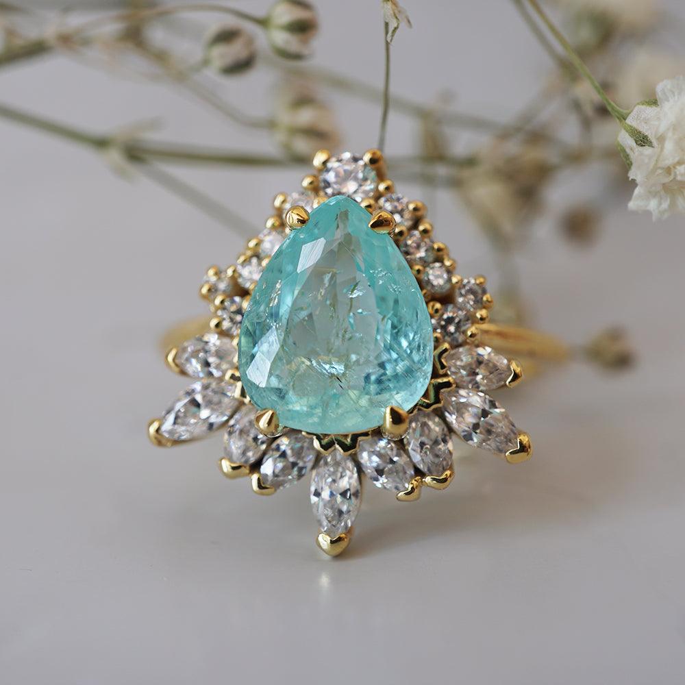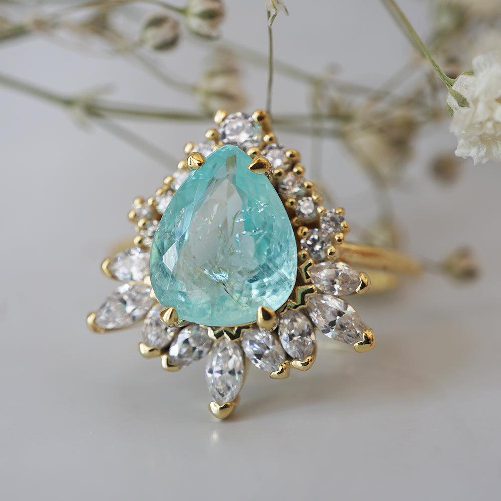Prized for its neon blue color, the Paraiba Tourmaline is a collectors gem. The Paraiba Tourmaline Opulence Diamond Ring is sure to make your heart skip a beat. Featuring a certified 2.13ct natural pear Paraiba Tourmaline. It's truly a one-of-a-kind gem. Handcrafted in your choice of 14K yellow gold, rose gold, or white gold.