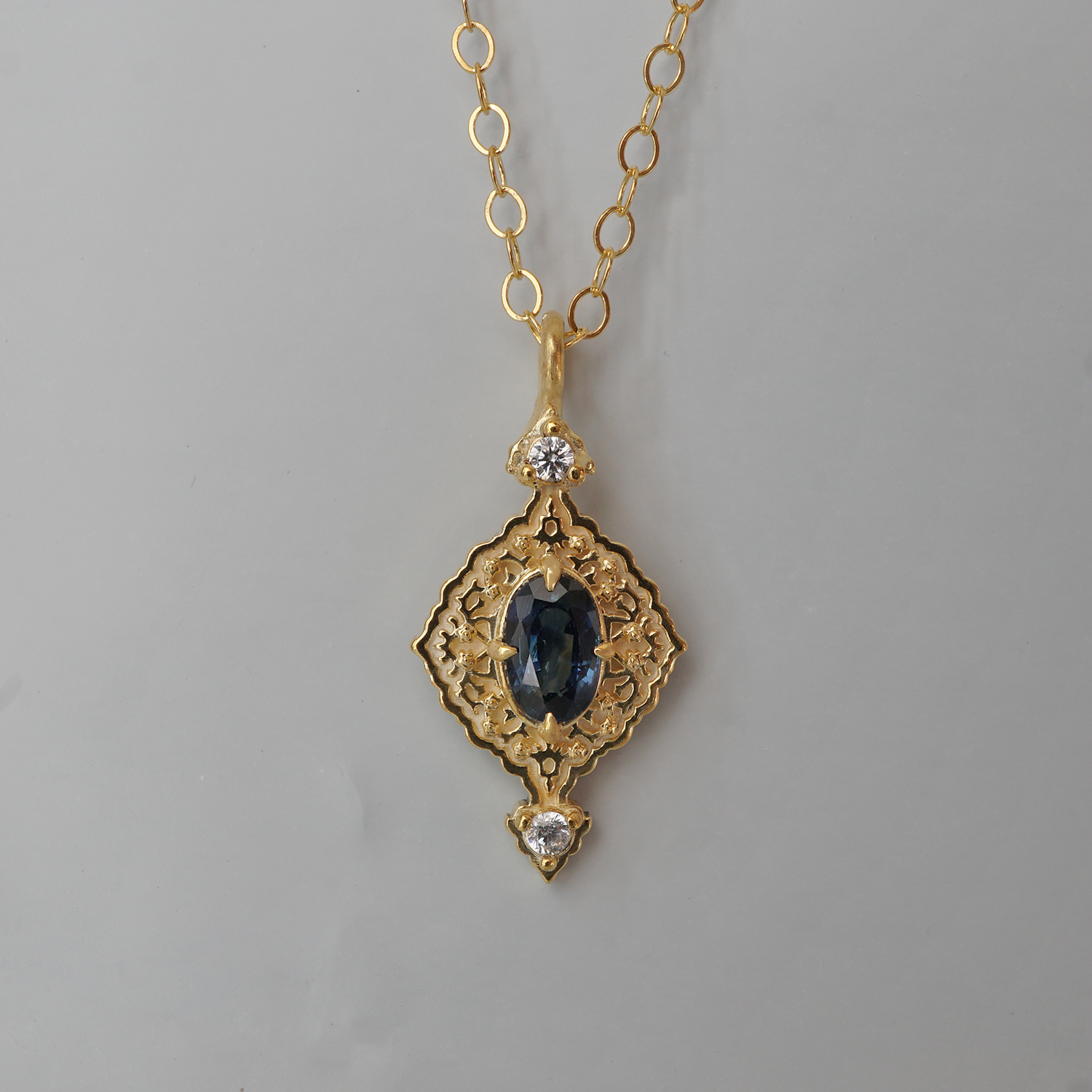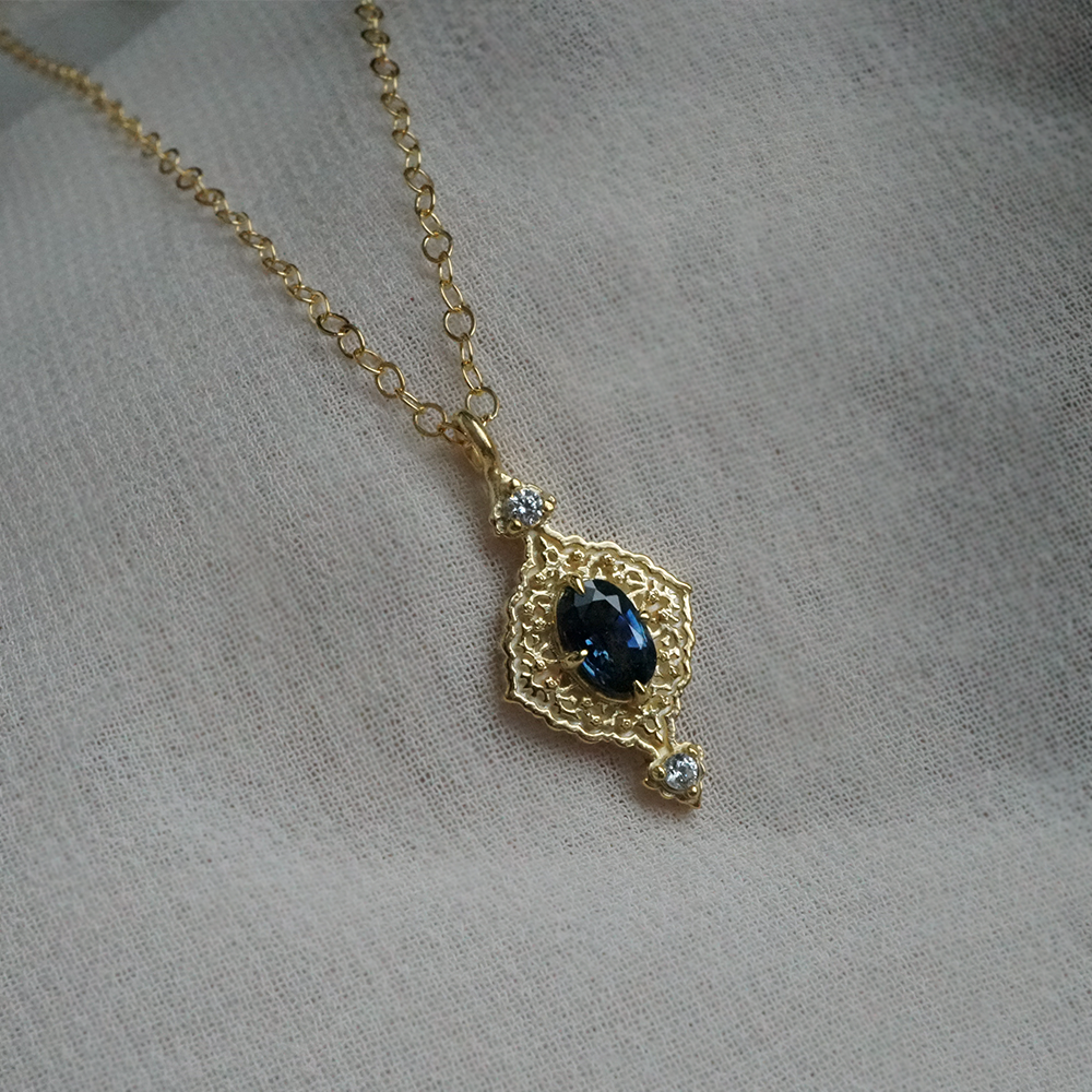 Introducing our stunning Cairo-inspired Blue Sapphire Necklace, a captivating homage to the architectural splendor and artistic finesse of the enchanting city of Cairo. Drawing inspiration from the intricate decorations adorning Cairo's historic buildings.