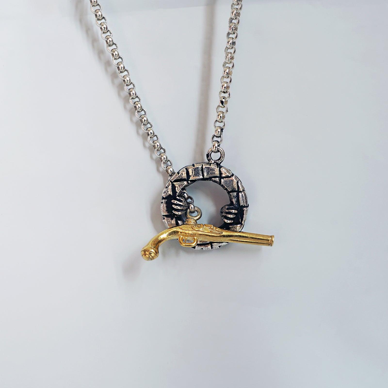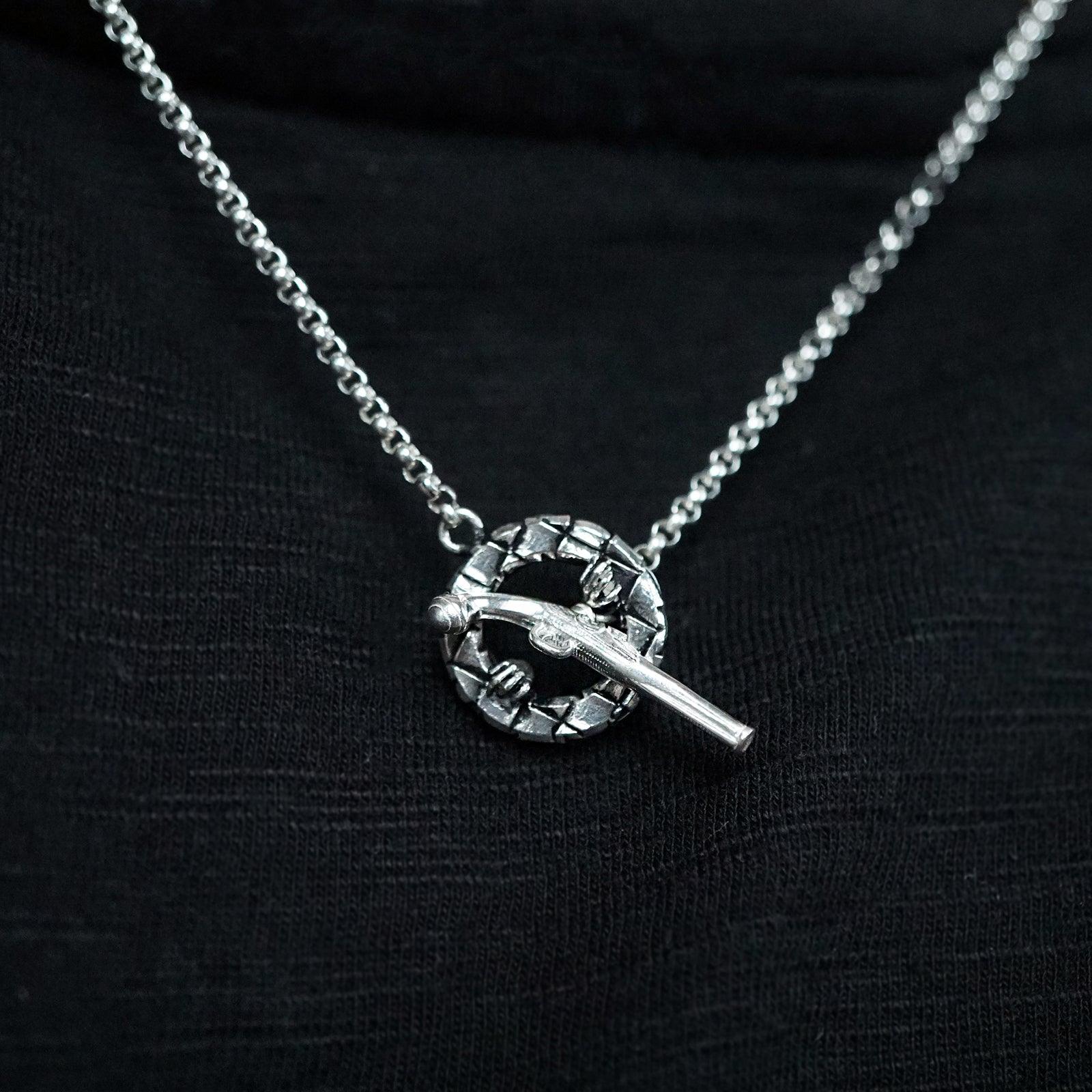 Inspired by the intimacy of interaction and the tension between softness and strength, the Hand Gun Chain Necklace invites you to take part in its story. To wear it, both hands must meet—slipping the golden handgun through the sterling silver circle like a ritual, deliberate and bold. The gun hangs where you decide, resting at your chosen length, your chosen power. Crafted in 14K gold and sterling silver, this piece is more than jewelry—it’s an act. A moment. A quiet defiance. For those who don’t wait to be defined. Who write their own rules with fire in their chest and art on their skin.