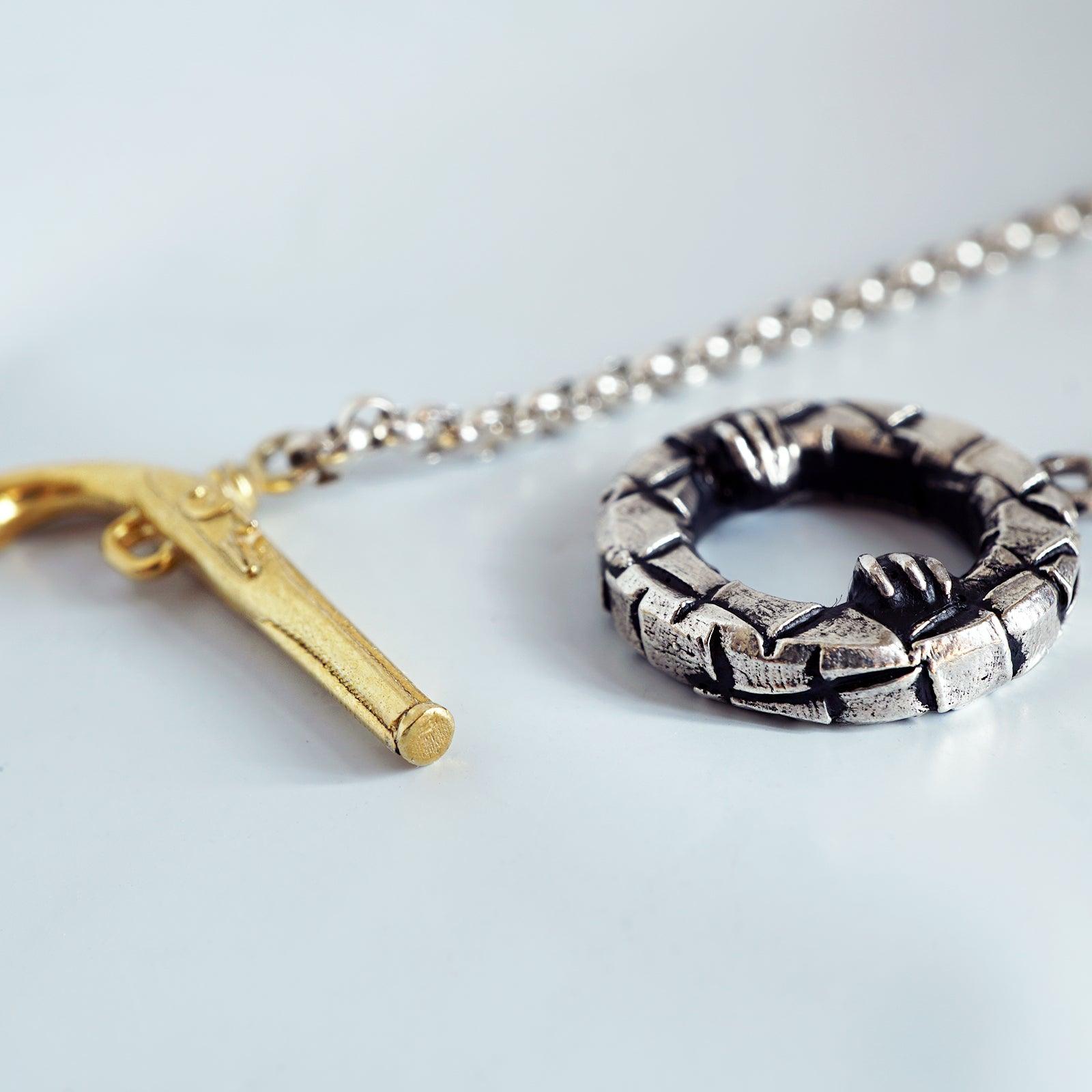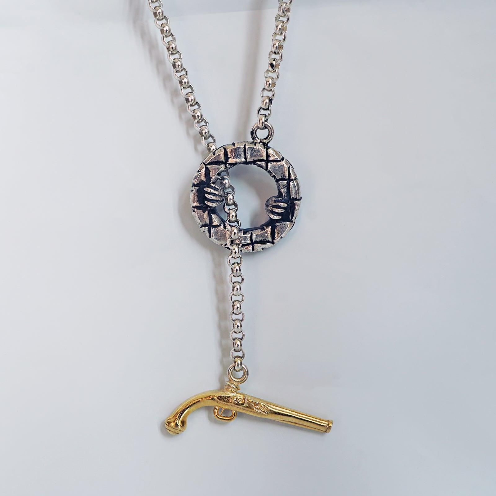 - 14K gold gun, and sterling silver chain and Circled Rock pendant