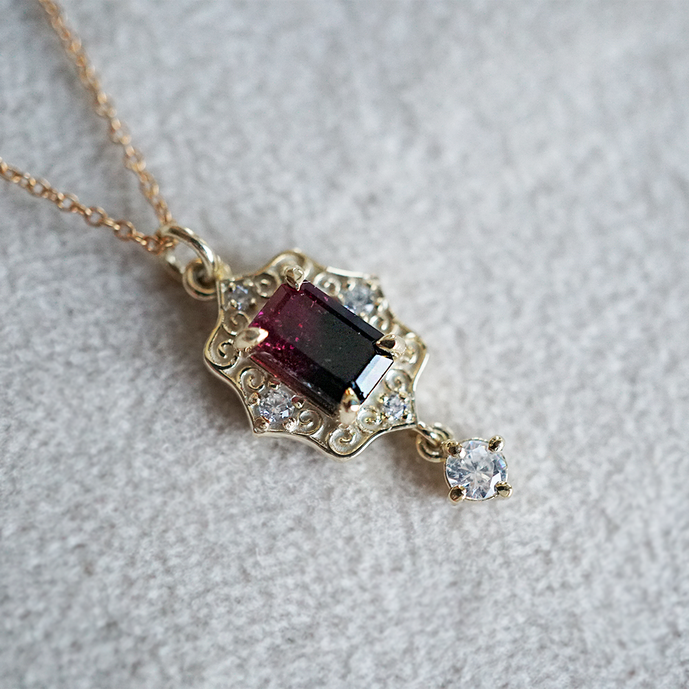 Unveil the mystique of the Velvet Night Pendant, a mesmerizing blend of vintage romance and modern elegance. At its center lies a bi-color black and pink emerald-cut tourmaline, framed by ornate gold filigree and accented with your choice of natural diamonds or CZ. A delicate diamond drop completes the design, adding graceful movement and celestial shimmer.