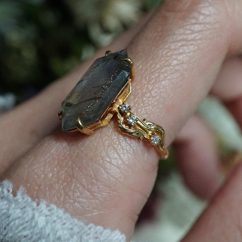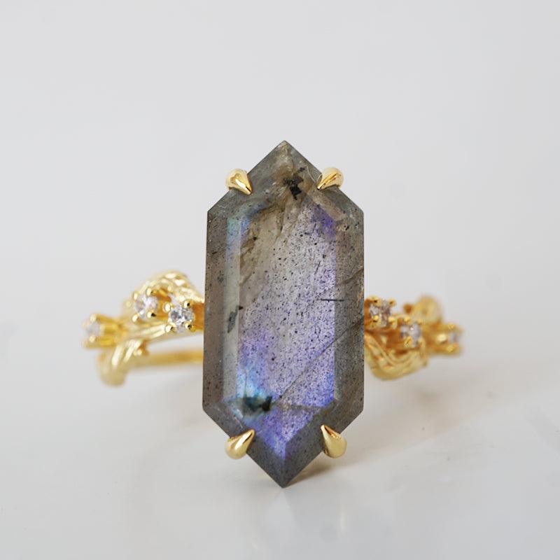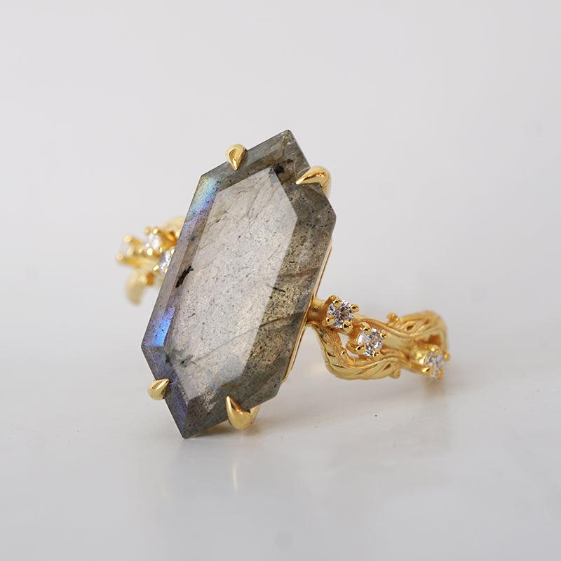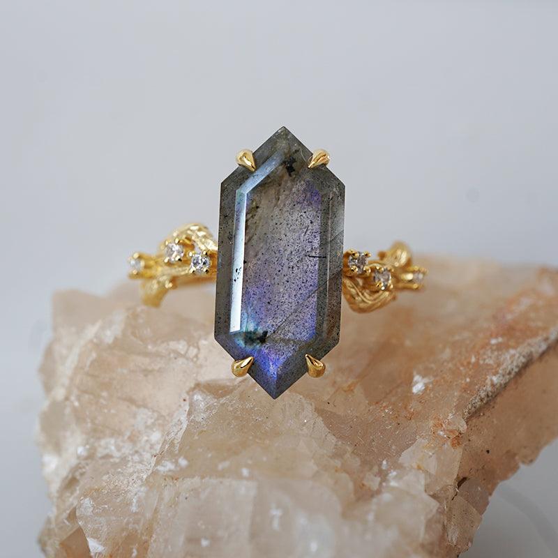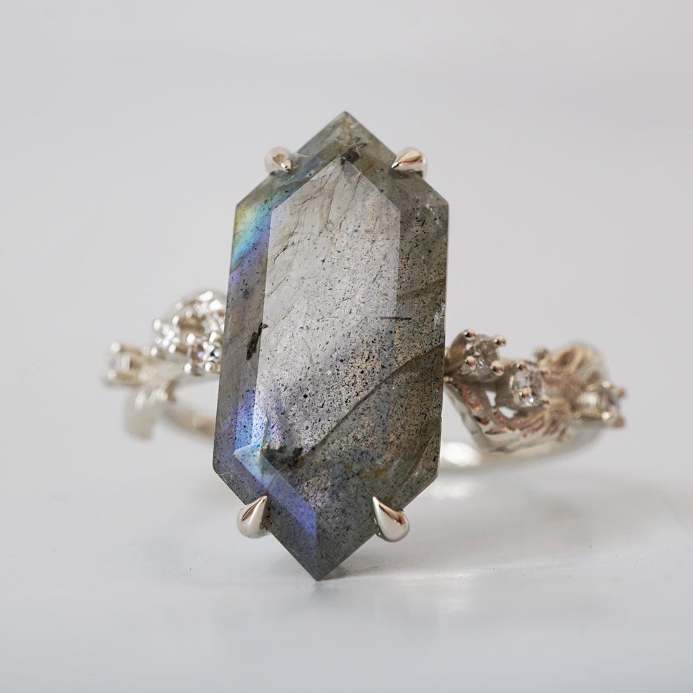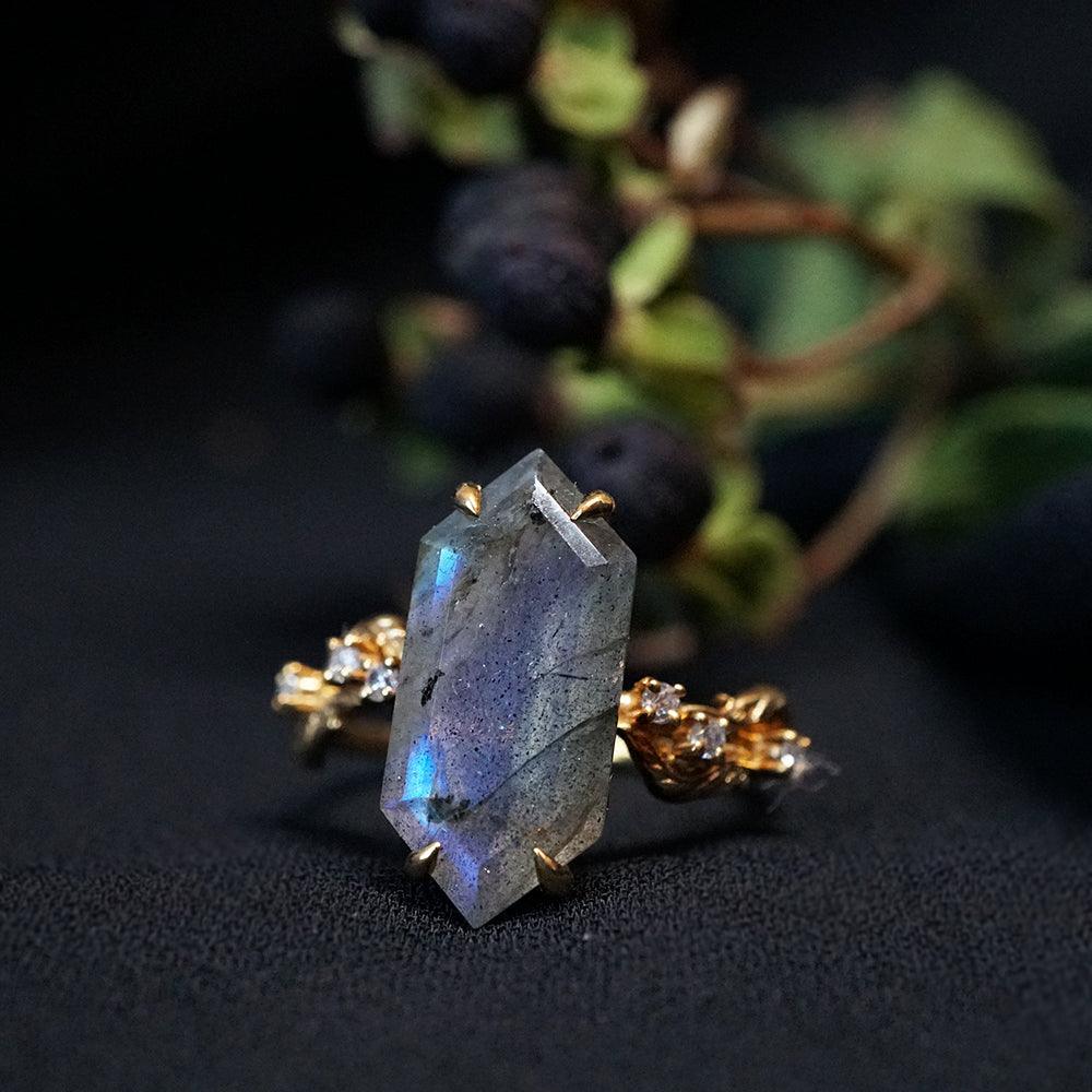 A custom-cut natural labradorite sets the tone—moody, enchanting, and alive with shifting light. Deep within the stone, flashes of blue glow like a secret sky, revealing a stunning sheen whenever sunlight touches its surface.