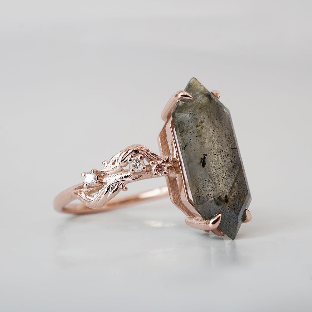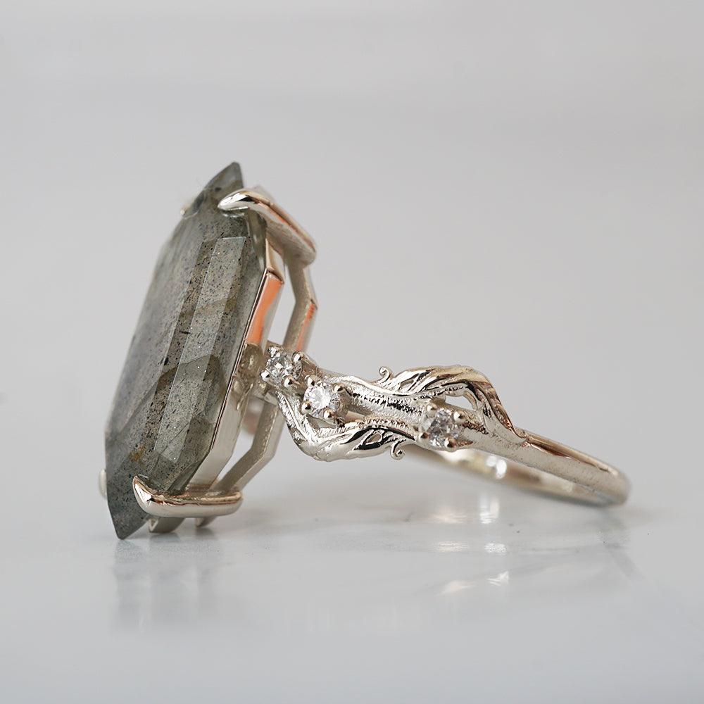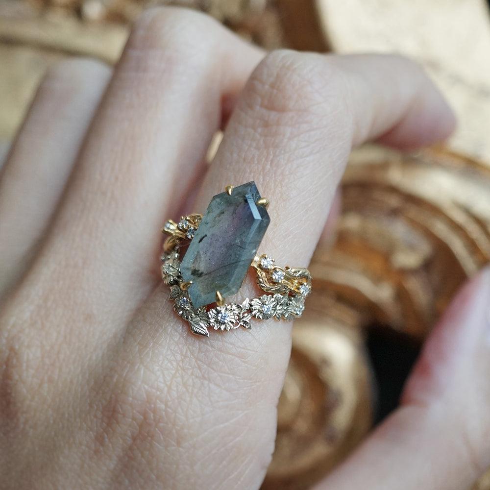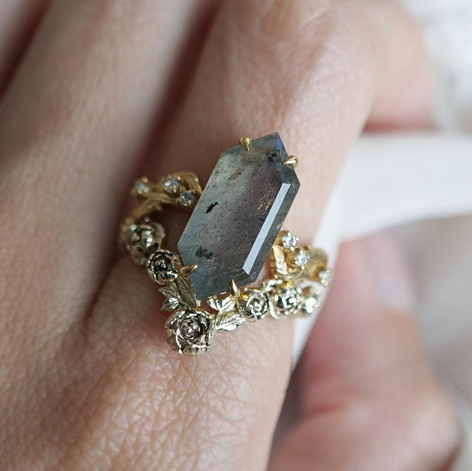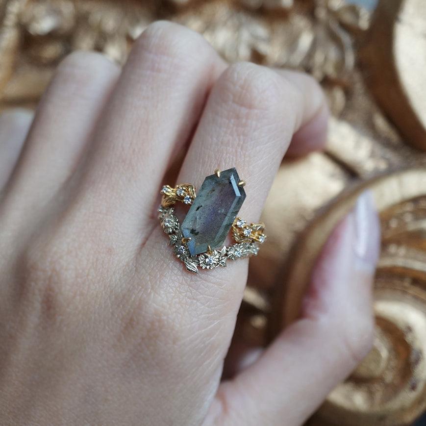 A custom-cut natural labradorite sets the tone—moody, enchanting, and alive with shifting light. Deep within the stone, flashes of blue glow like a secret sky, revealing a stunning sheen whenever sunlight touches its surface.