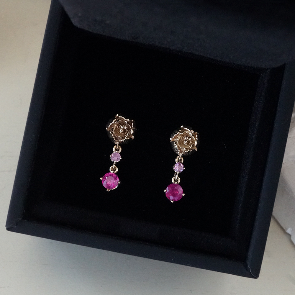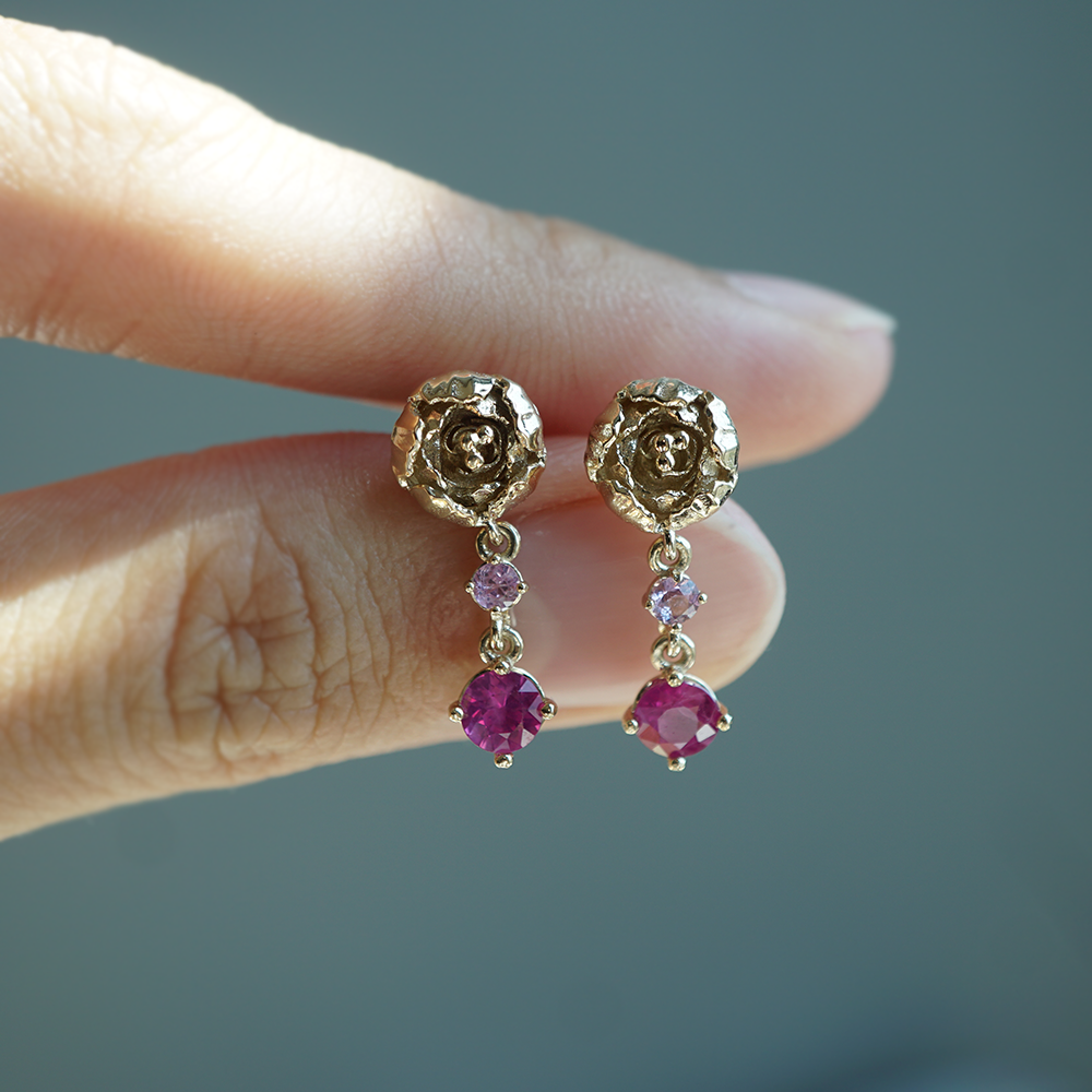 The Peonies Pink Sapphire Earrings bloom with timeless elegance and grace. Inspired by the soft romance of a spring garden, each earring features a hand-carved 14K solid gold peony delicately suspending two shades of natural pink sapphires.