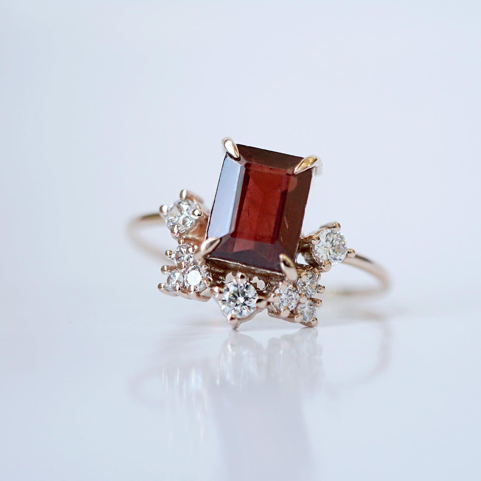 The Bordeaux Garnet Ring exudes regal sophistication and timeless charm. At its heart glows a natural garnet in a deep wine-red hue — a symbol of passion and strength — encircled by a halo of sparkling white stones that enhance its radiant brilliance.