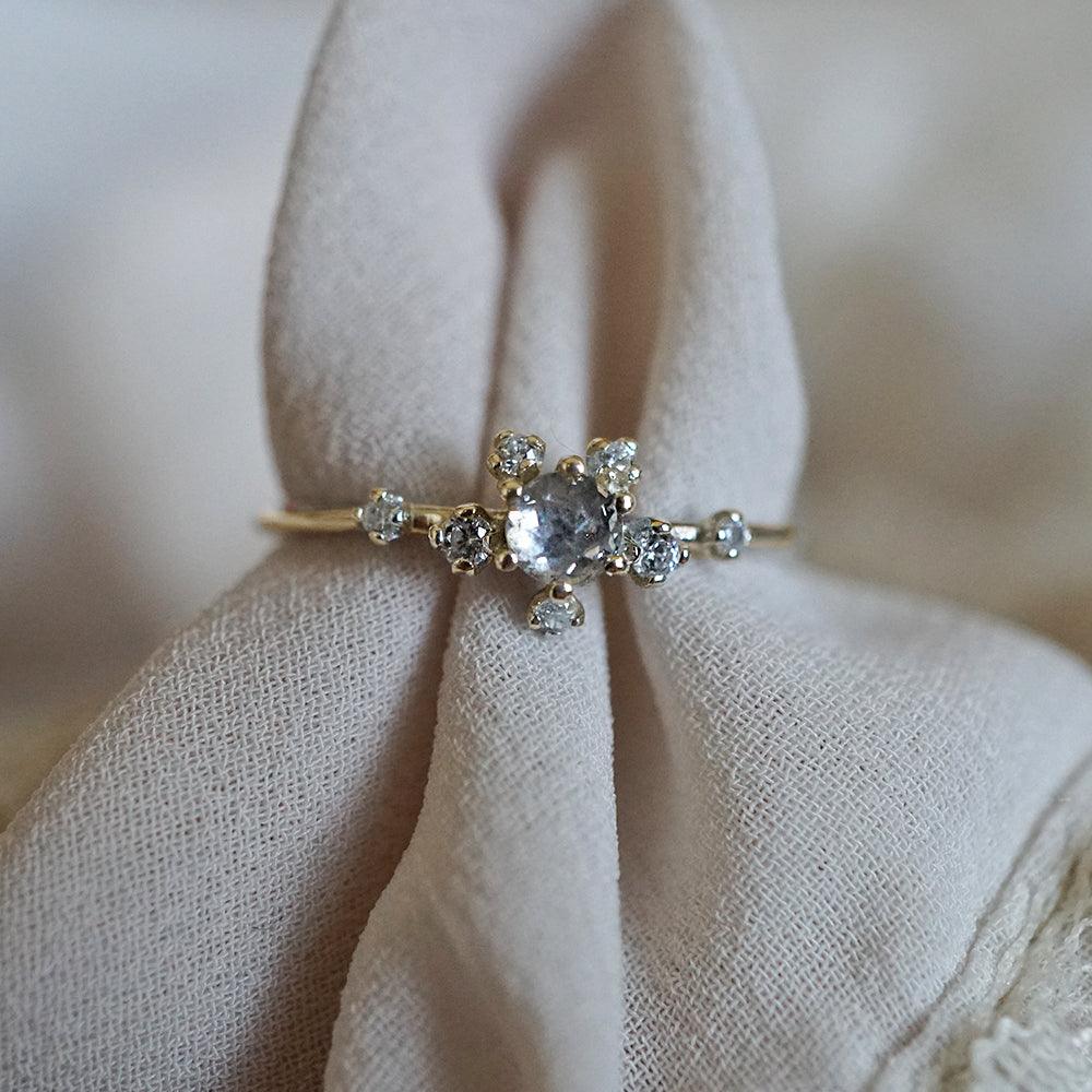 The Celestial Salt & Pepper Diamond Ring captures the quiet magic of a night sky. At its center rests a natural salt and pepper diamond, each one uniquely dusted with galaxy-like speckles. Paired with white diamonds or CZ, it adds a gentle constellation of sparkle that feels dreamy and ethereal.