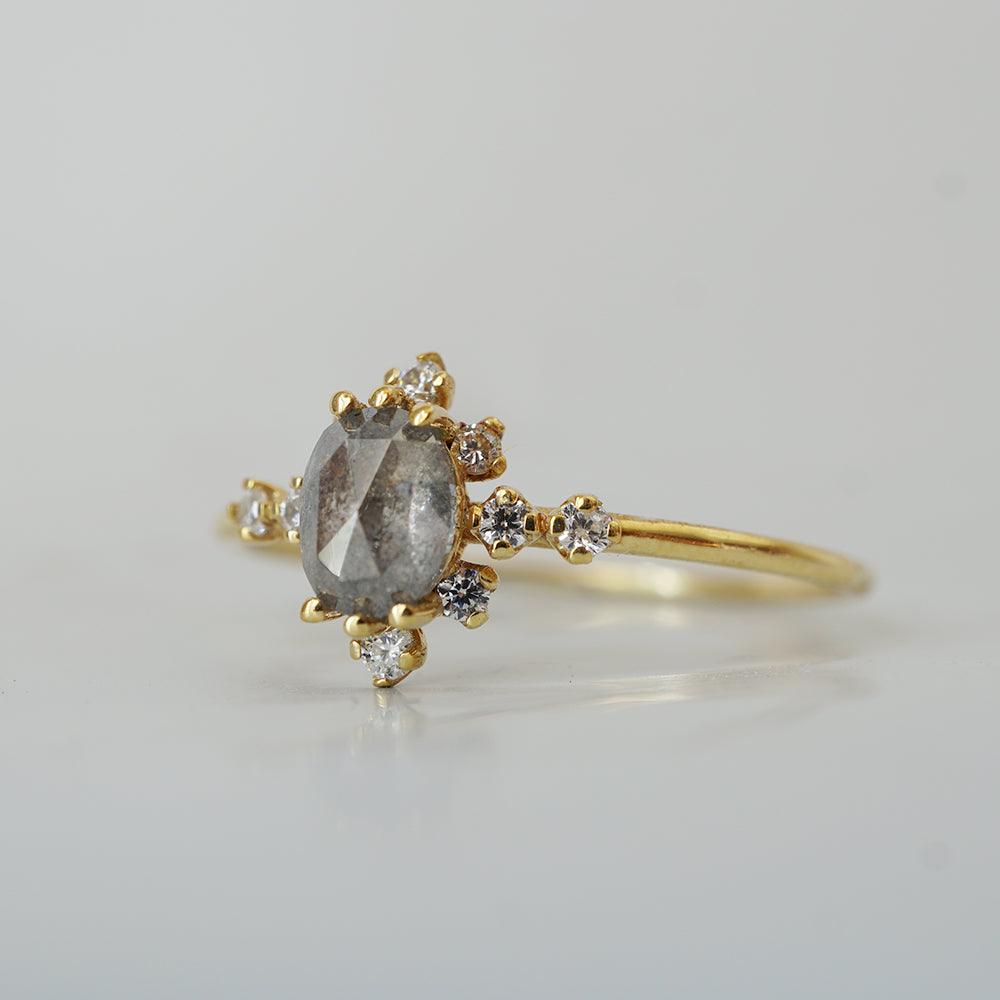 The Darling Salt & Pepper Diamond Ring is a petite treasure with a touch of magic. At its center rests a natural salt and pepper diamond, each one uniquely speckled with its own constellation of light and shadow. It’s paired with white diamonds or CZ, adding a soft sparkle that feels gentle, timeless, and endlessly charming.