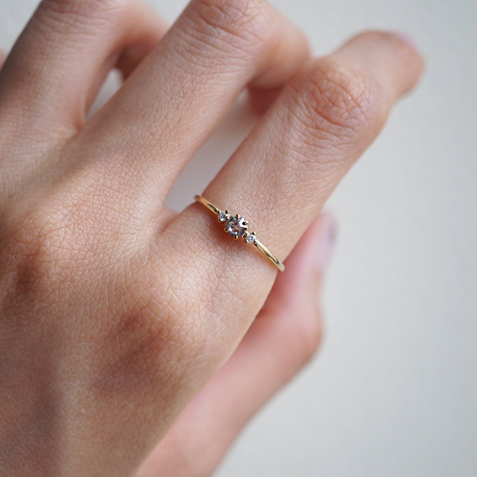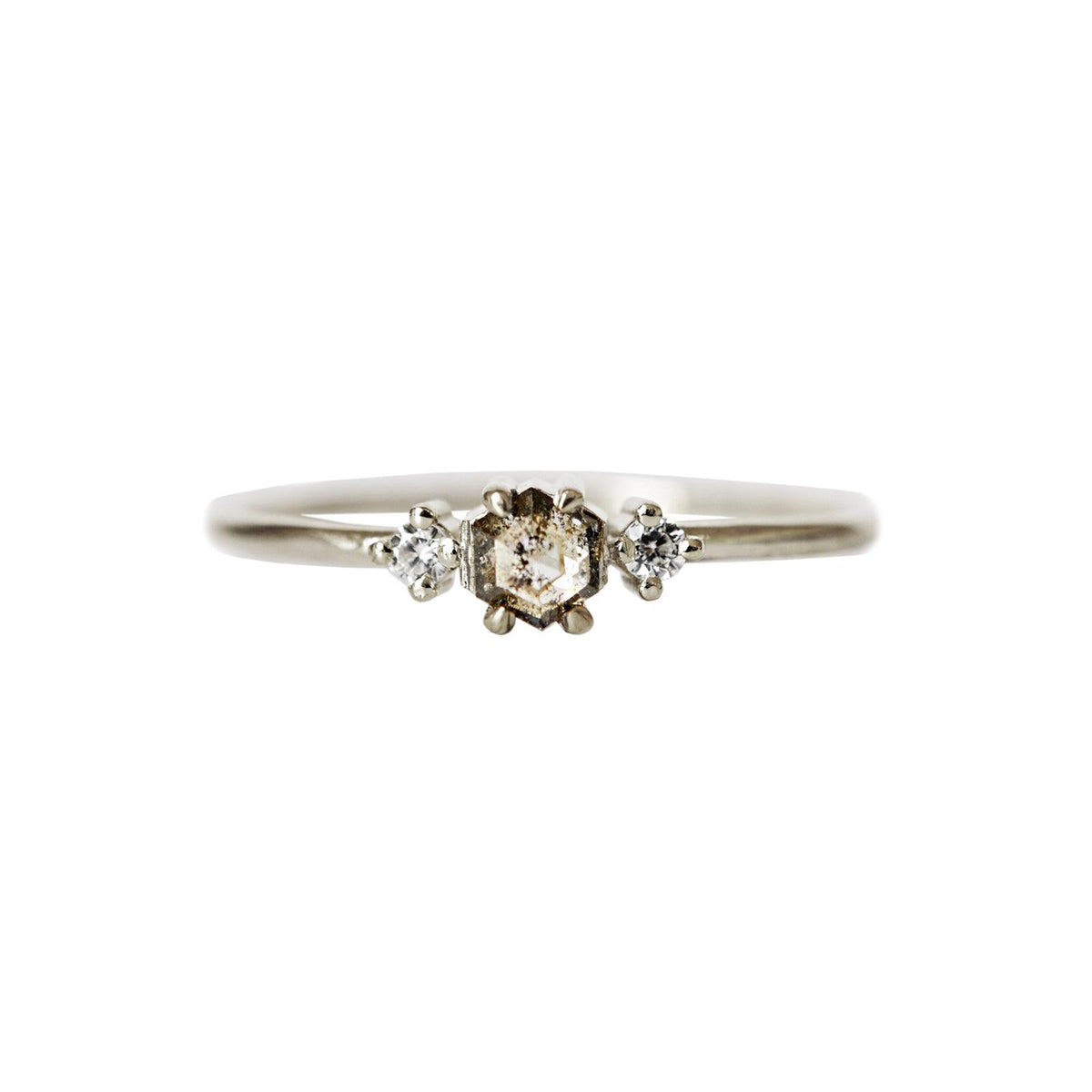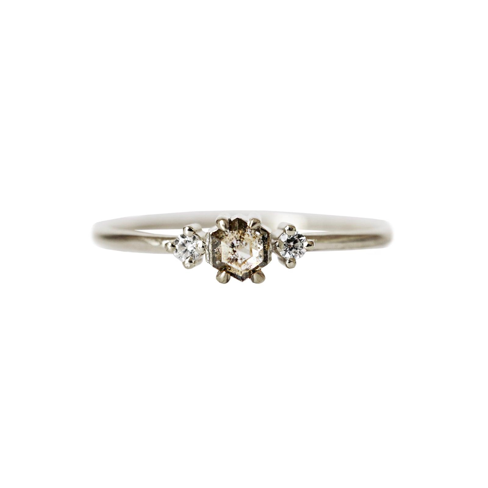 The Mini Hexy Salt & Pepper Ring celebrates the beauty of imperfection in its most delicate form. Featuring a natural hexagon-shaped salt and pepper diamond, framed by two natural white diamonds, this ring captures a subtle sparkle that feels both modern and timeless.