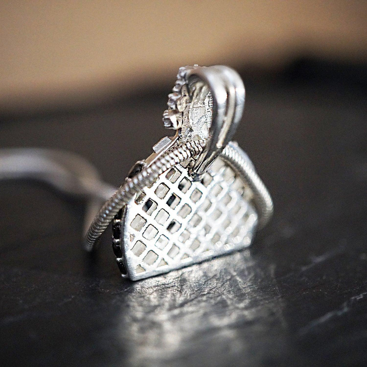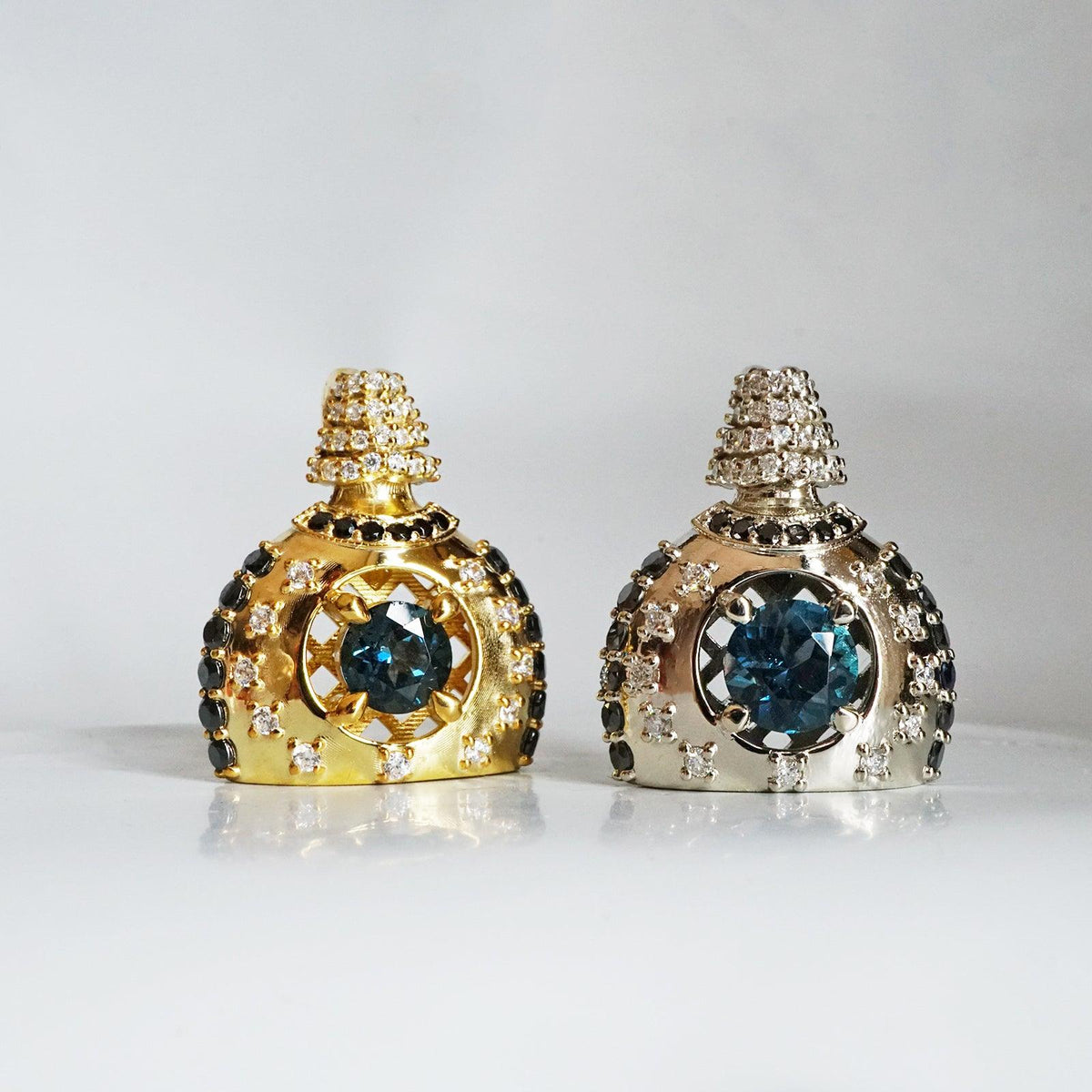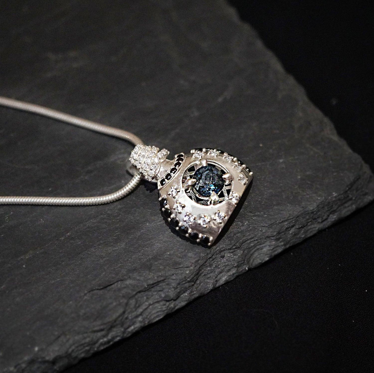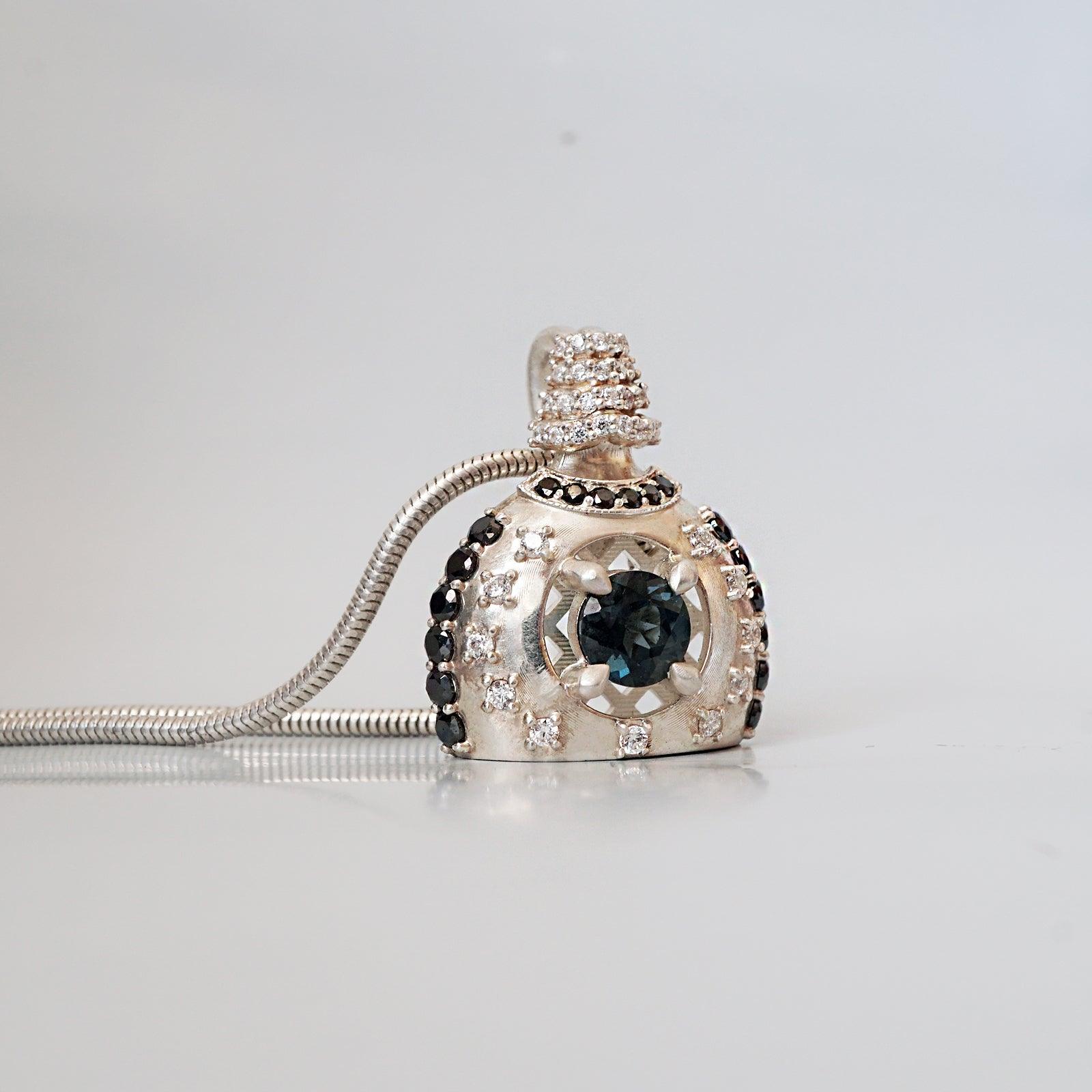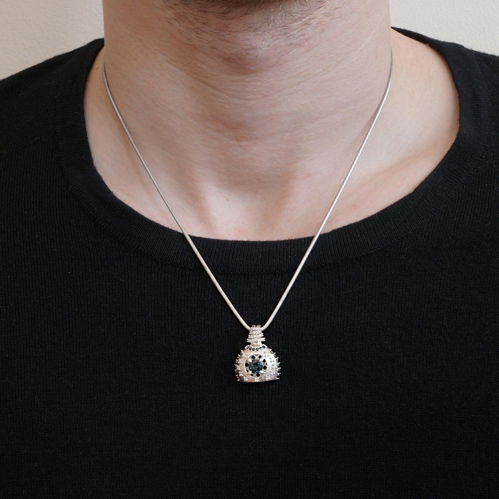 The Henri IV Dudognon Heritage Cognac Grande Champagne Pendant was inspired by Mr. Altamirano's company, Tequila Ley .925. It is one of the world's most expensive bottle. A truly one-of-a-kind pendant is designed for the stylish man or a collector. Featuring a 6mm mystical blue London Topaz surrounded by natural black and white diamonds.