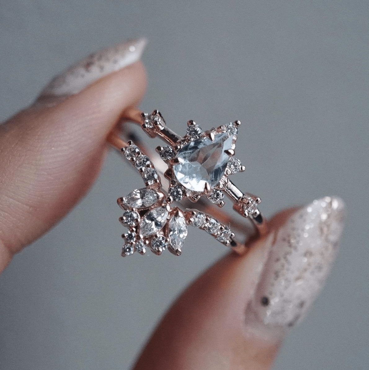 Featured here is the Aquamarine Crush Ring, paired with the Winter Palace Marquise Ring Band—a romantic duo that glimmers like sunlight on ice. The serene blue aquamarine evokes calm waters and clarity, while the marquise diamond accents of the Winter Palace band add a touch of regal elegance. Choose between your choice of natural diamonds or CZ for the side stones.