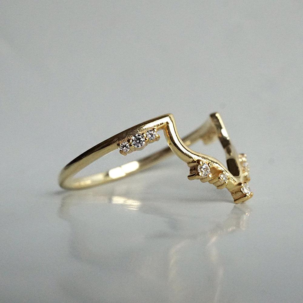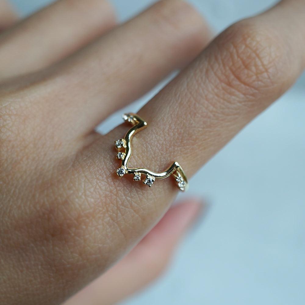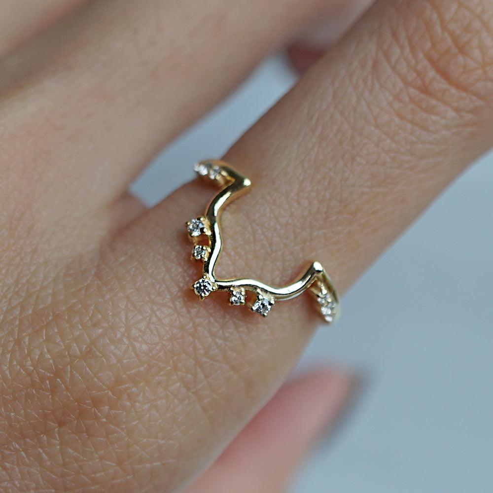 Inspired by the elegant crowns once worn by royals, the Diadem Diamond Ring is a graceful symbol of timeless beauty. Tiny natural white diamonds shimmer along a gently curved band, reminiscent of dew droplets on gold.