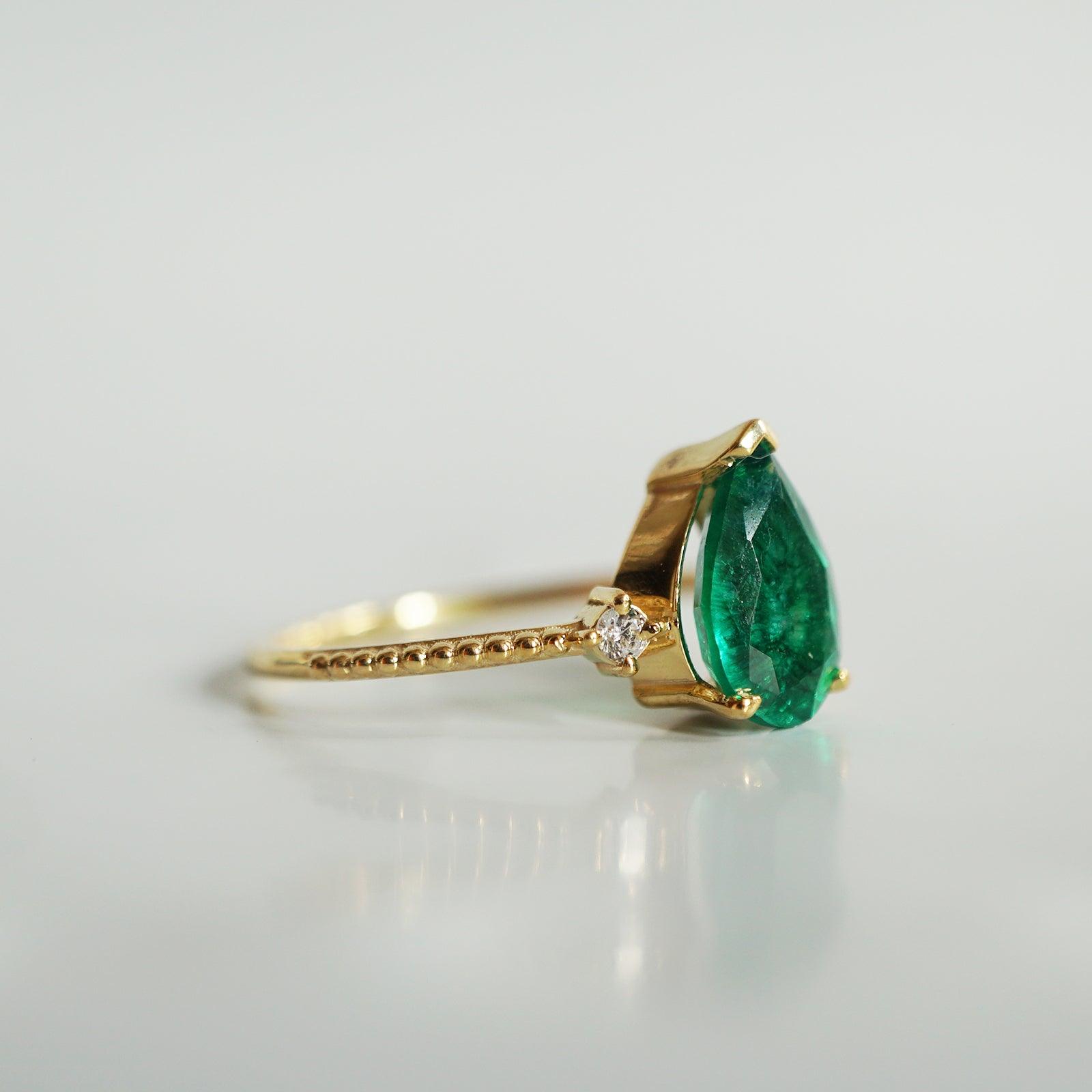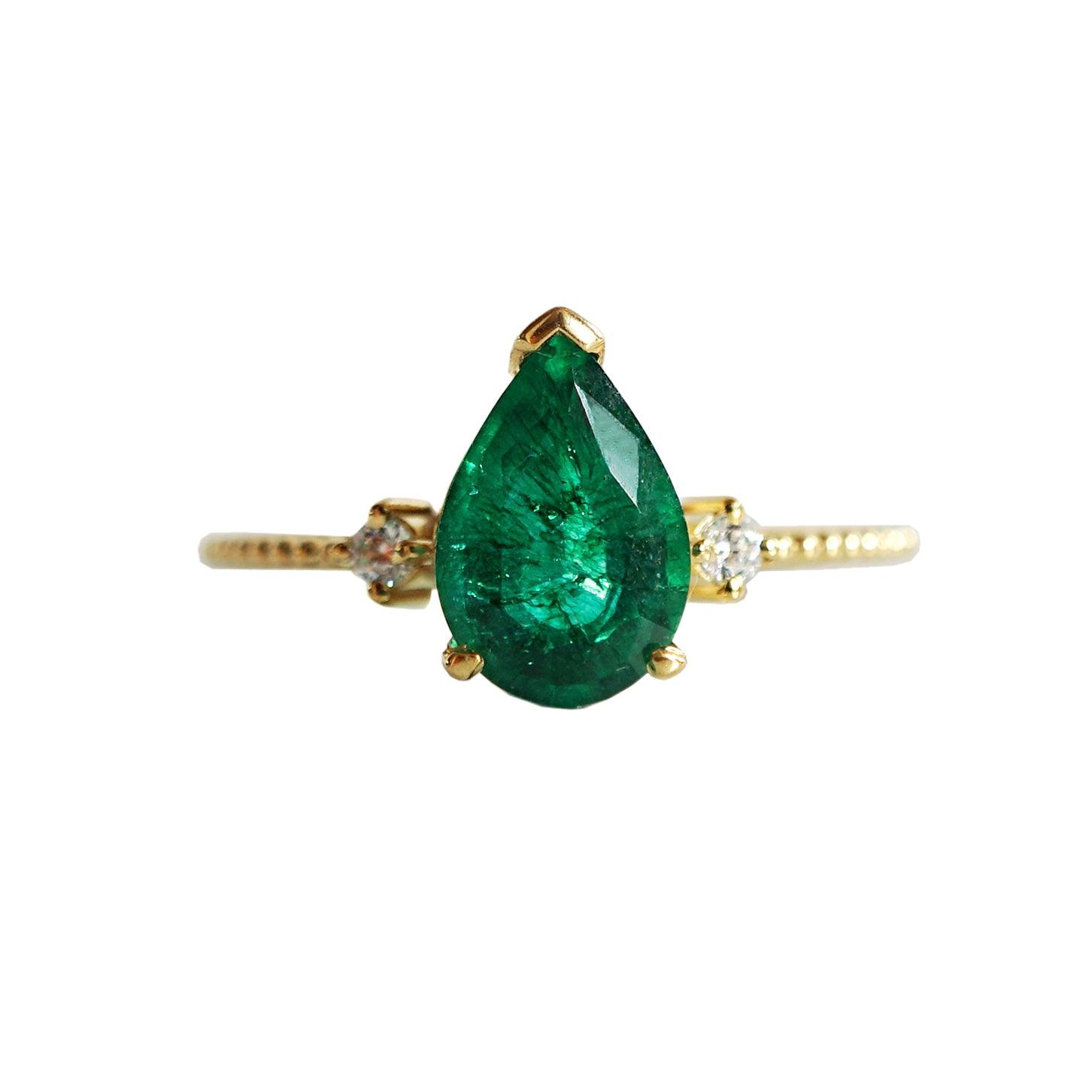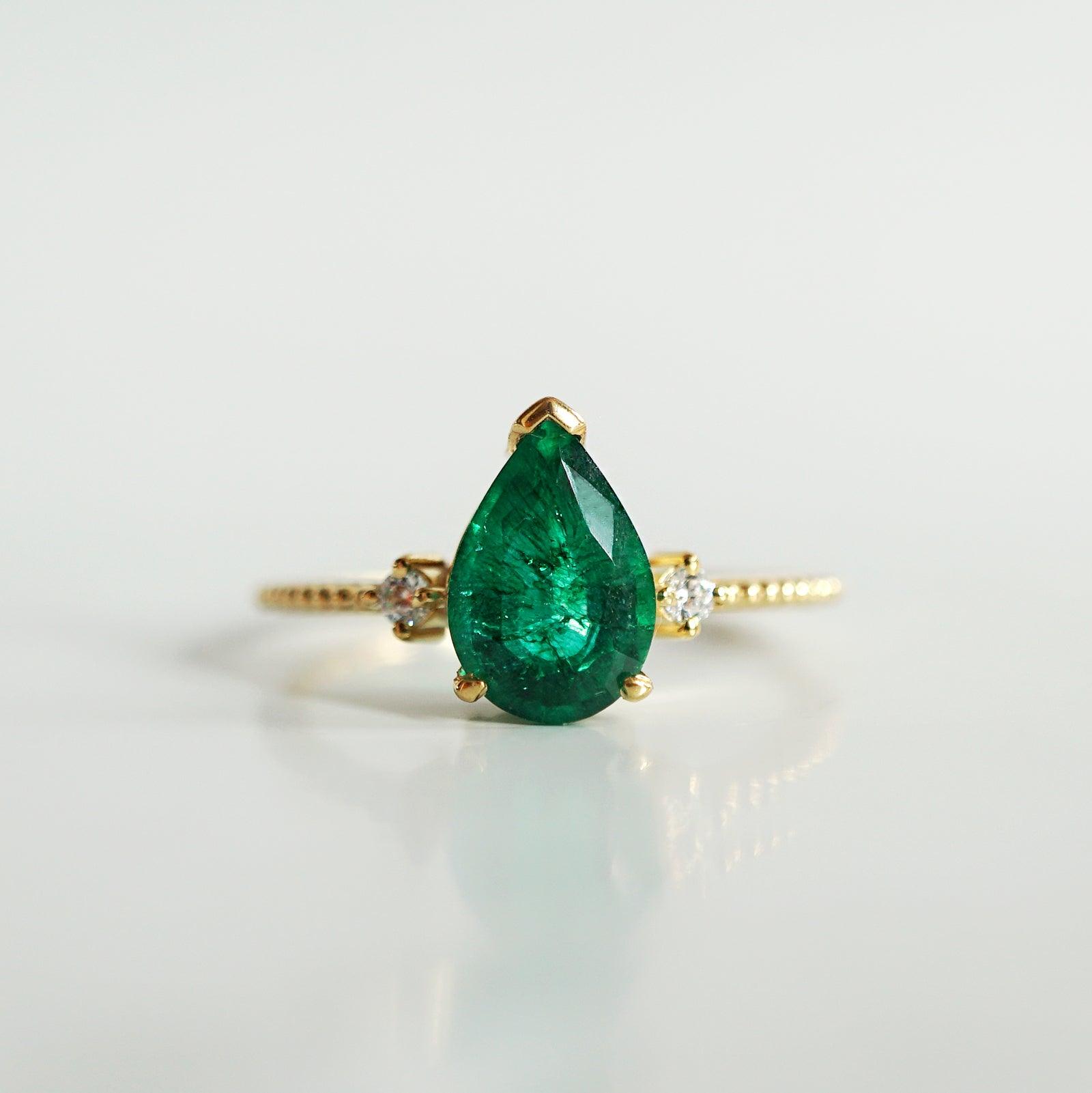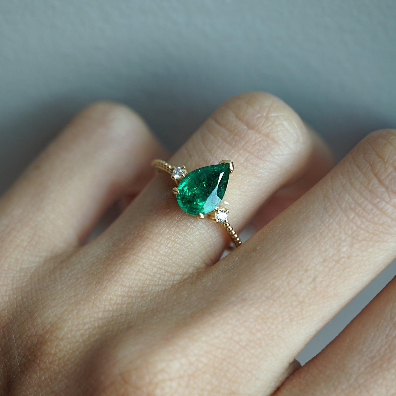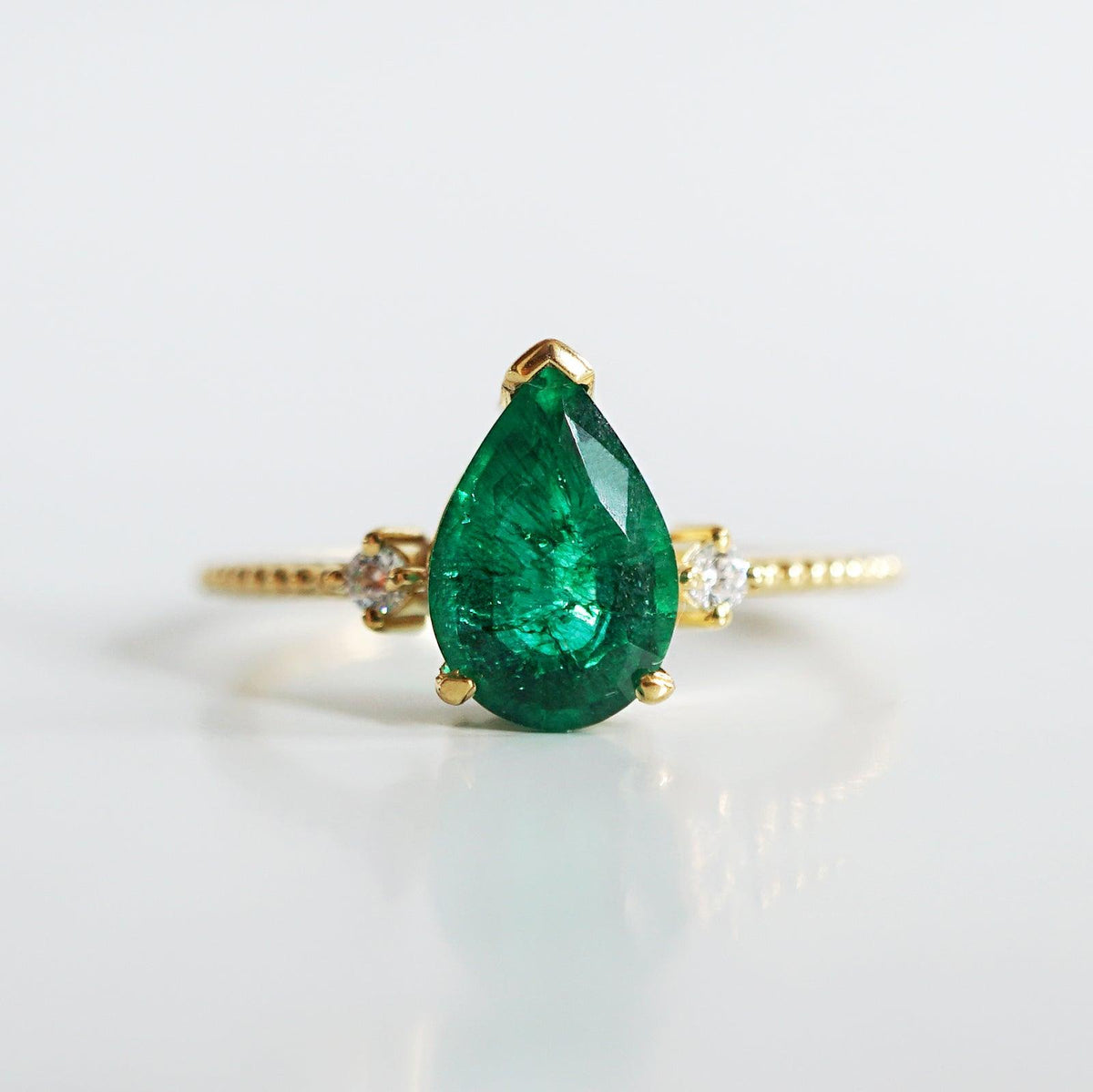 Feeling like royalty with the "14K Royalty Emerald pear ring". This stunner features a faceted pear natural emerald hugged by two white diamonds. Milgrain details channels a vintage vibe in this classic ring. The perfect piece as an engagement ring, or a gift to mark a milestone. Available in 14K yellow gold, rose gold, and white gold. This ring is designed and handcrafted in NYC.