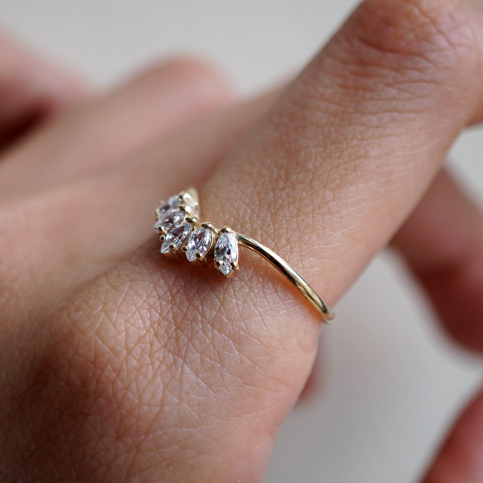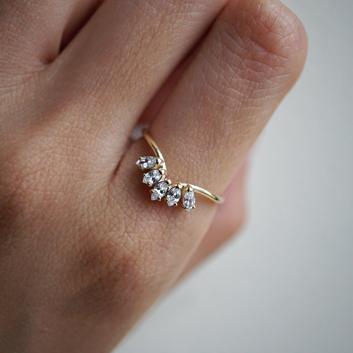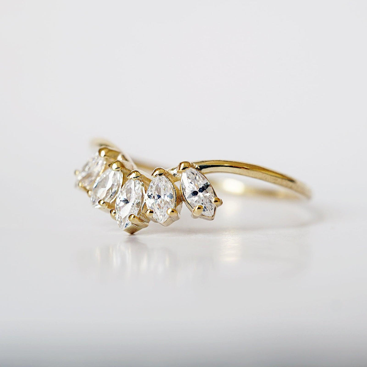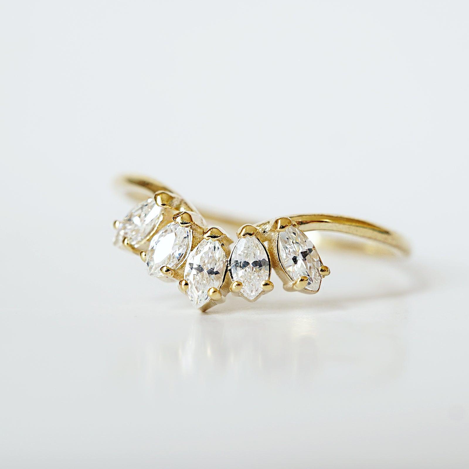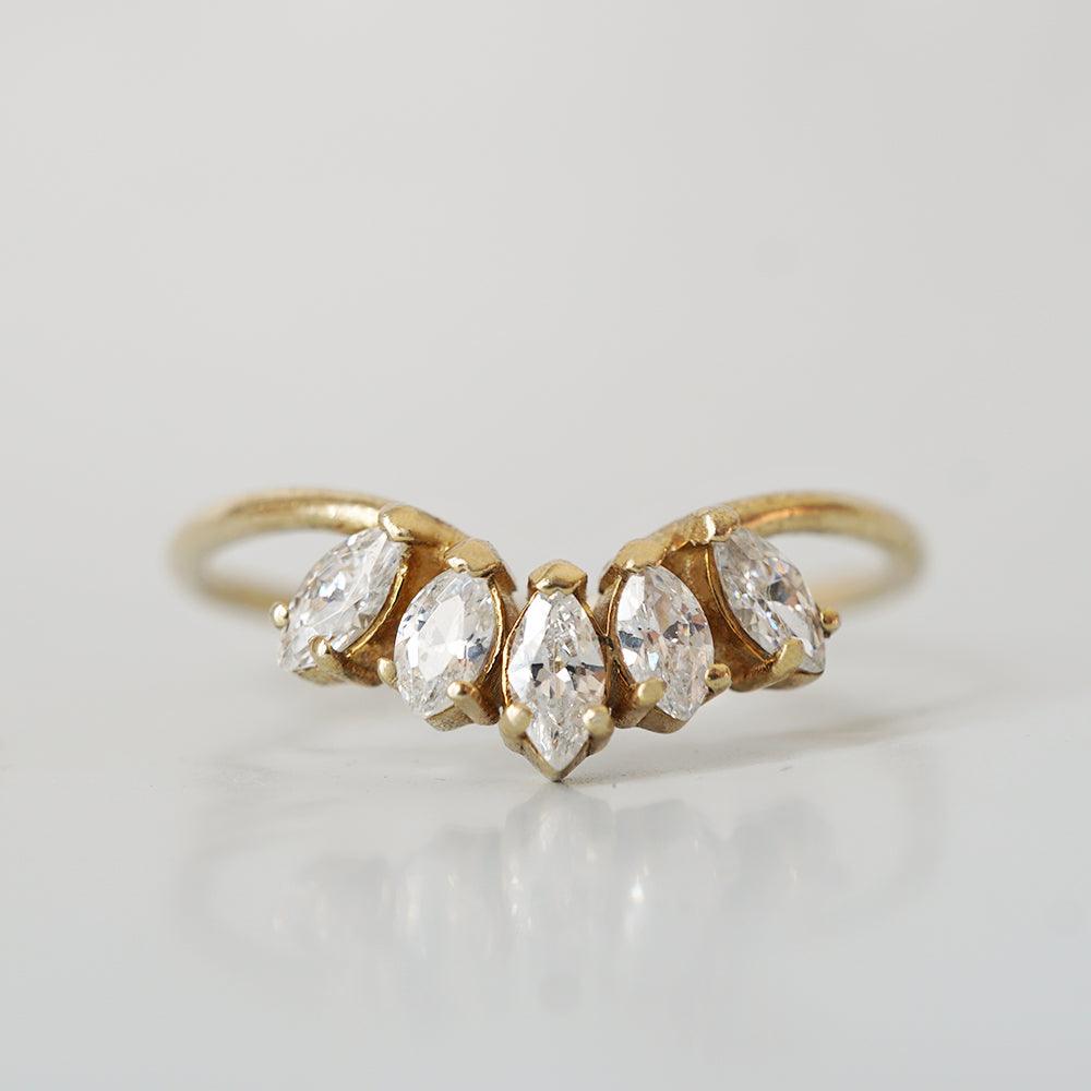 The Neptune Marquise Ring is an ethereal creation — a celestial curve of five shimmering marquise stones that glisten like stars across a golden horizon. Designed to pair effortlessly with any engagement ring or to shine beautifully on its own, it brings a touch of divine harmony to every hand.