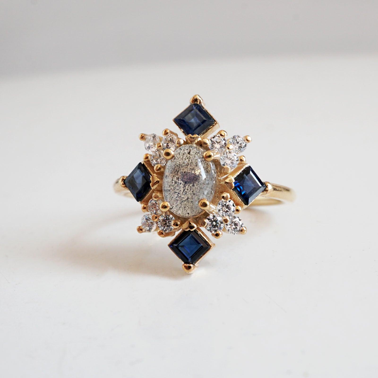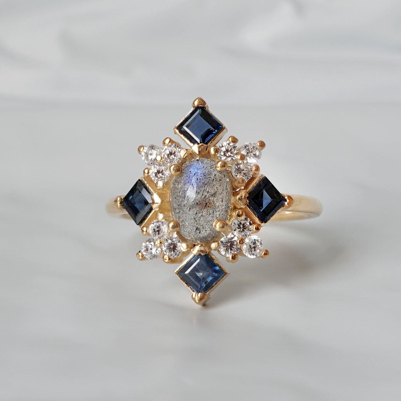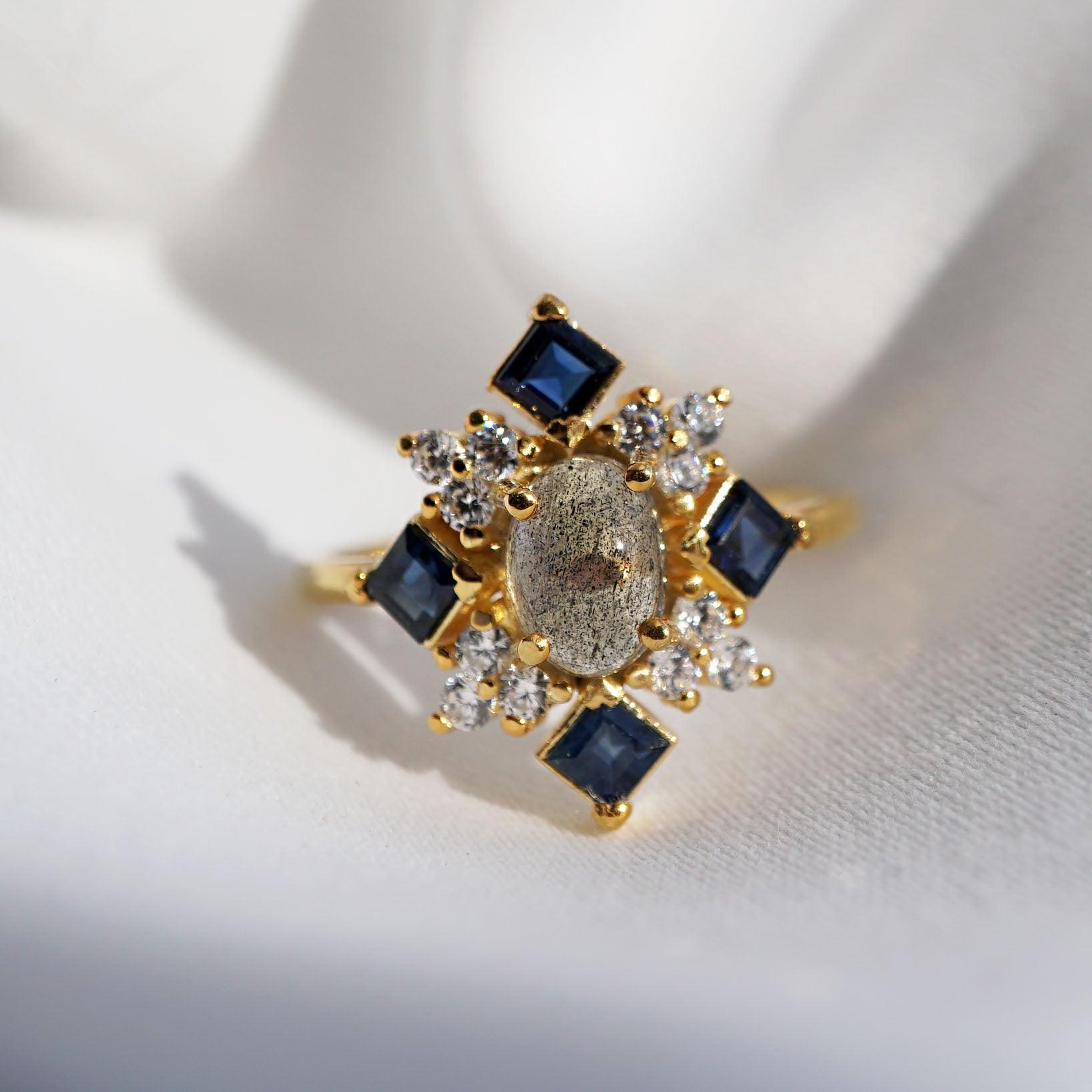 The Sapphire Labradorite Illuminati Diamond Ring is a luminous homage to the elegance of the Art Deco era. At its center glows a natural oval labradorite, its shifting iridescence reflecting shades of stormy blue and gold. Four deep blue sapphires frame the stone, adding balance, contrast, and vintage allure.