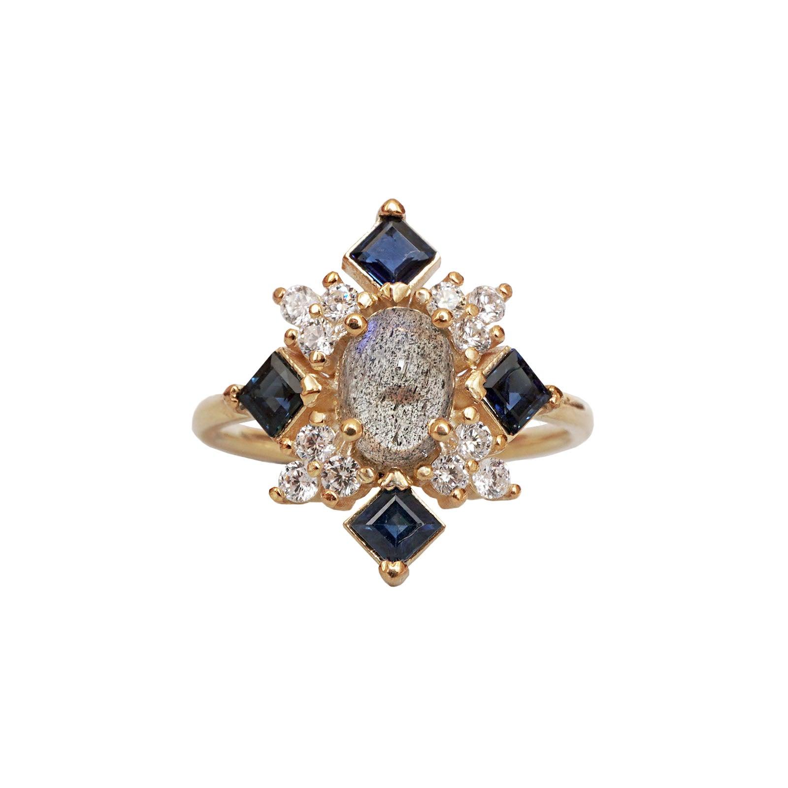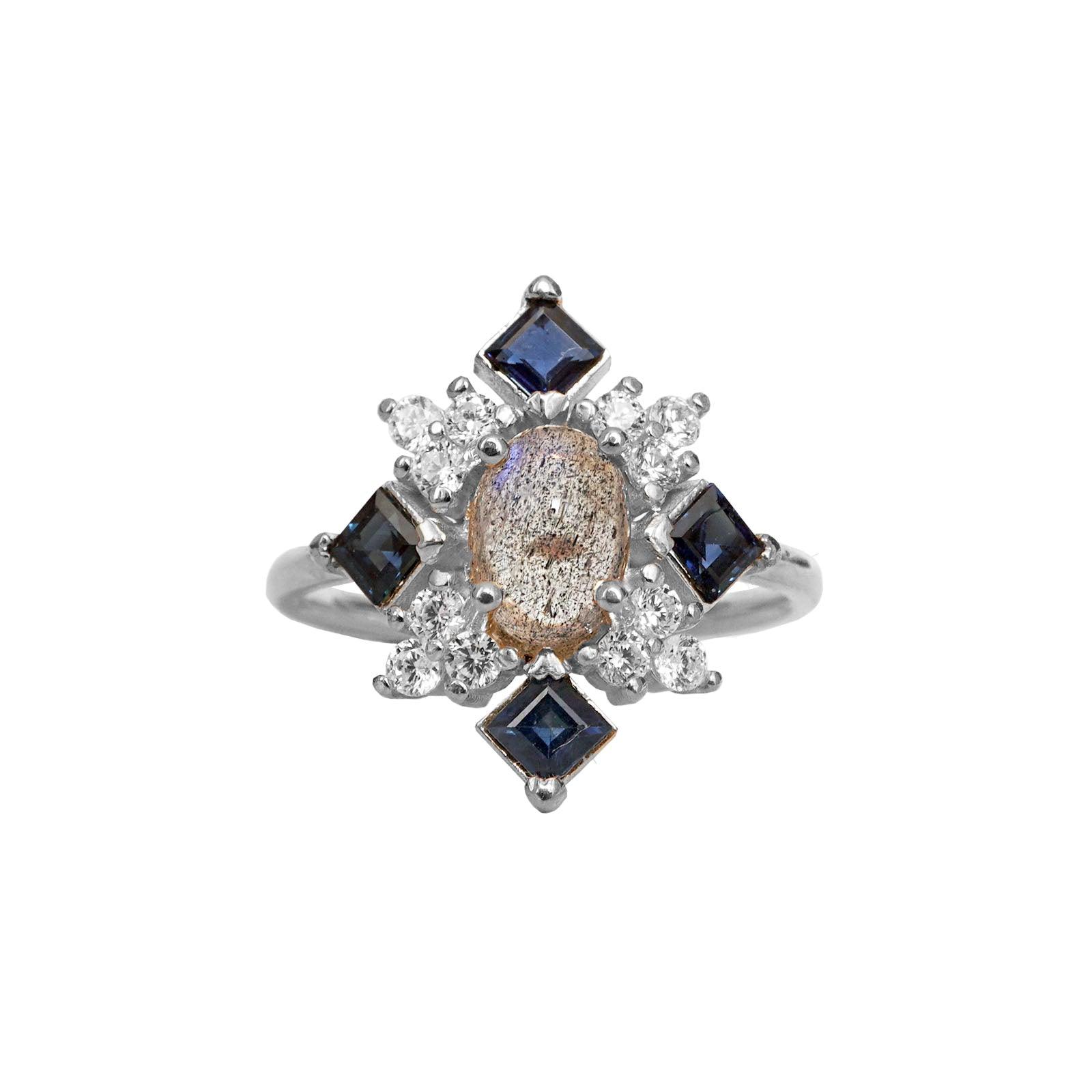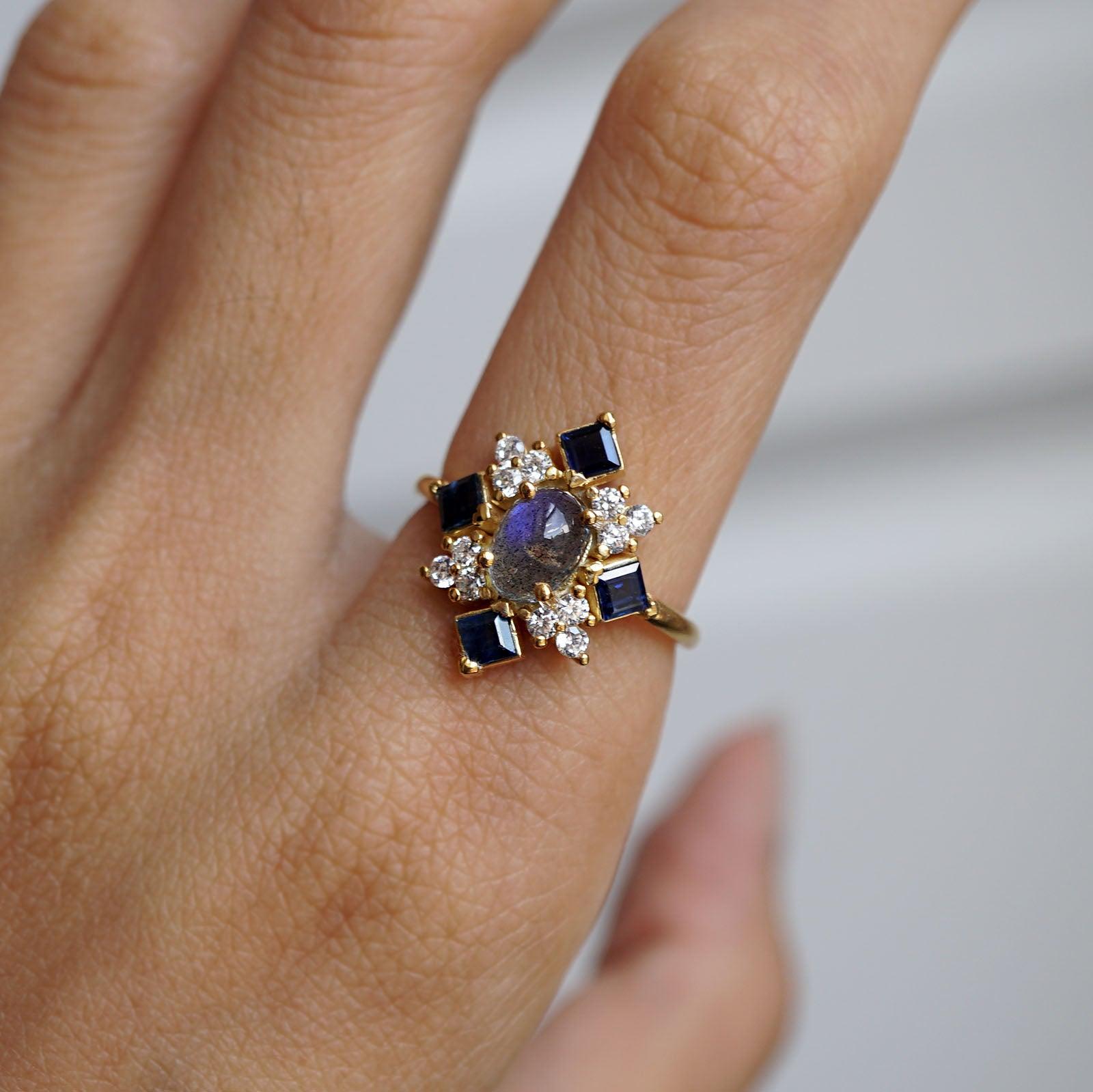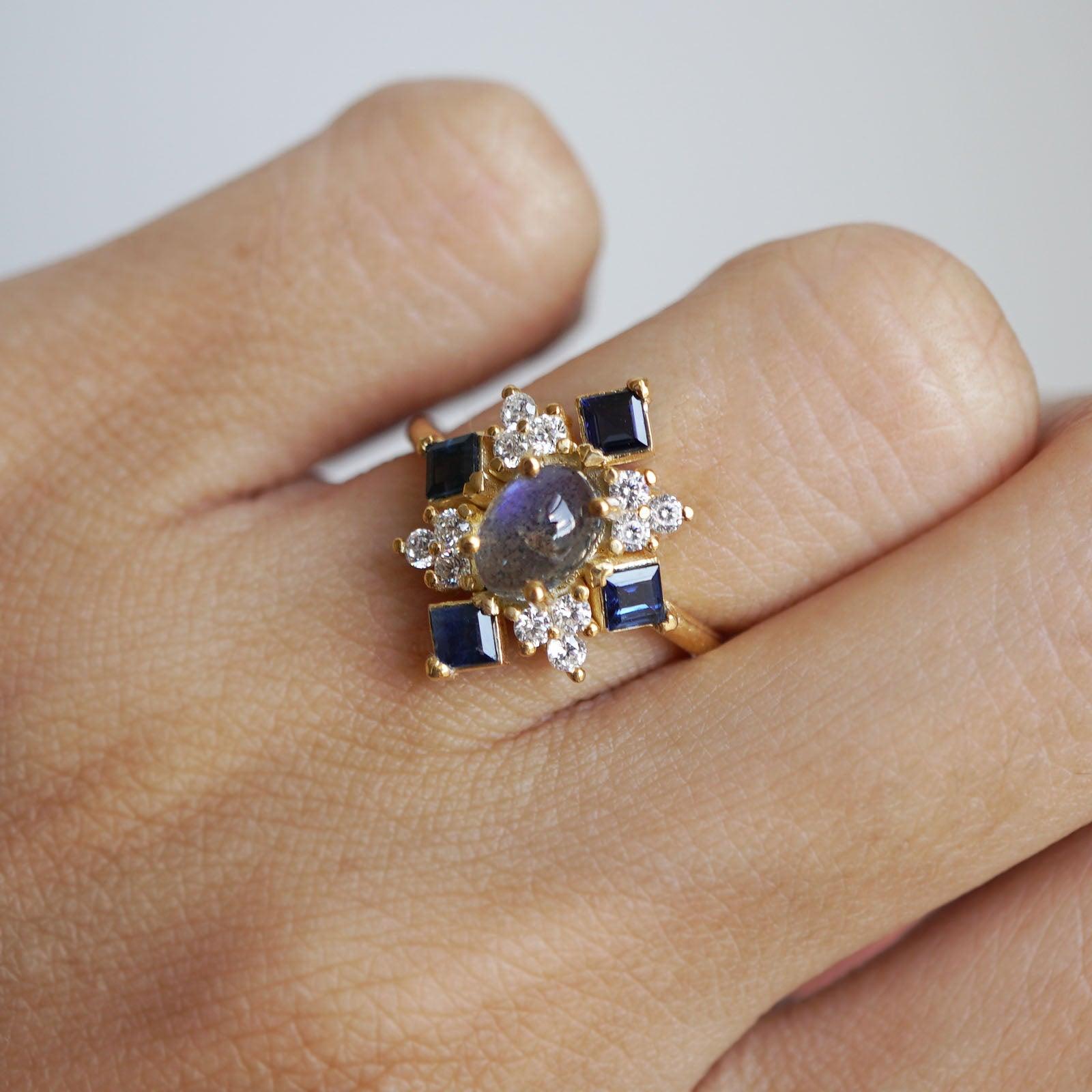 The Sapphire Labradorite Illuminati Diamond Ring is a luminous homage to the elegance of the Art Deco era. At its center glows a natural oval labradorite, its shifting iridescence reflecting shades of stormy blue and gold. Four deep blue sapphires frame the stone, adding balance, contrast, and vintage allure.