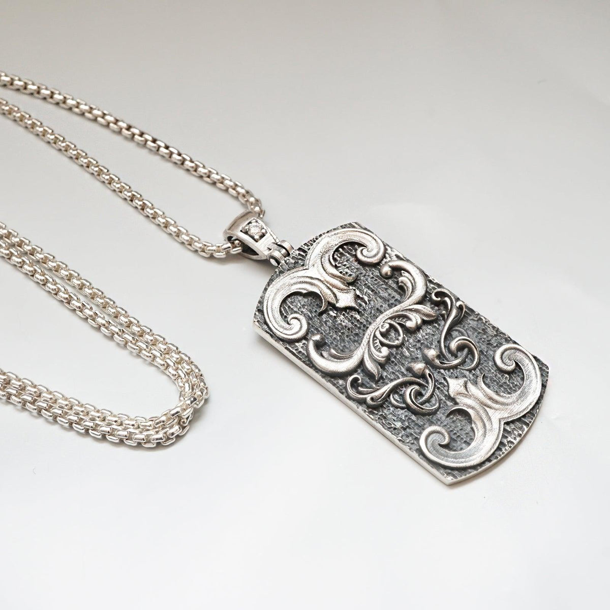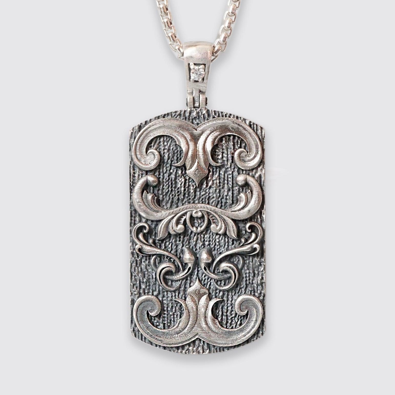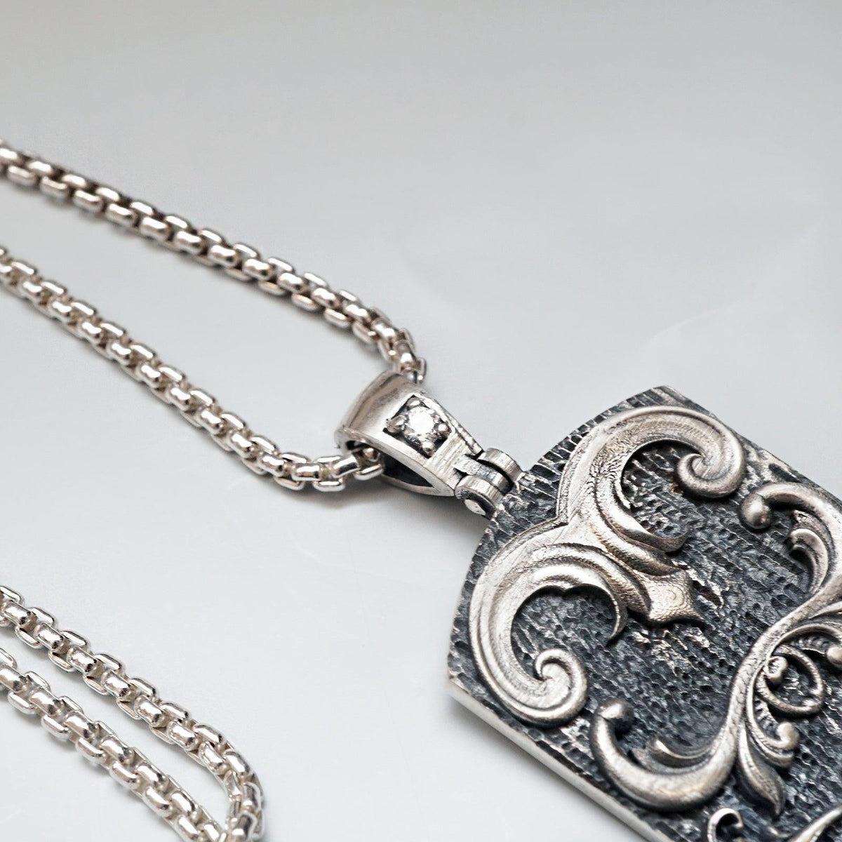 Inspired by Henry II of France's parade armor. This pendant features decoration from the armor he wore. Made in sterling silver with oxidization, and a 2mm natural white diamond.