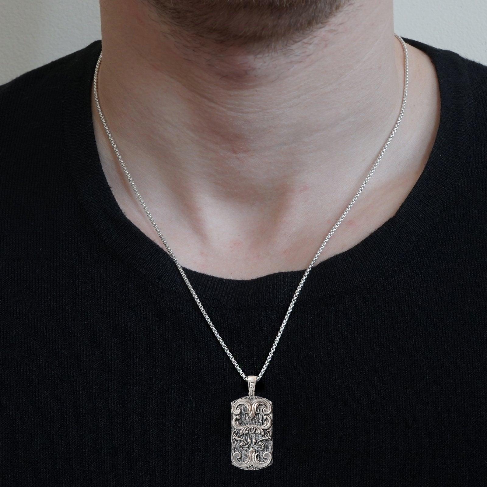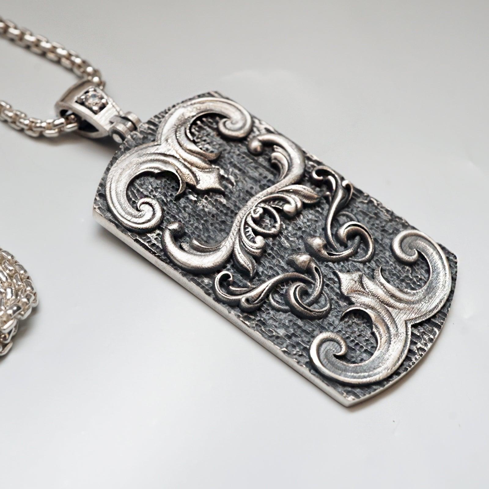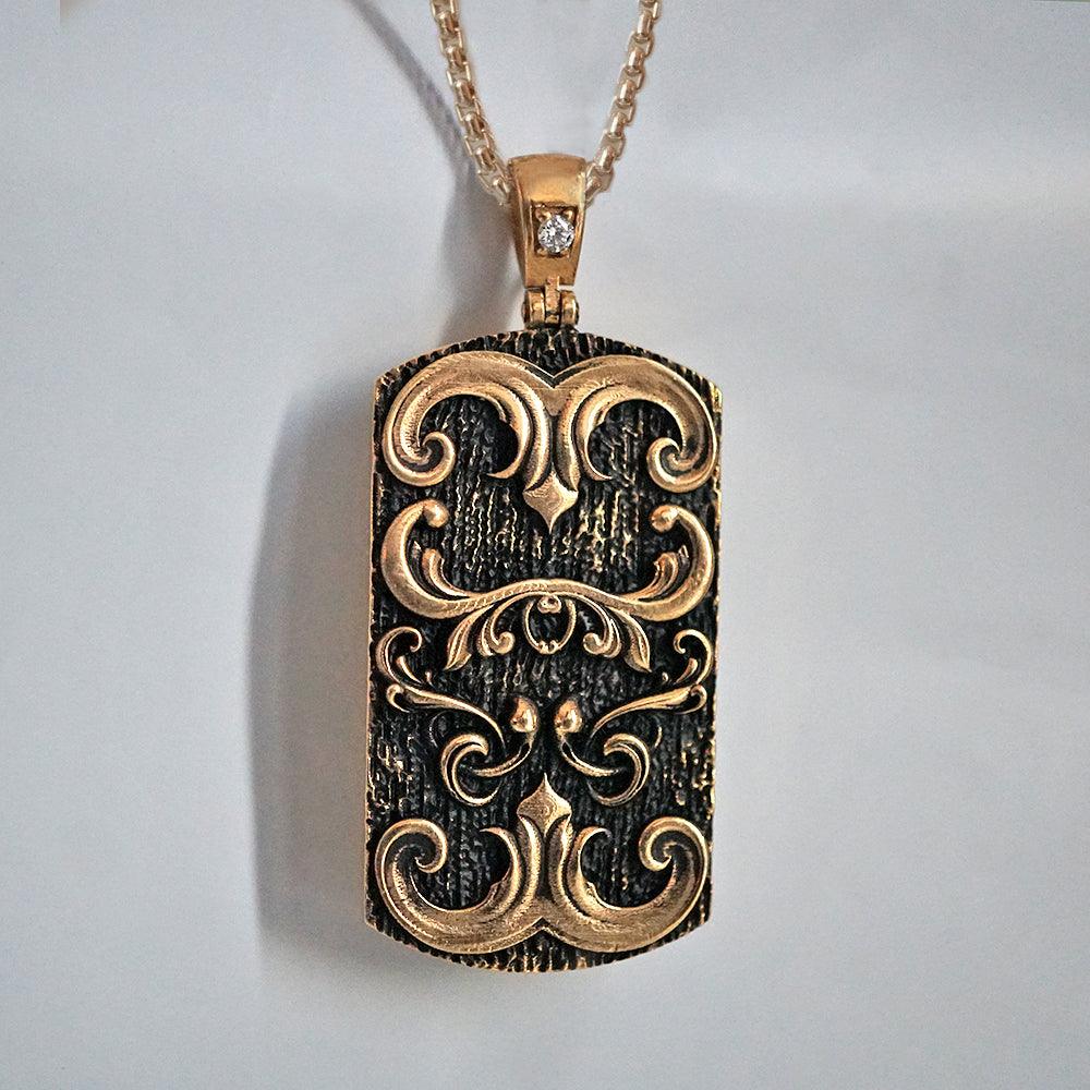Inspired by Henry II of France's parade armor. This pendant features decoration from the armor he wore. Made in sterling silver with oxidization, and a 2mm natural white diamond.