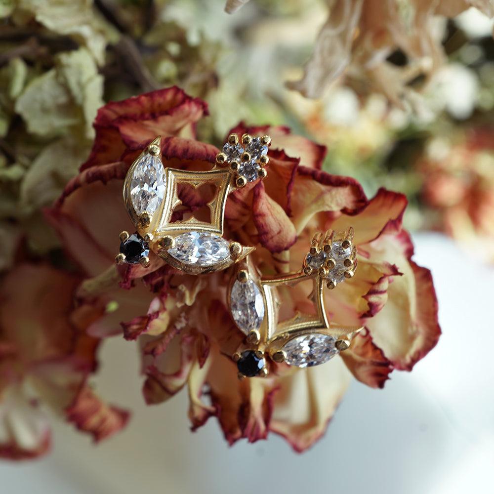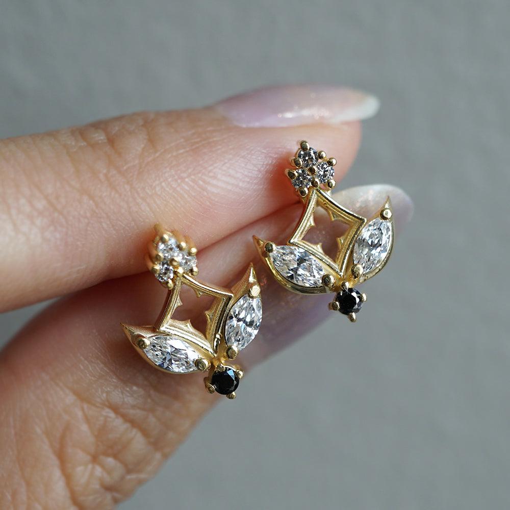 Each stud is embellished with two natural black diamonds, their dark shimmer adding depth and mystery. Paired with white natural diamonds, the contrast mimics the interplay of shadow and light found in ancient stonework illuminated by candlelit halls. Choose between your choice of natural diamonds or CZ.