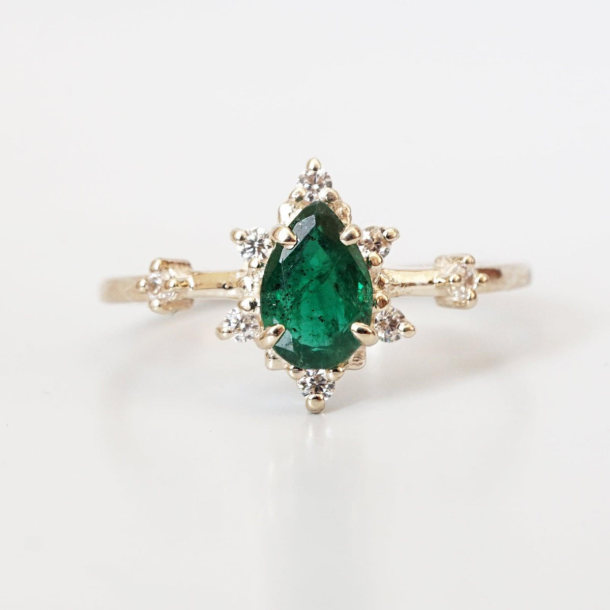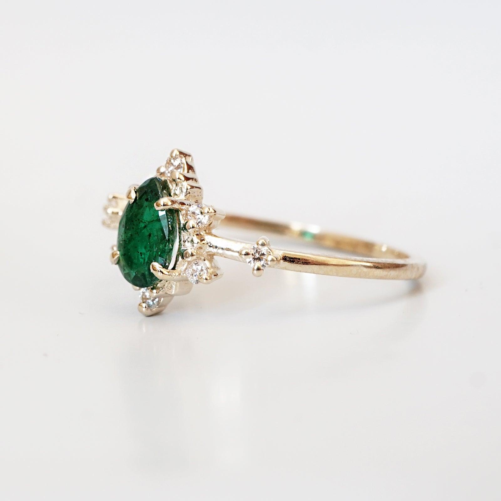 A ring of wisdom, truth, and love. The Crush ring features a stunning natural emerald set in 14K solid gold. Available in 14K solid yellow gold, rose gold and white gold with cz or natural white diamonds. It can be paired with our other ring bands. All natural emeralds are one of a kind.