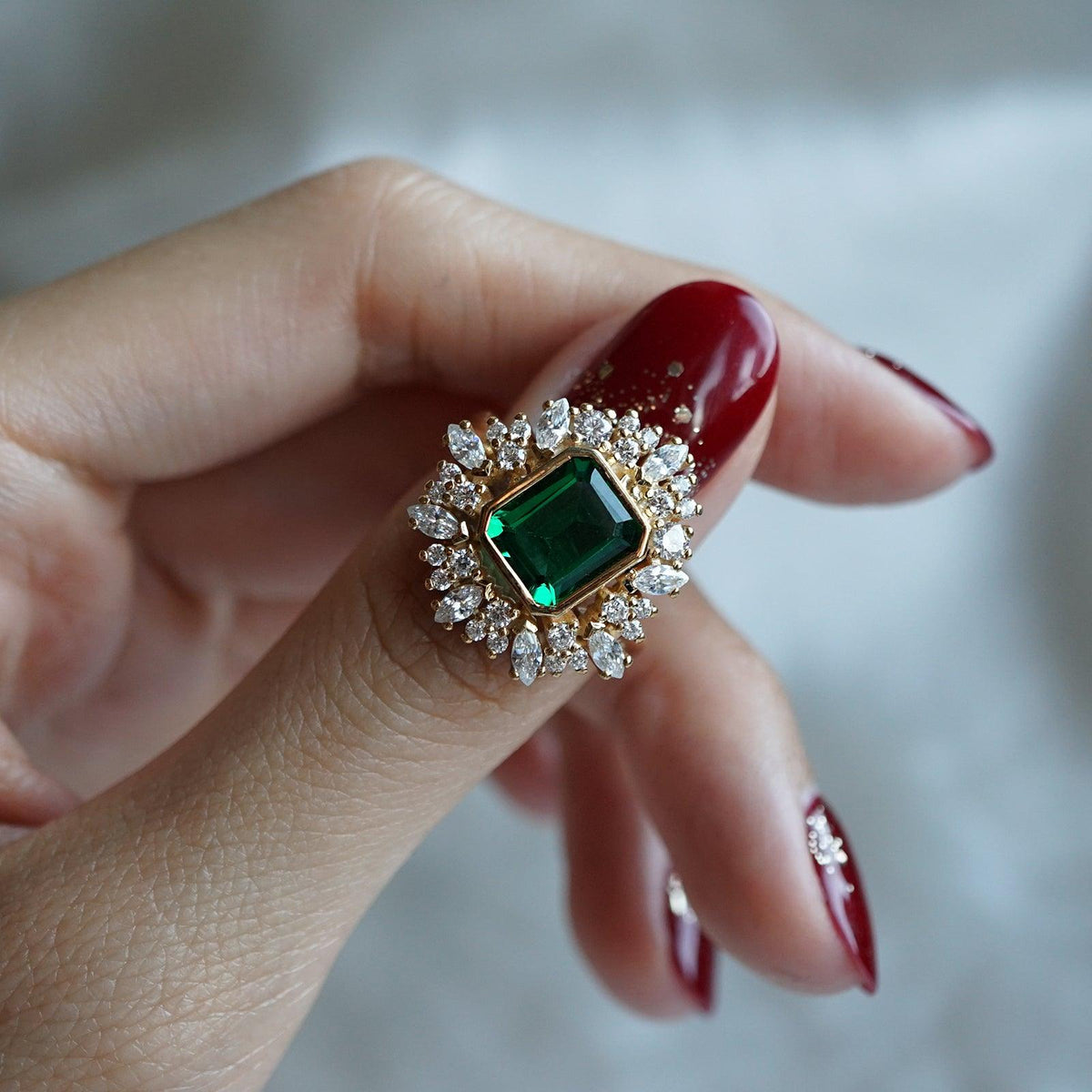 Inspired by the sheer beauty and wonder of nature, our Forbidden Garden Emerald Diamond Ring is a true embodiment of royal class and elegance. It features a luxurious mix of marquise and round diamonds, delicately surrounding a bezel-set natural emerald.