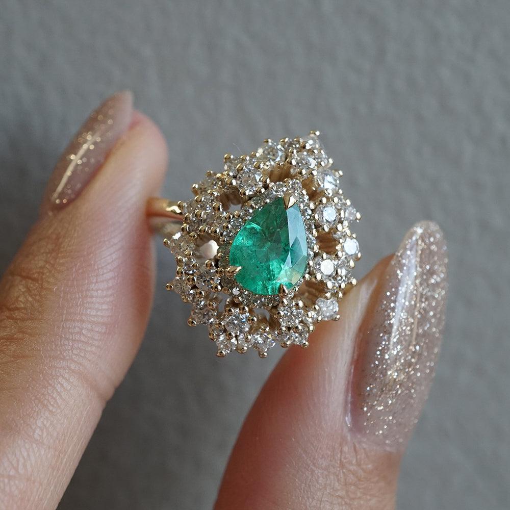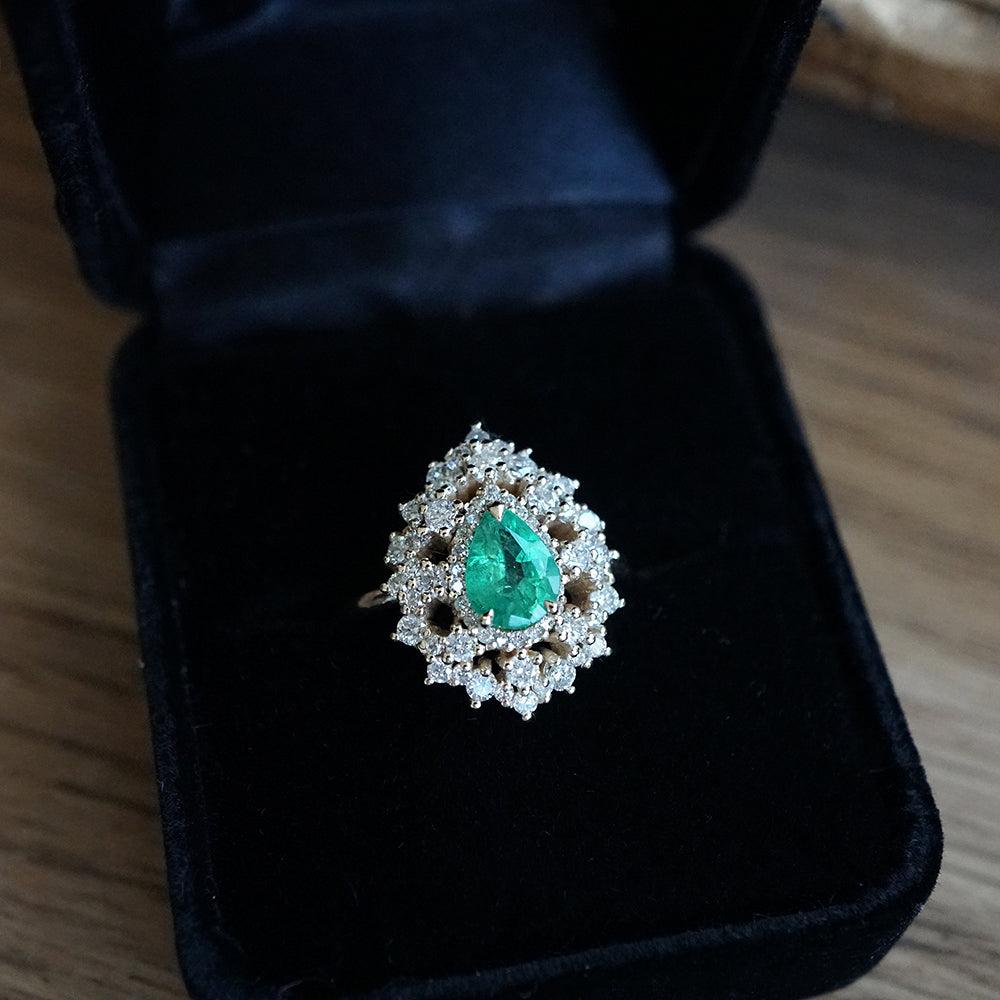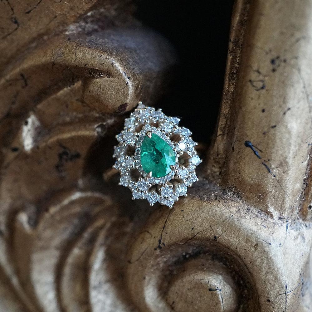 At its heart glows a luminous natural pear emerald, crowned by a halo of nearly one carat of natural white diamonds. Each facet catches the light like dewdrops through the trees, radiating timeless grace and quiet power.