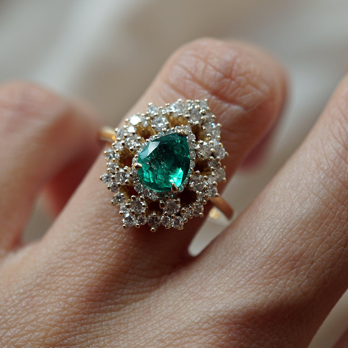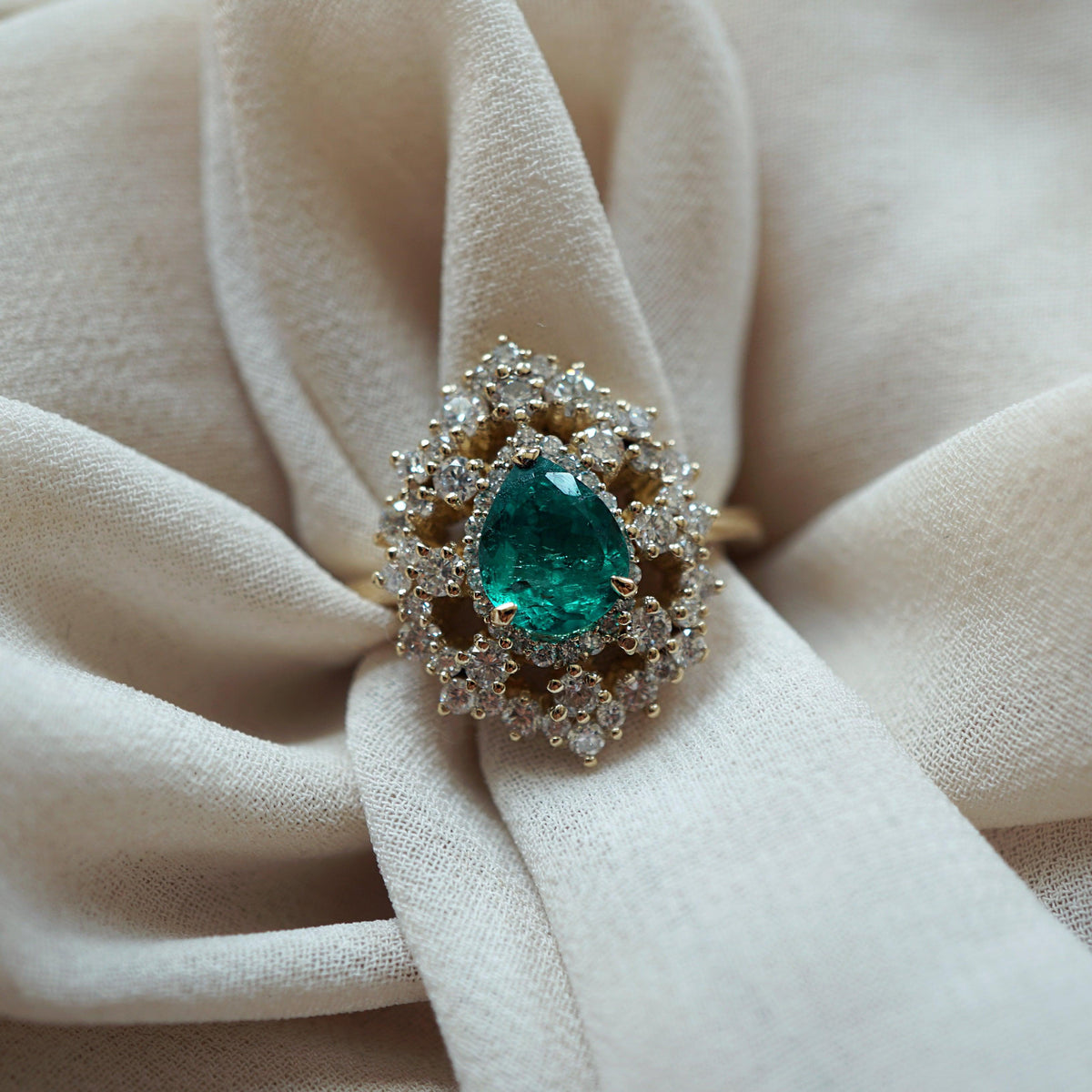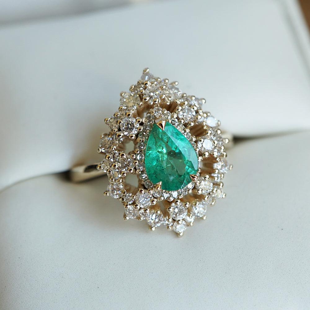 At its heart glows a luminous natural pear emerald, crowned by a halo of nearly one carat of natural white diamonds. Each facet catches the light like dewdrops through the trees, radiating timeless grace and quiet power.