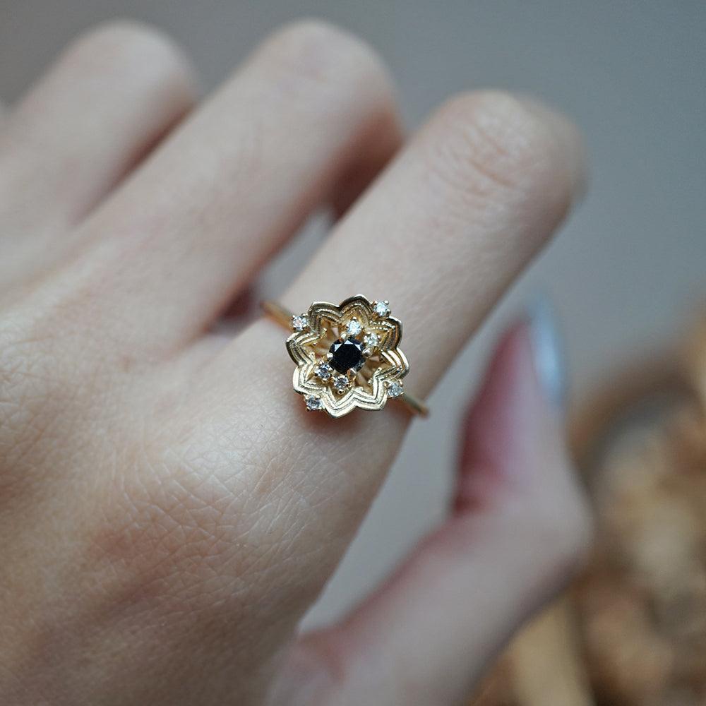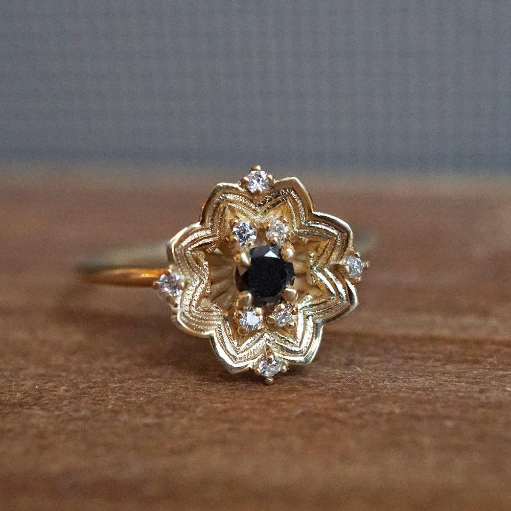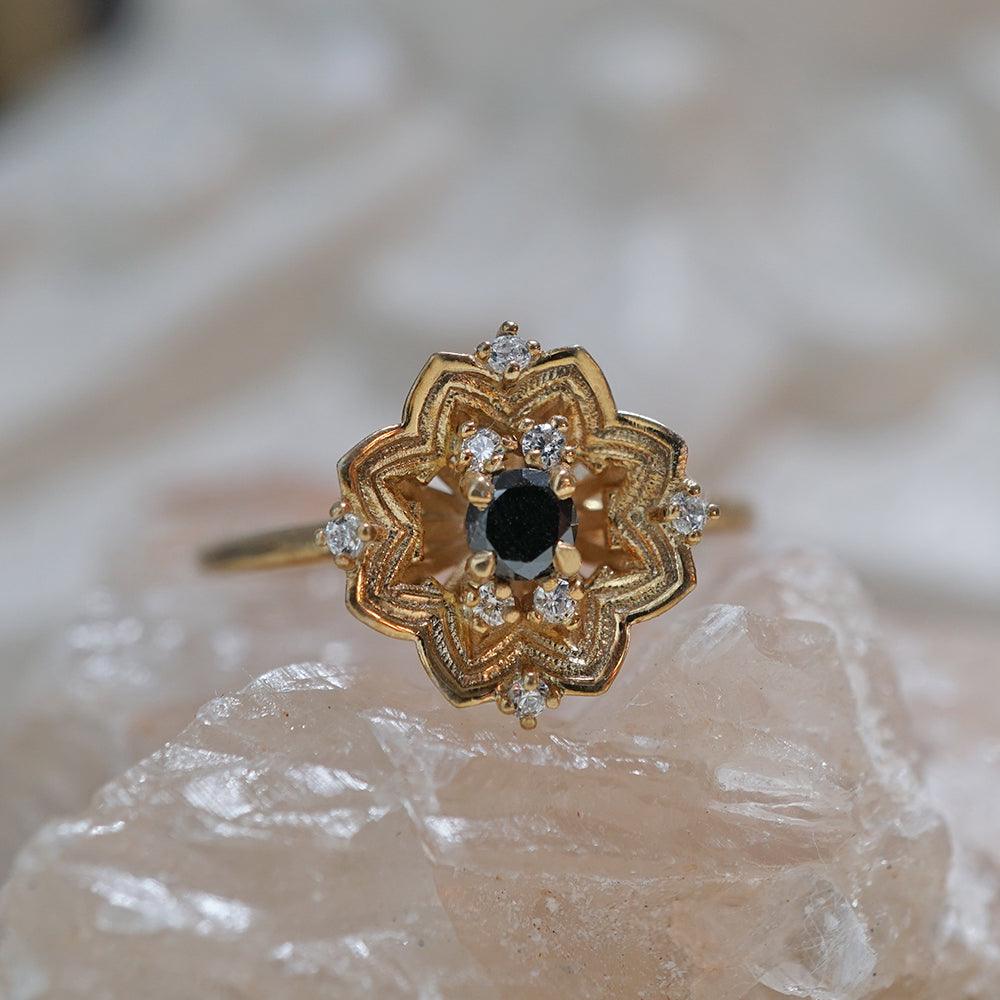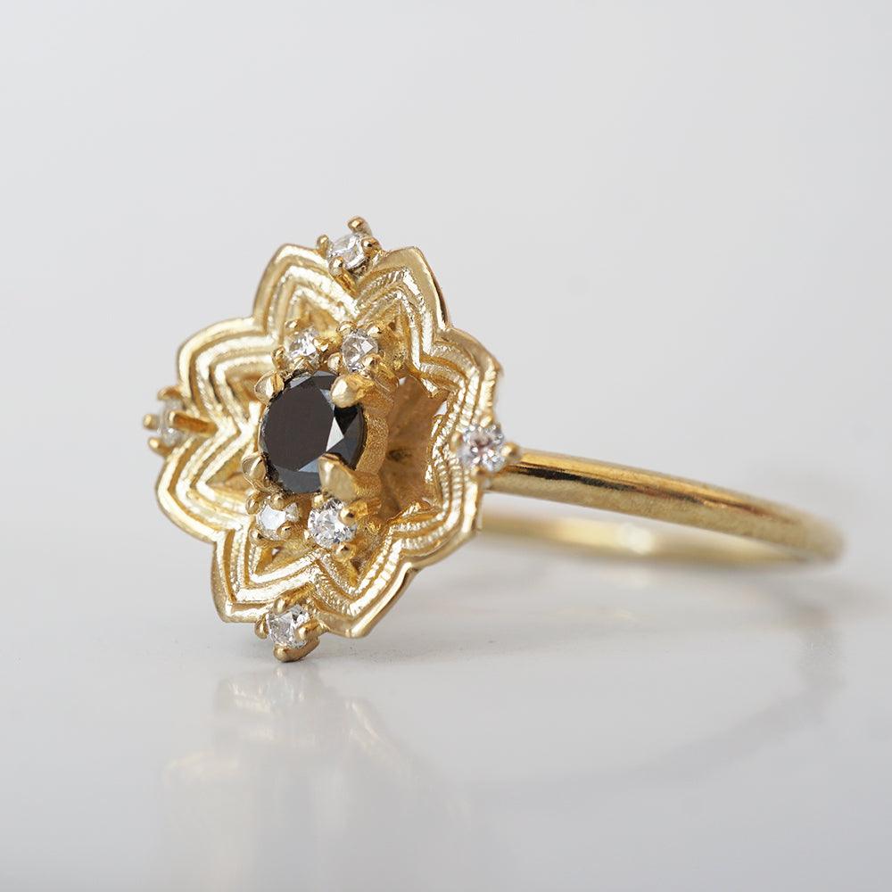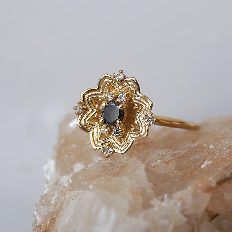 Gothic Rose Window Black Diamond Ring in 14K and 18K Gold