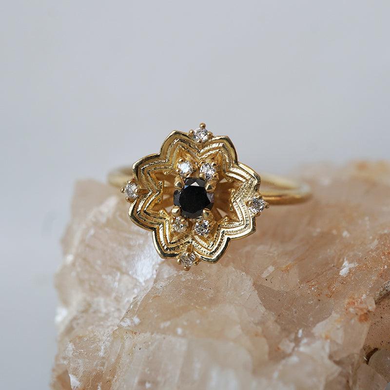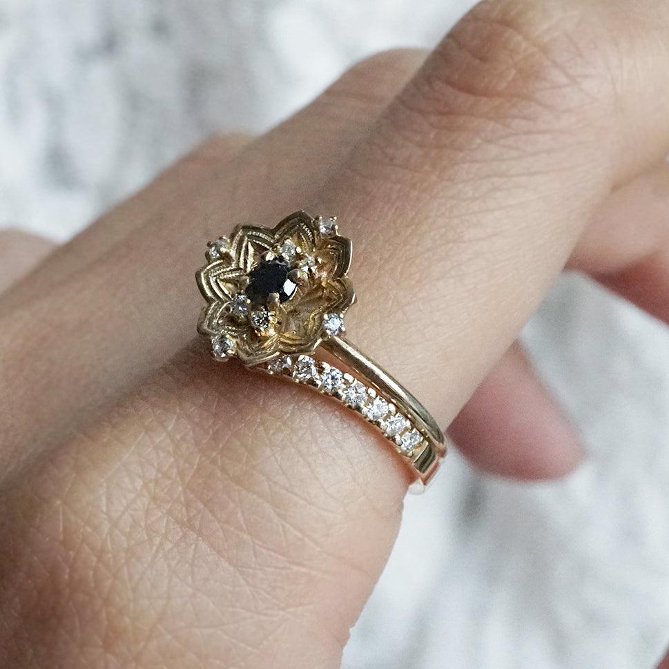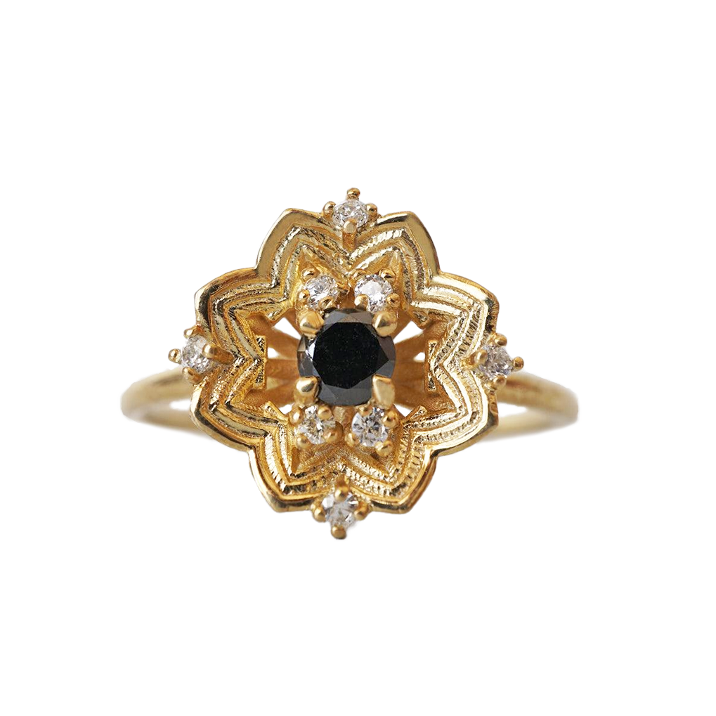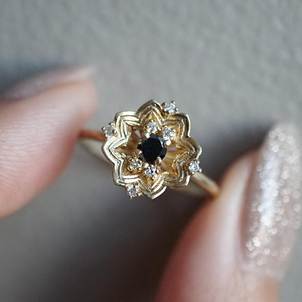 Gothic Rose Window Black Diamond Ring in 14K and 18K Gold