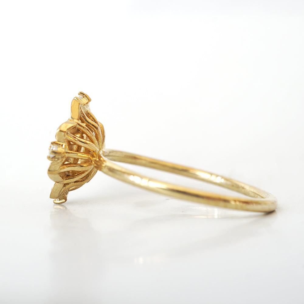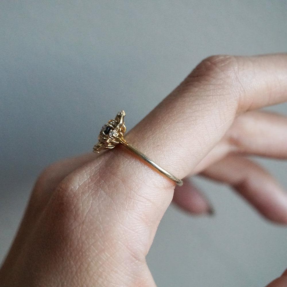 Handcrafted in 14K and 18K solid gold, this ring is a quiet masterpiece—romantic, architectural, and deeply evocative. A piece for those who love jewelry with soul, shadow, and story.