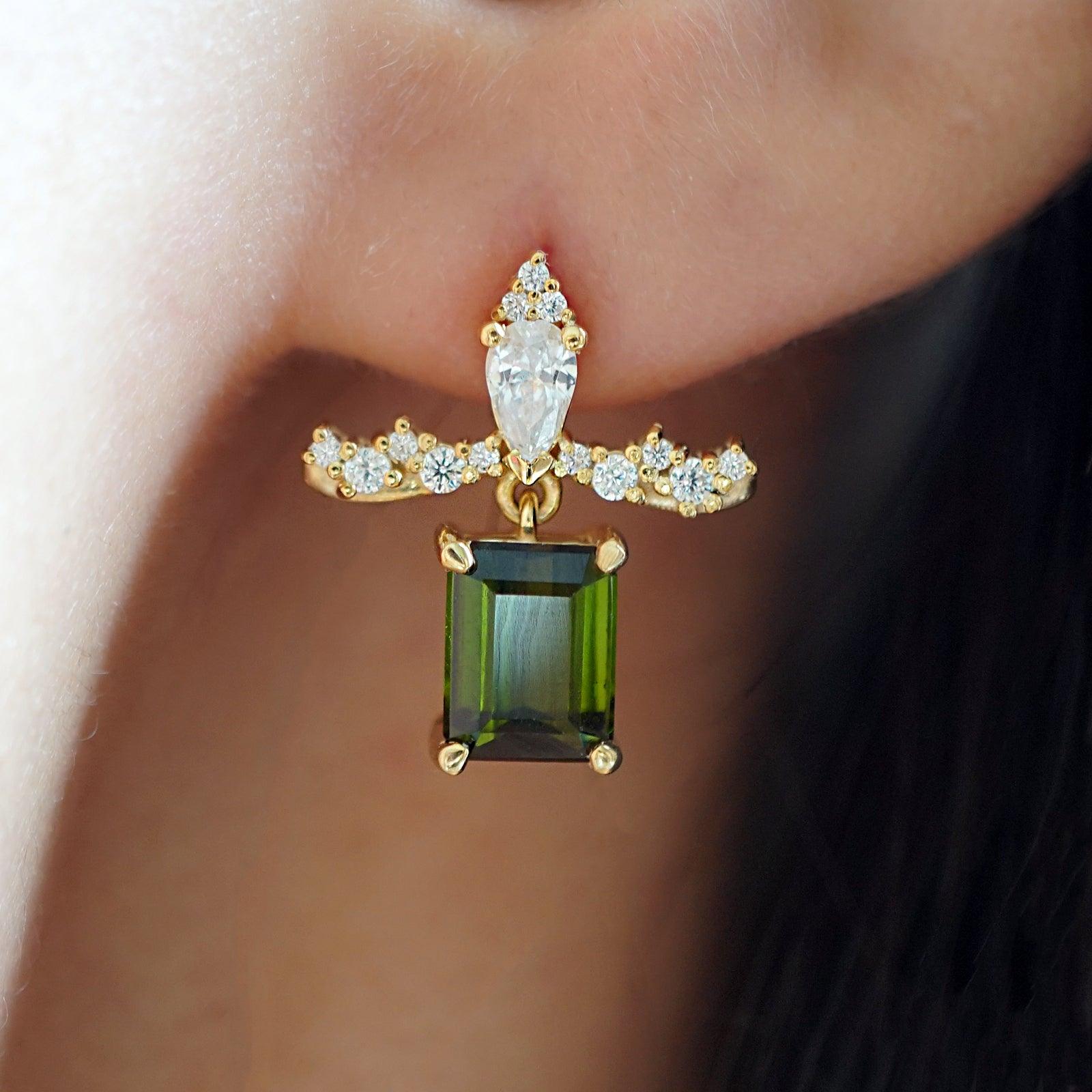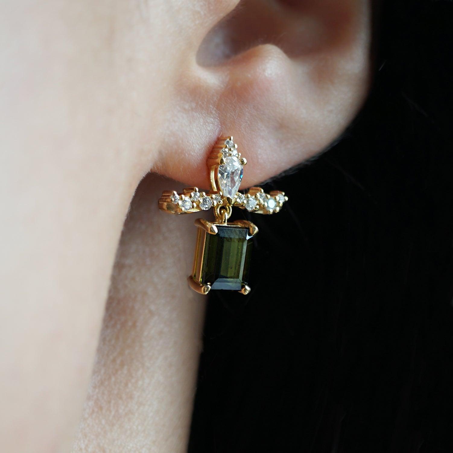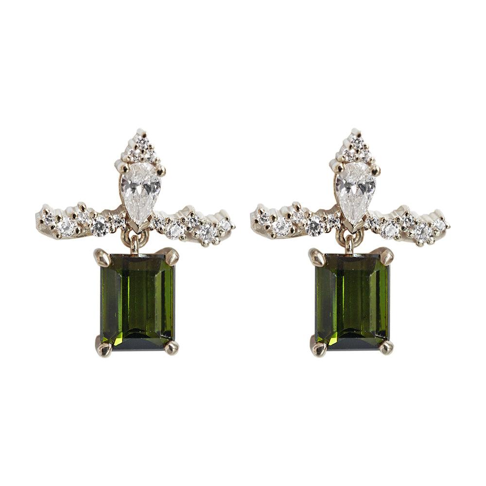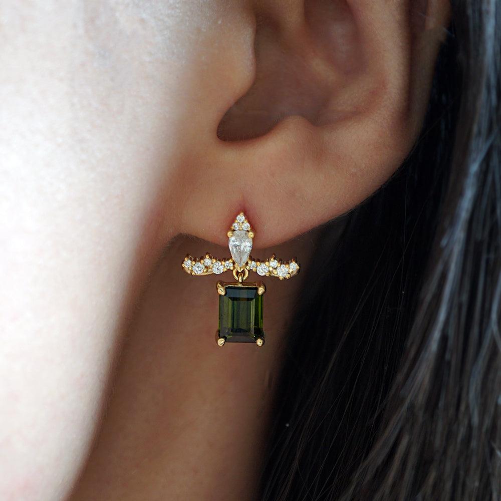 The Green Tourmaline Florence Earrings embody the romance and artistry of Florence — a city where beauty and craftsmanship intertwine. Each earring features a striking emerald-cut green tourmaline, surrounded by a halo of sparkling white stones, creating a look that’s both sophisticated and regal.