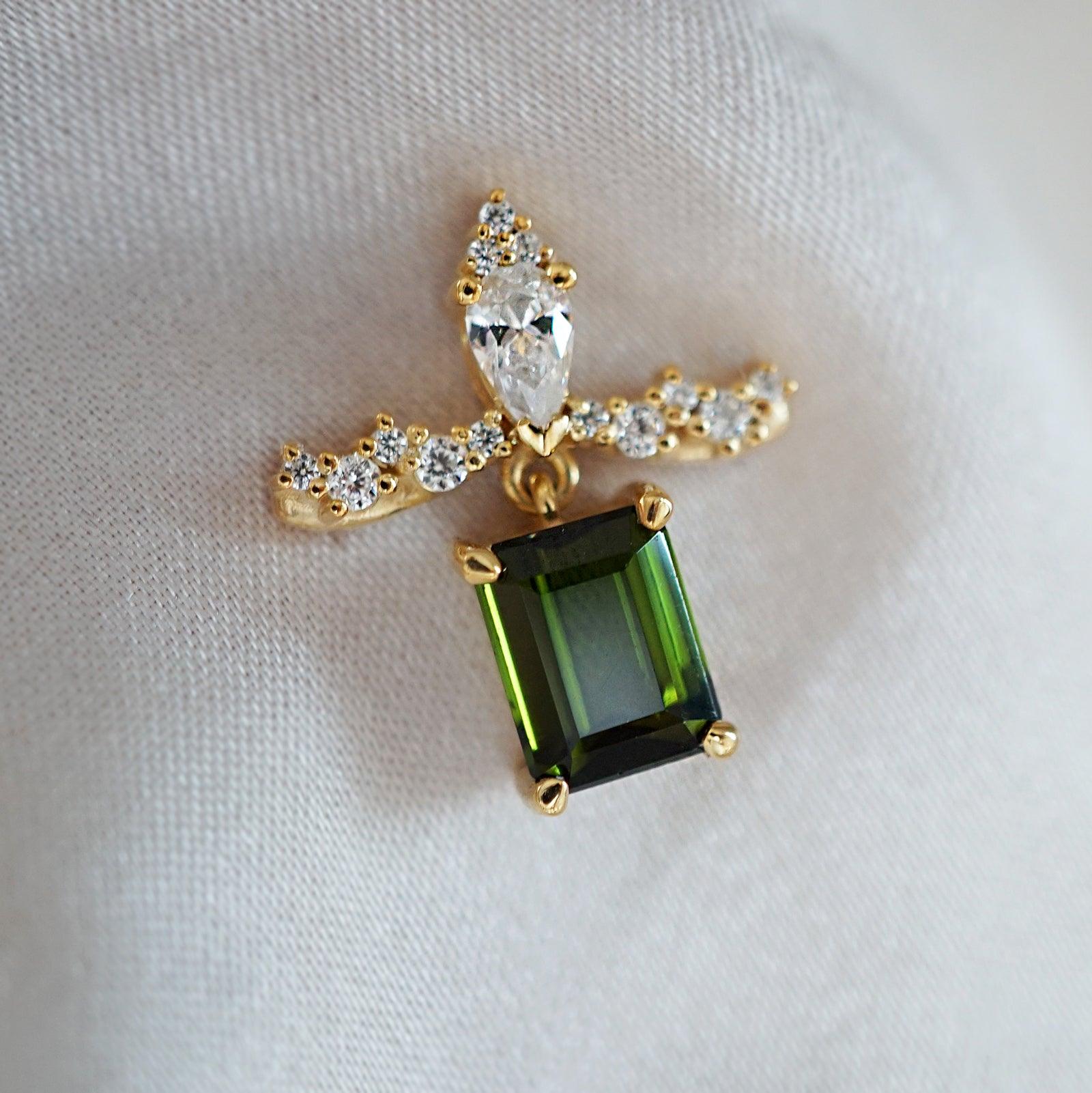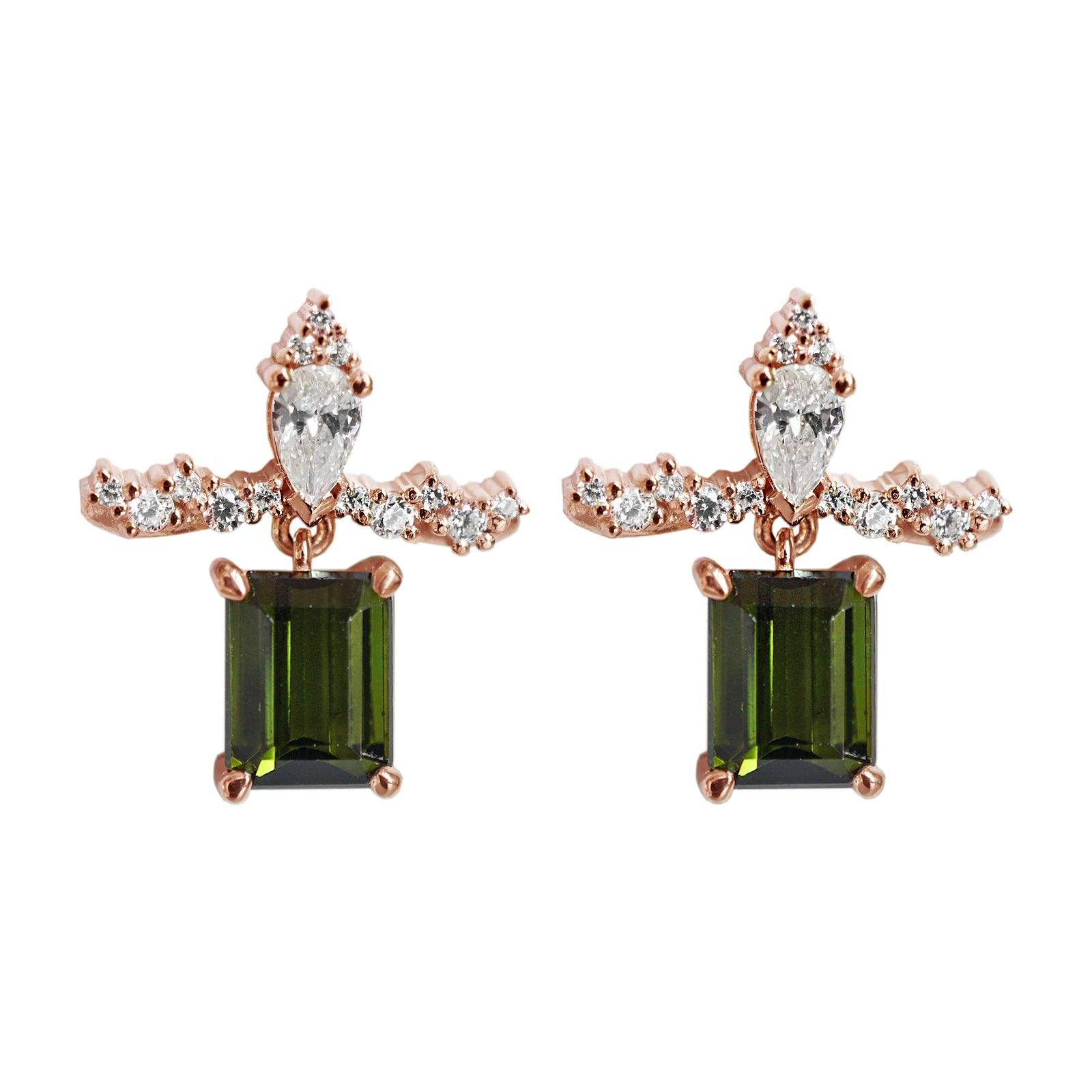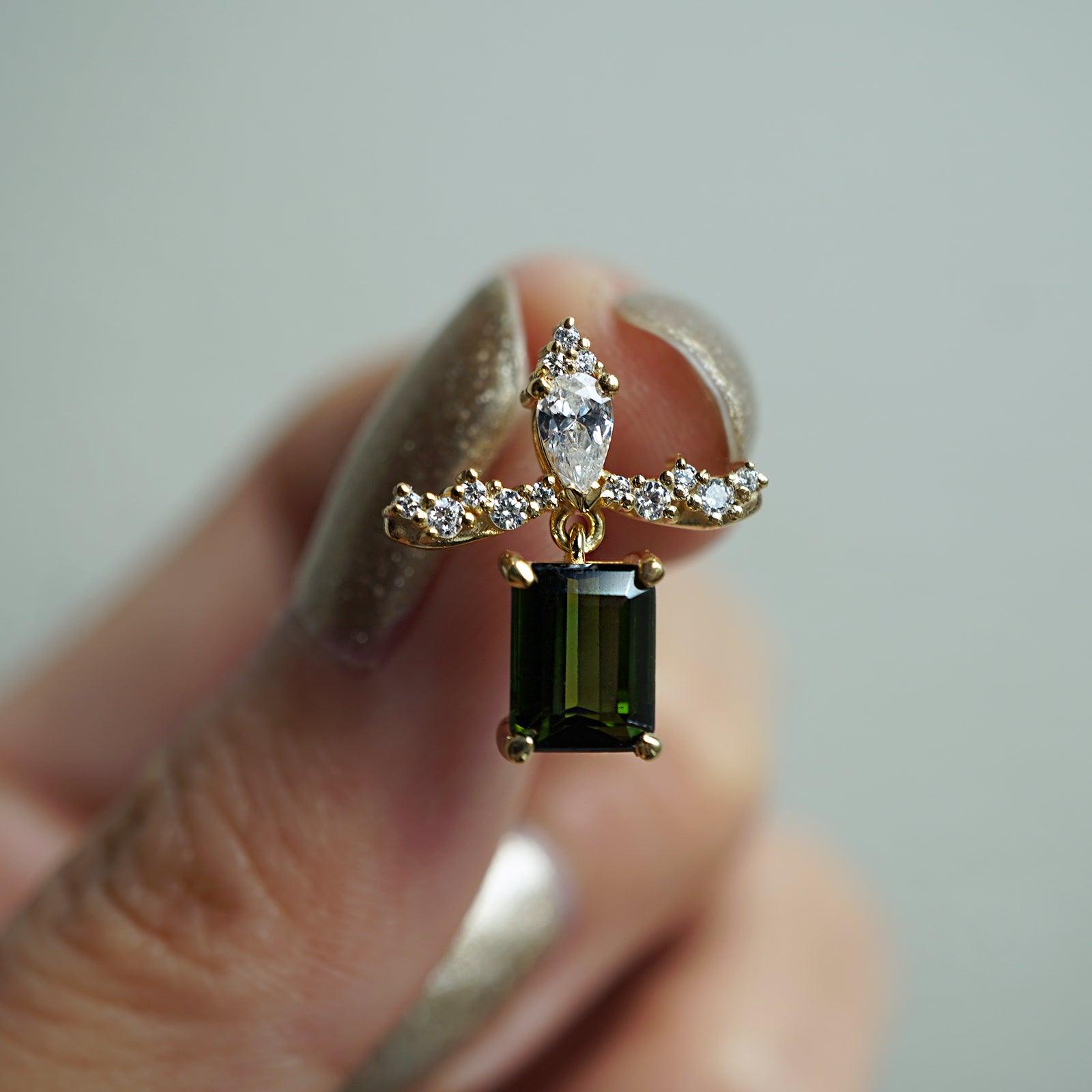 The Green Tourmaline Florence Earrings embody the romance and artistry of Florence — a city where beauty and craftsmanship intertwine. Each earring features a striking emerald-cut green tourmaline, surrounded by a halo of sparkling white stones, creating a look that’s both sophisticated and regal.