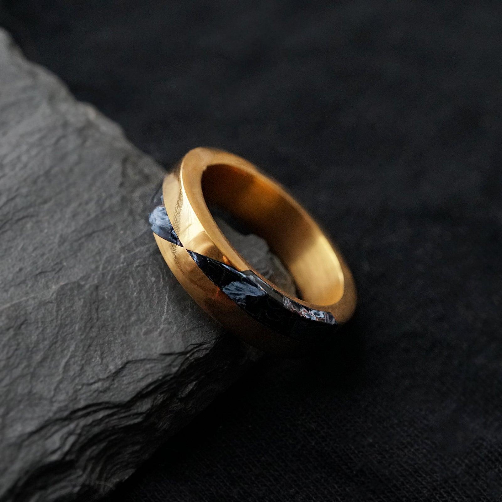The Grid Pietersite Ring captures the essence of a storm — movement, power, and transformation frozen in stone. Two natural pietersite gemstones are custom-cut and inlaid into the metal, creating a bold geometric composition that celebrates both strength and artistry.