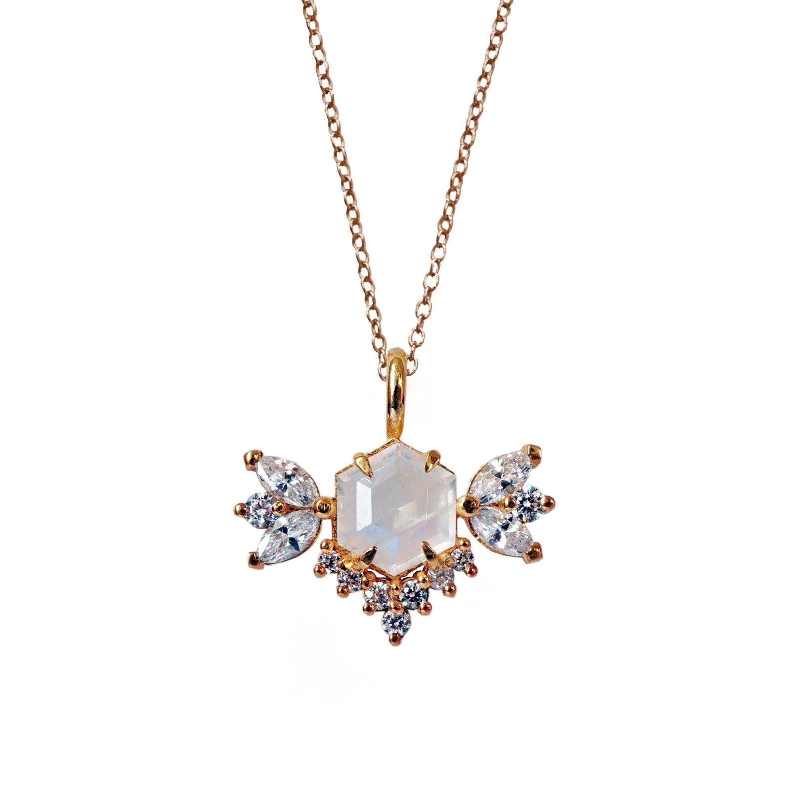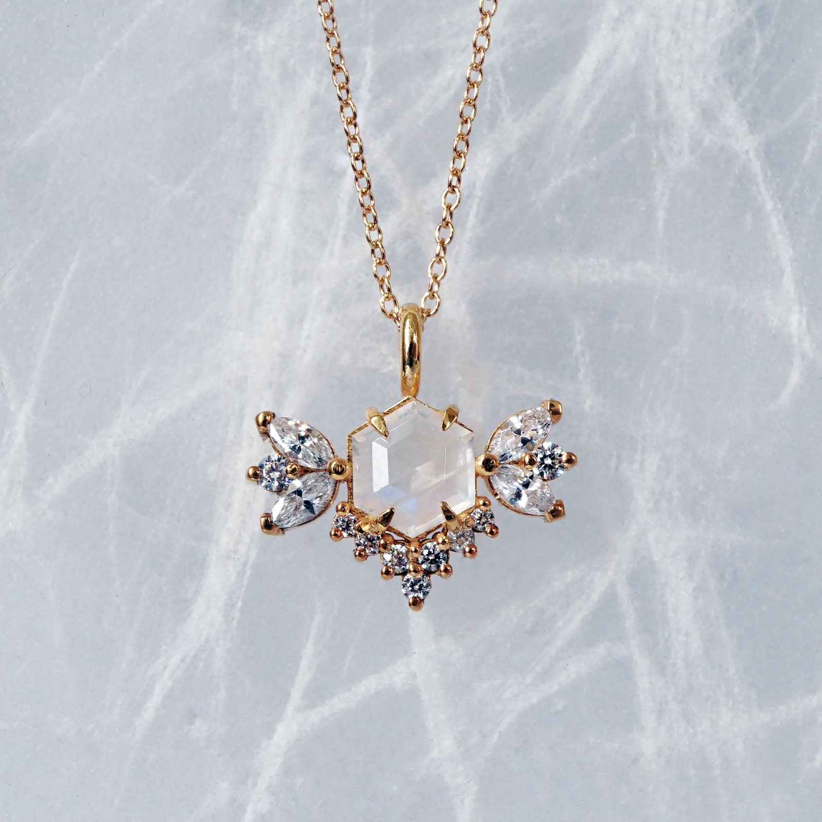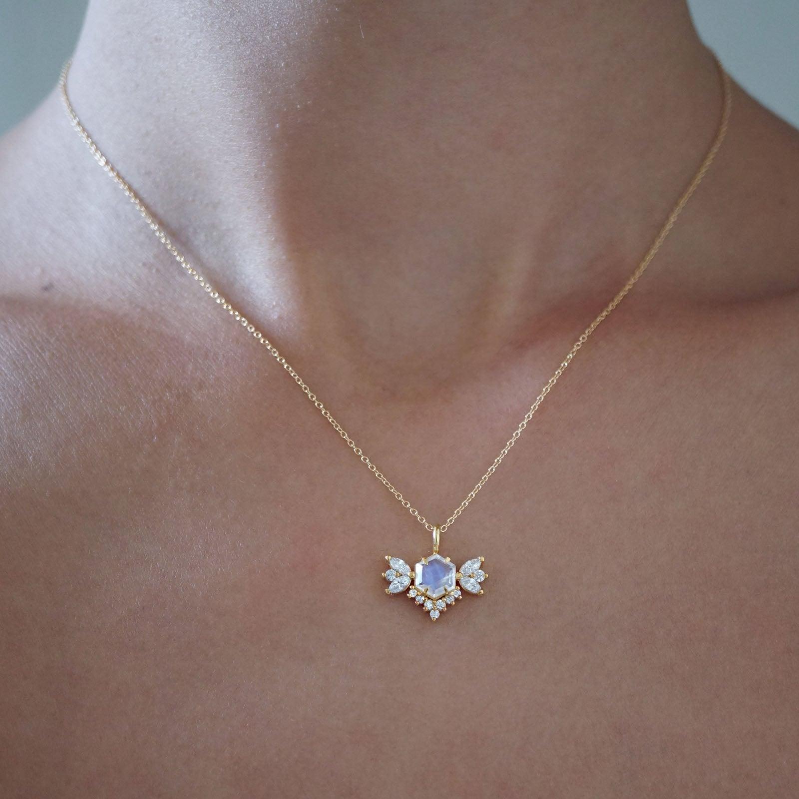 14K Hexagon Moonstone Butterfly Diamond Necklace