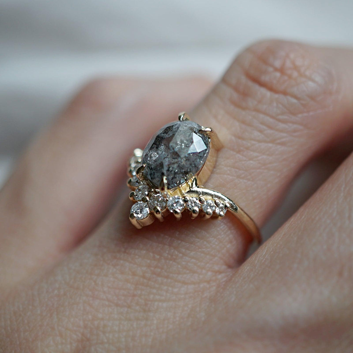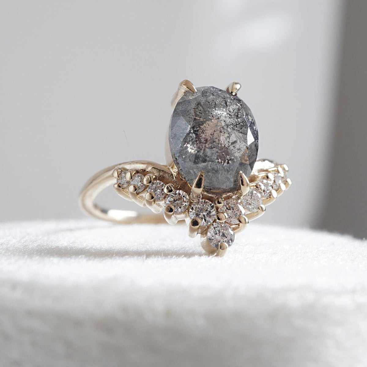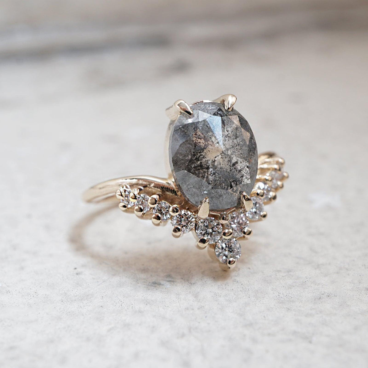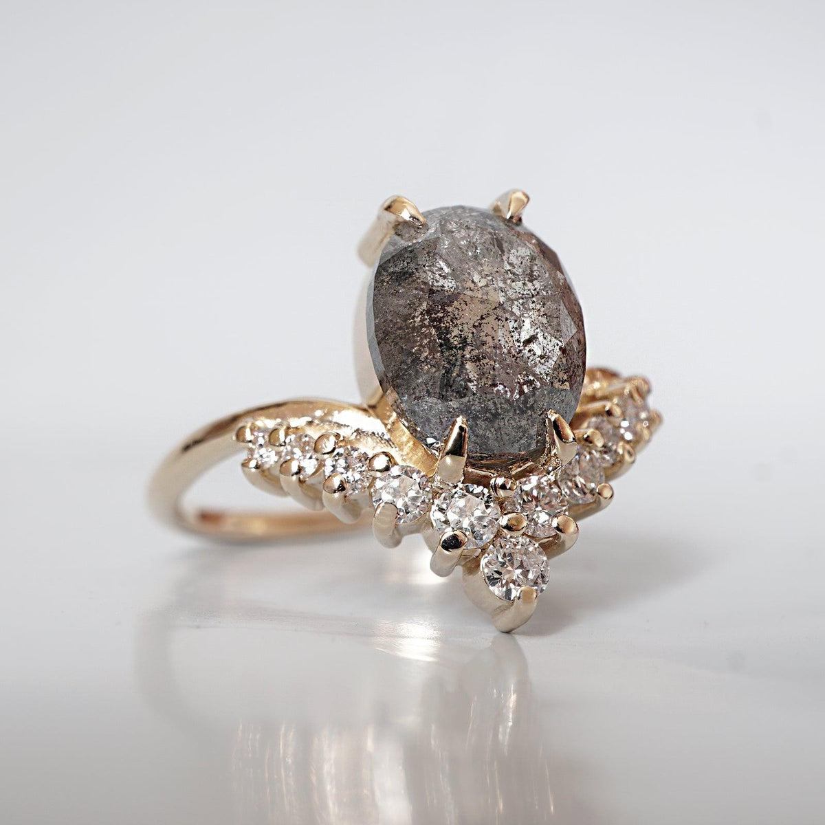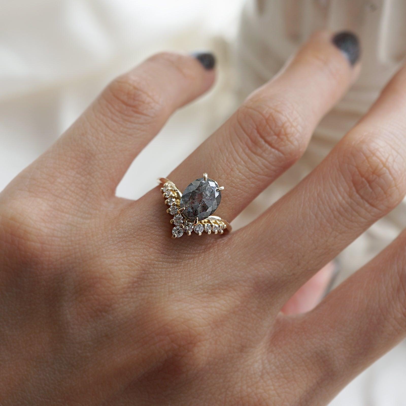 Our 14K All A Dream Salt & Pepper Diamond Ring is an exquisite ring made for the salt & pepper lovers. Stare into this magnificent stunner and you can see the whole galaxy in it. Featuring a 1.42 carat natural oval Salt & pepper diamond with natural white diamonds set on a rich 14k solid gold curve band. This ring is a limited edition, once it's gone, it's gone. Designed and made in NYC.
