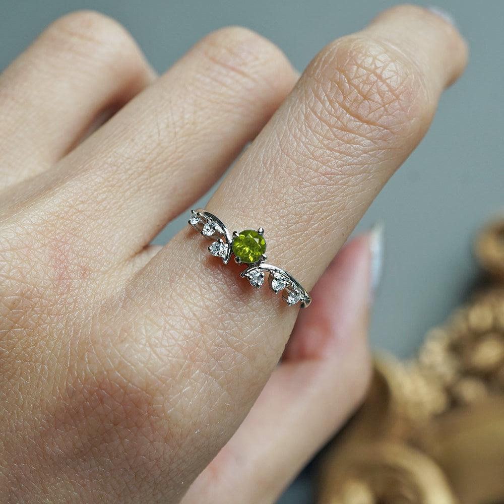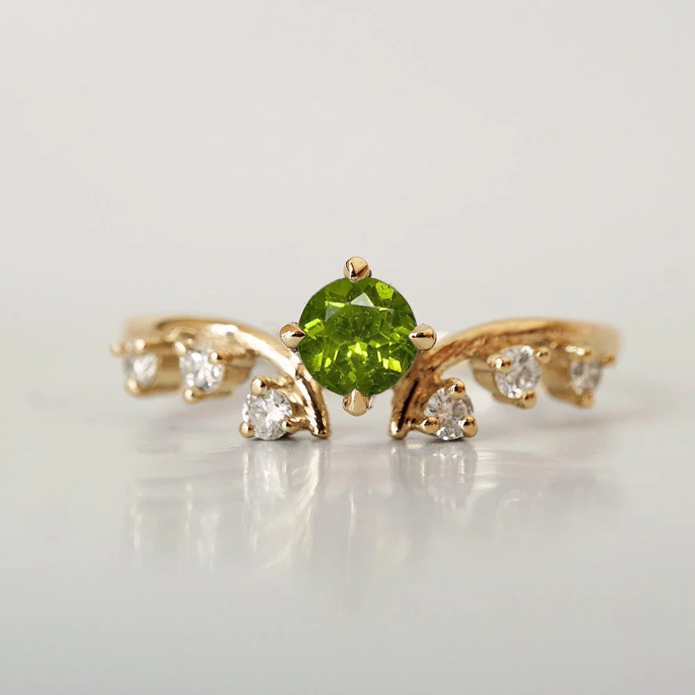 Set on a gently curved 14K solid gold band, this handcrafted piece embodies both strength and refinement. A perfect statement of quiet power and timeless beauty, the Maleficent Demantoid Garnet Diamond Ring is designed for those who embrace elegance with a hint of mystery.