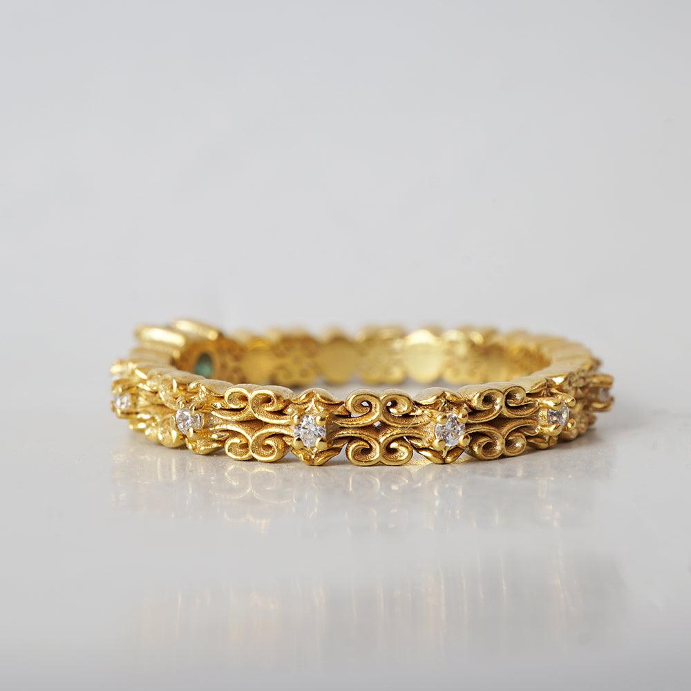 The band is crafted with intricate, architectural detailing that continues all the way around—an unbroken motif symbolizing eternity and enduring power. Each curve and edge is enriched with natural white diamonds, adding brilliance that enhances the ring’s bold, sculptural presence.