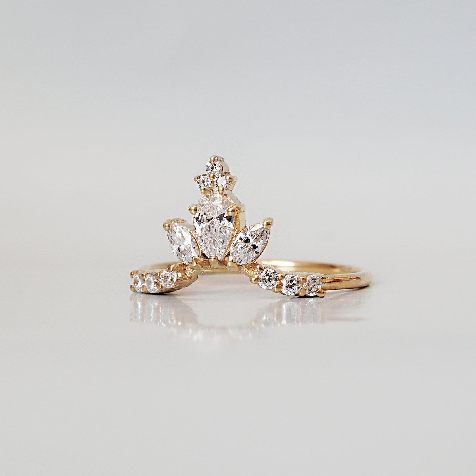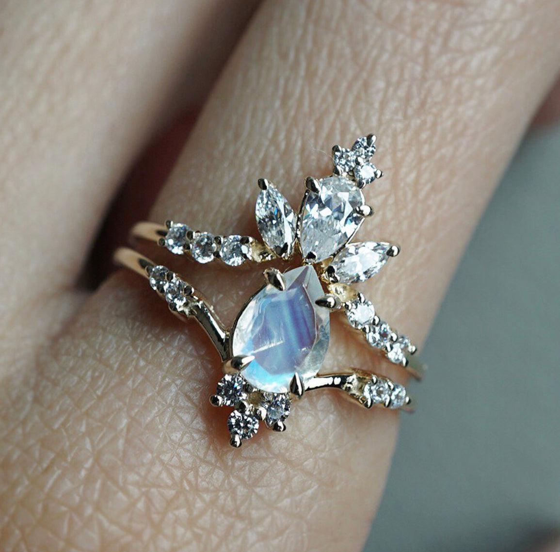 At its heart, the Moonstone Blossom Ring glows with an ethereal, natural moonstone — a gem that captures the light of dawn within its milky depths. Paired with the Venice Pear Marquise Ring Band, its soft shimmer is framed by a crown of brilliance and baroque allure.