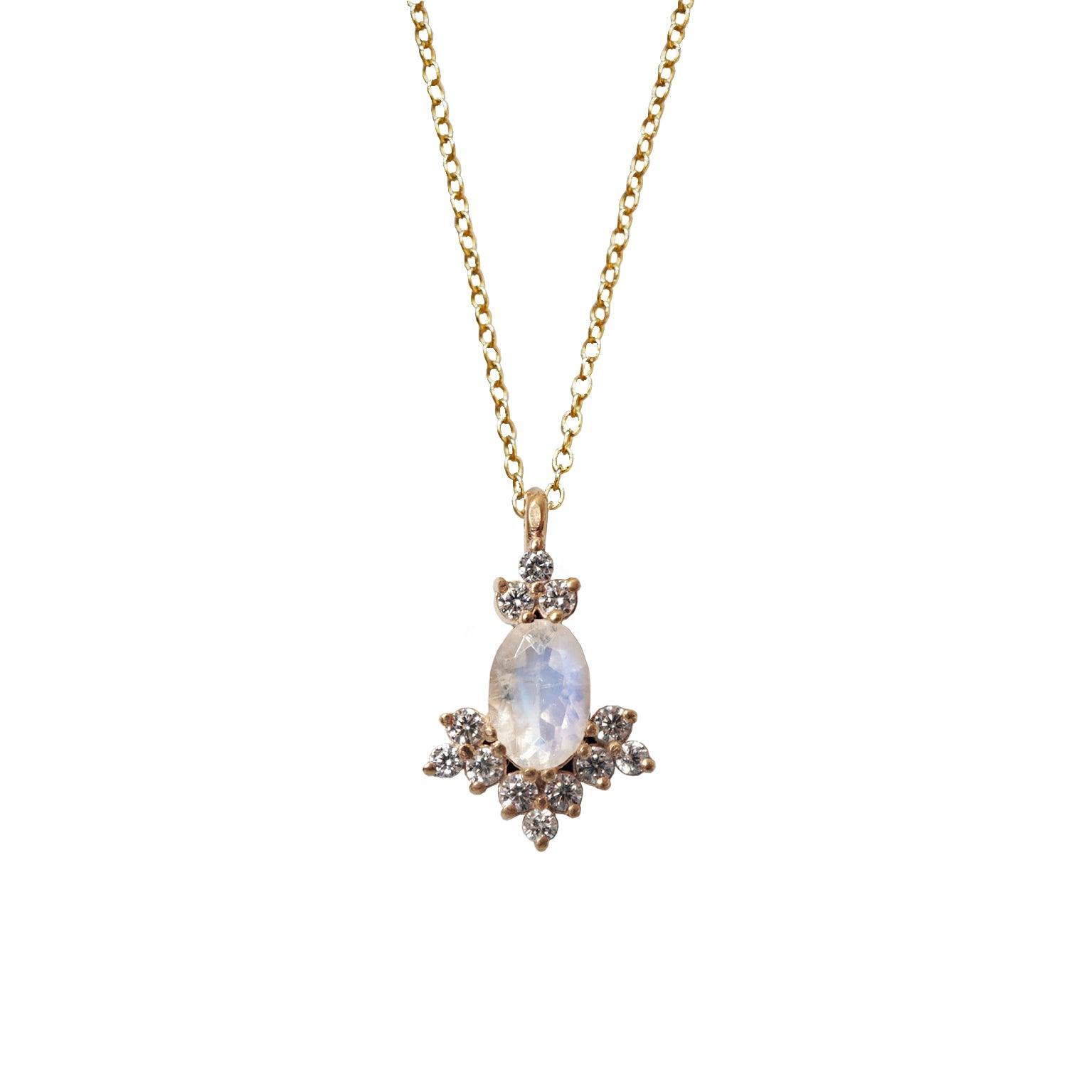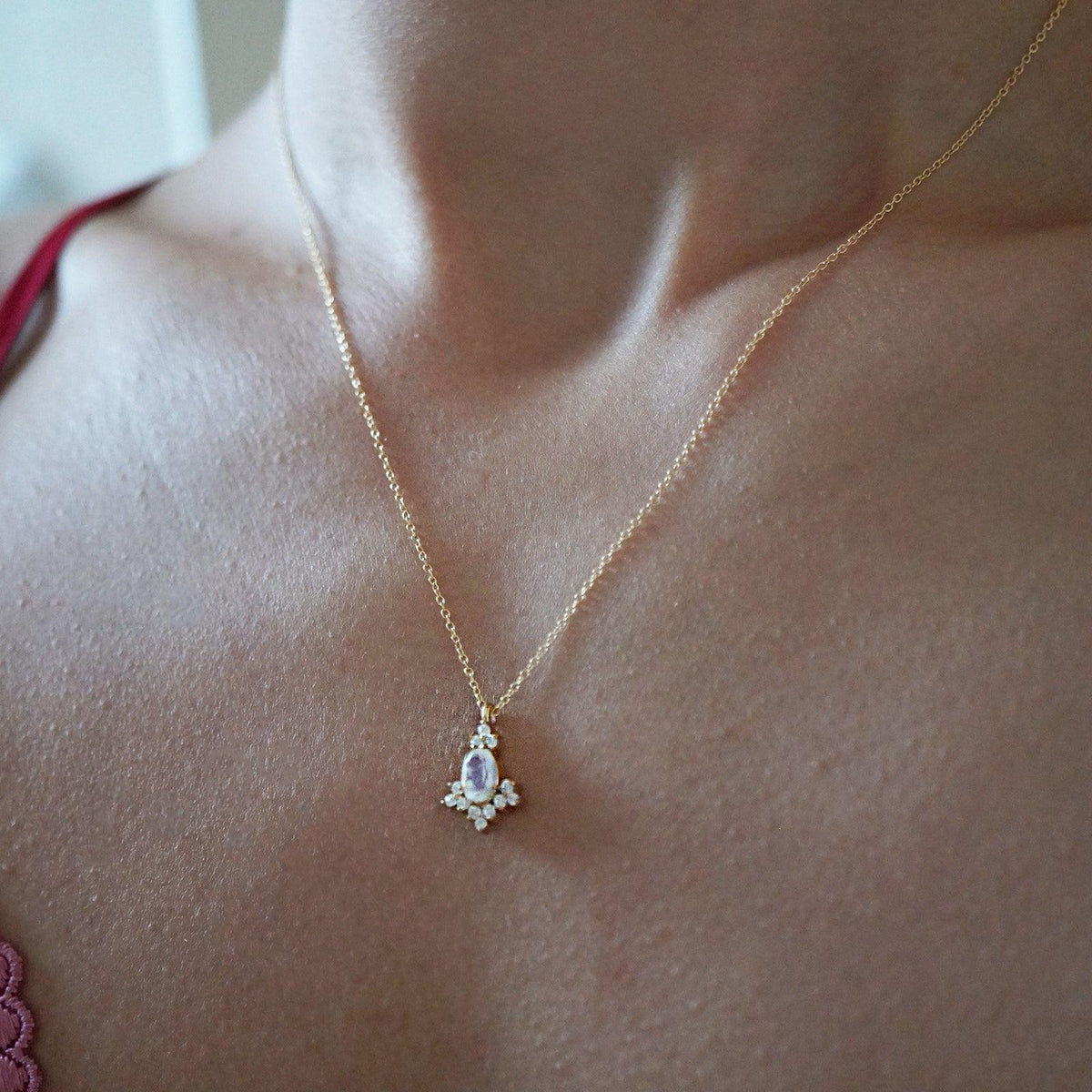 The Moonstone Shimmer Necklace captures the quiet radiance of moonlight in motion. A luminous natural moonstone shimmers with ethereal glow, framed by a halo of sparkling stones that glint softly with every turn.