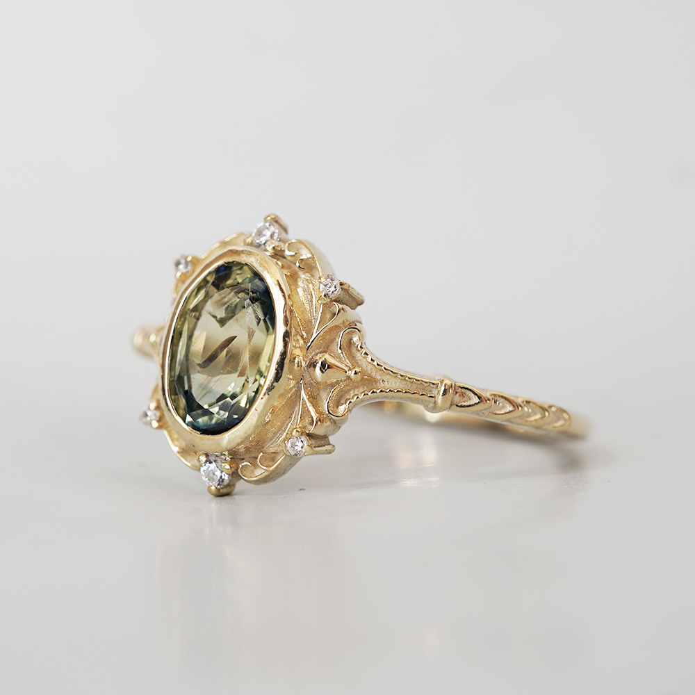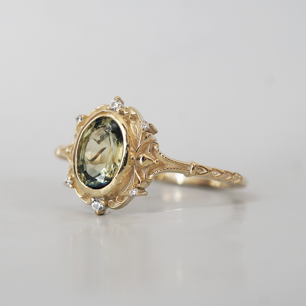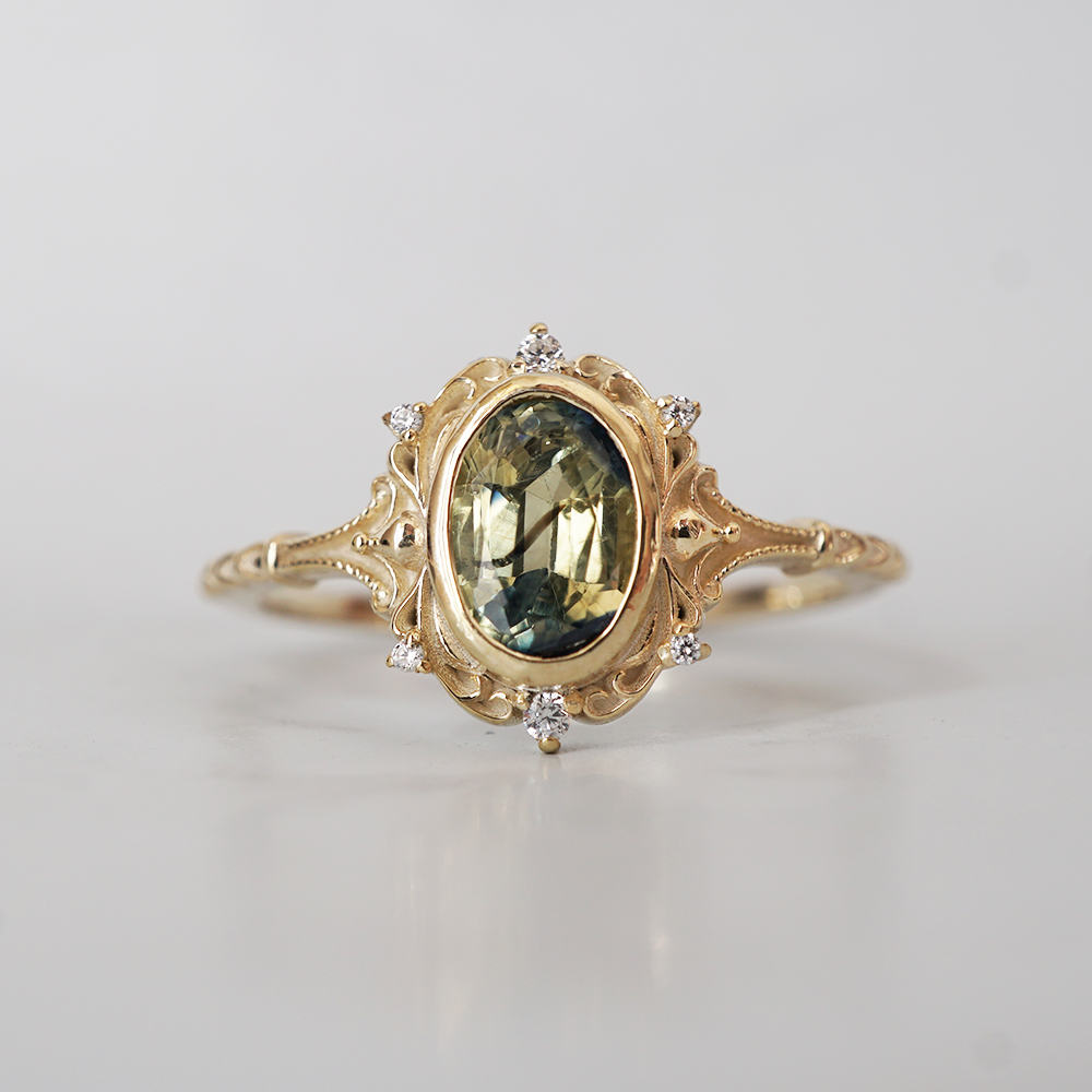 Ophelia is a quiet kind of opulence—timeless, romantic, and laced with detail. At its heart is a captivating bi-color sapphire, shifting between soft moss and golden light, like a forest kissed by sun. The ornate gold setting cradles the gem in delicate filigree, accented by tiny white diamonds that glimmer like morning dew. Elegant yet grounded, Ophelia feels like something passed down through generations—made to be cherished, made to be remembered.