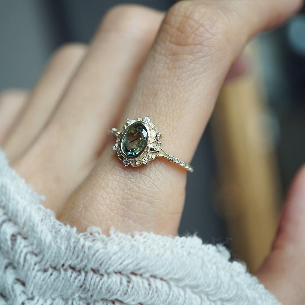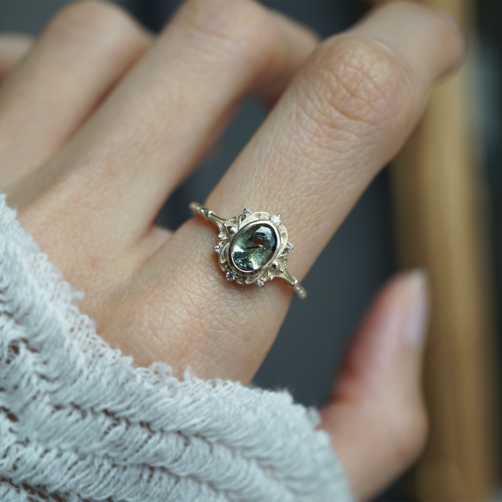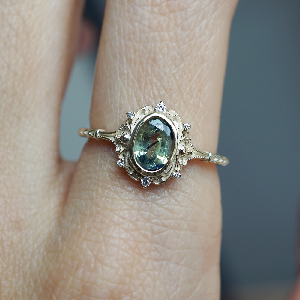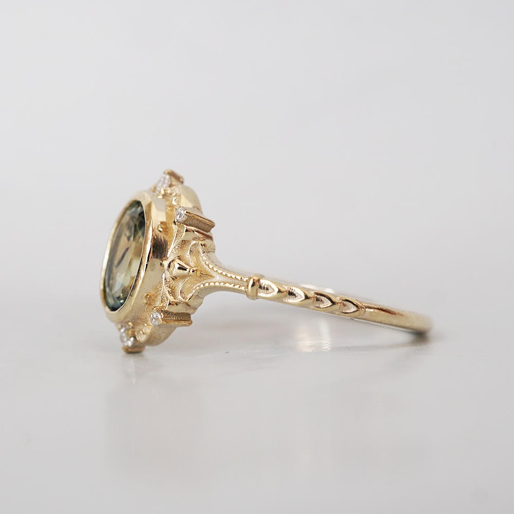 Ophelia is a quiet kind of opulence—timeless, romantic, and laced with detail. At its heart is a captivating bi-color sapphire, shifting between soft moss and golden light, like a forest kissed by sun. The ornate gold setting cradles the gem in delicate filigree, accented by tiny white diamonds that glimmer like morning dew. Elegant yet grounded, Ophelia feels like something passed down through generations—made to be cherished, made to be remembered.