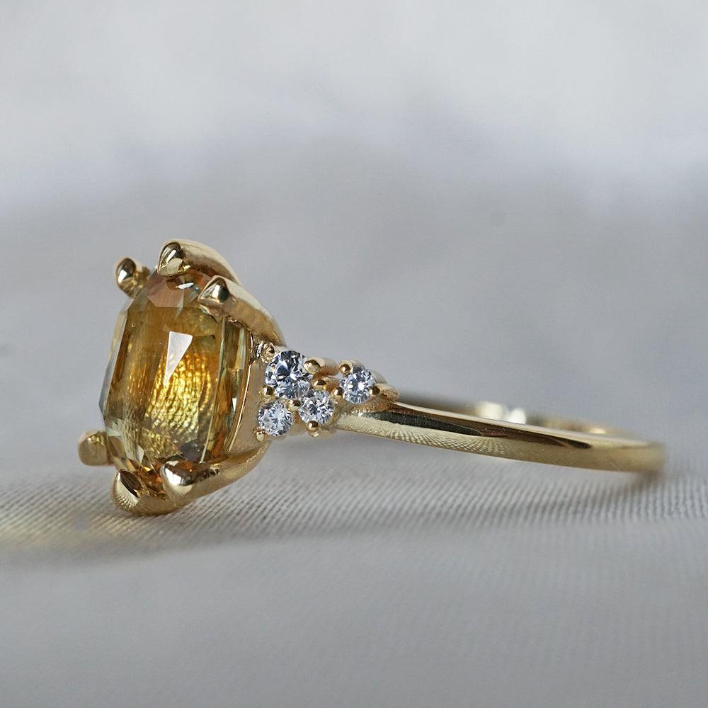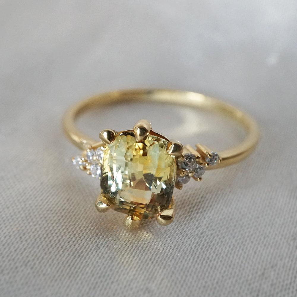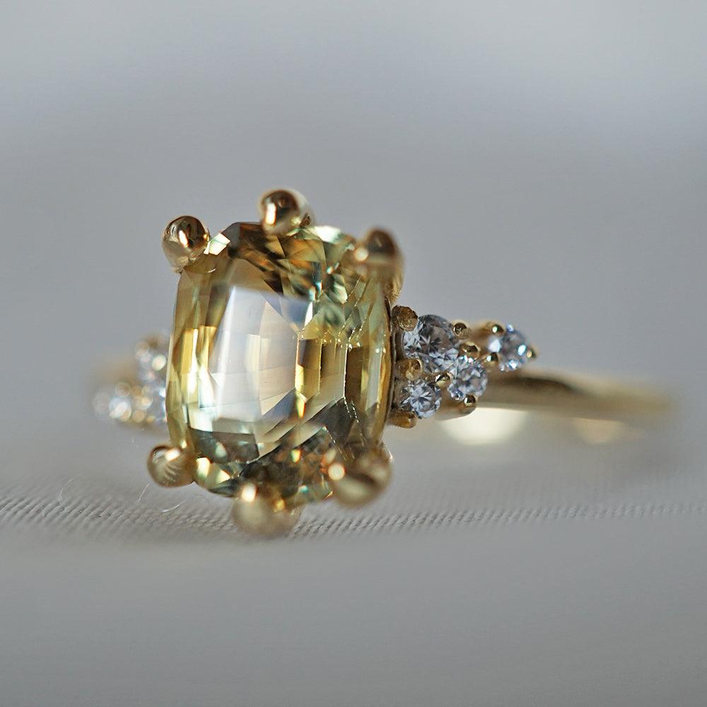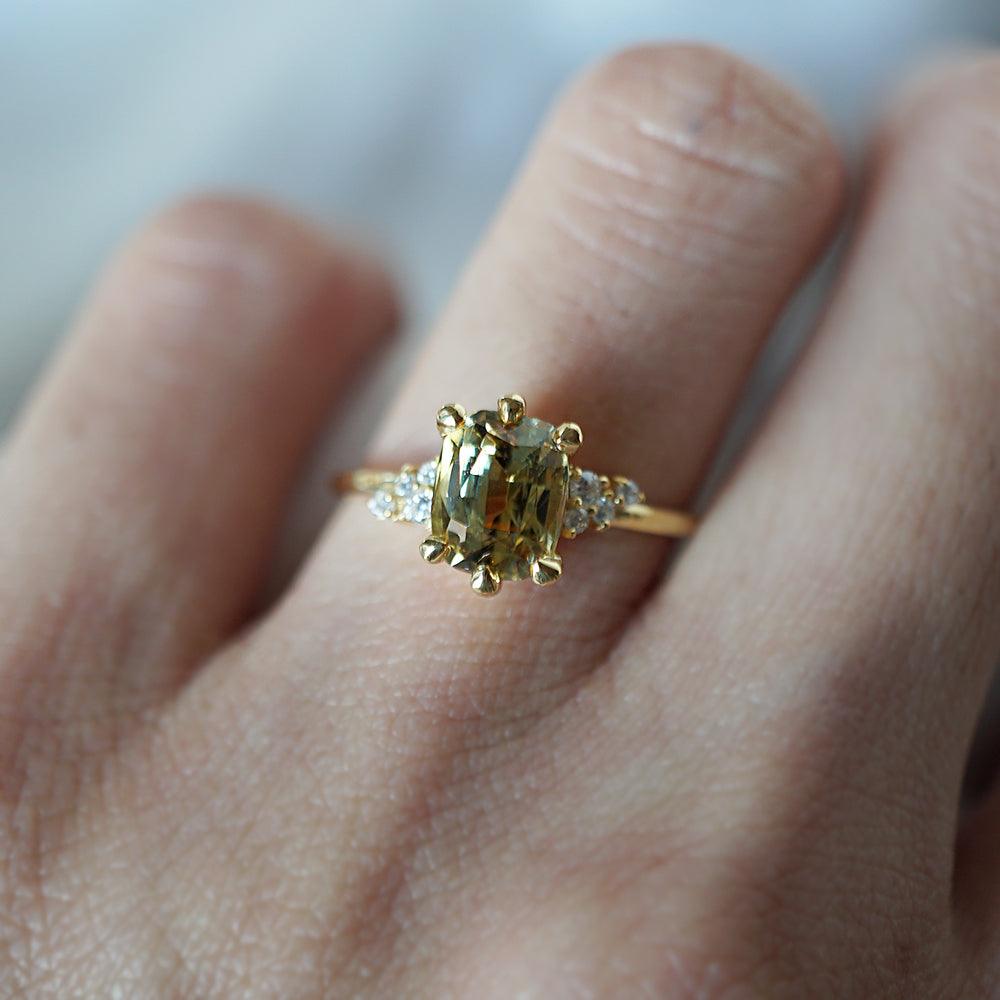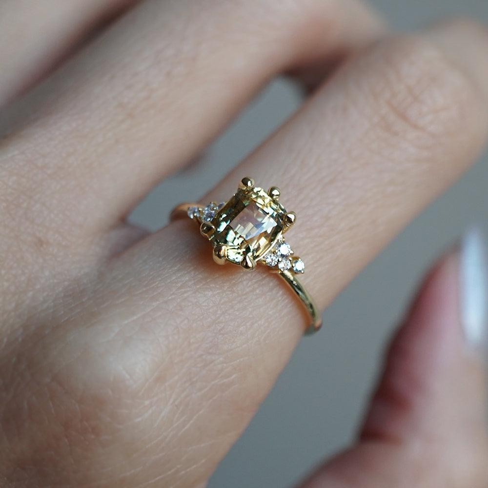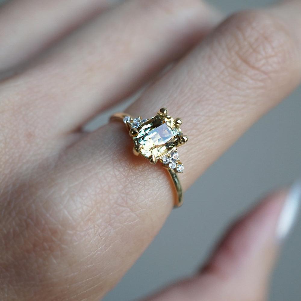 This dainty ring of your dream features a one-of-a-kind natural parti sapphire. With a yellowish-green natural sapphire surrounded by scattered natural round diamonds. A feminine ring for a classy babe. Handcrafted in your choice of 14K yellow gold, rose gold, or white gold. Only one available.